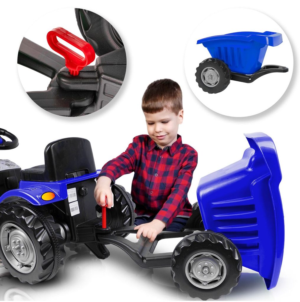 Dětský šlapací traktor s přívěsem je určen pro děti od 3 let a hmotnosti 30 kg. Pohon zajištuje řetěz. Traktůrek má otáčivá přední kola, která se ovládají pomocí volantu. Ve volantu je také umístěný klakson. Sedadlo je regulovatelné ve dvou pozicích. Je vyrobený z plastu a vyznačuje se velmi nízkou hmotností.