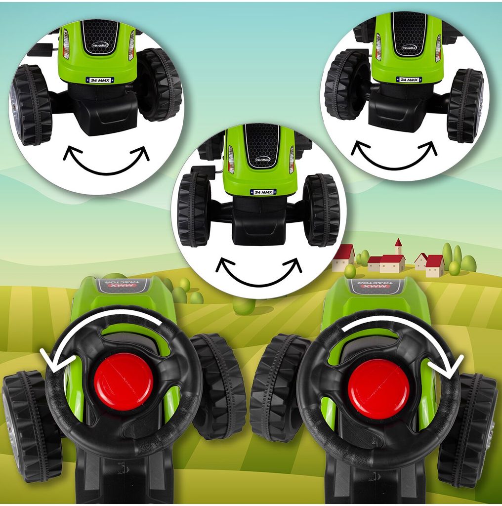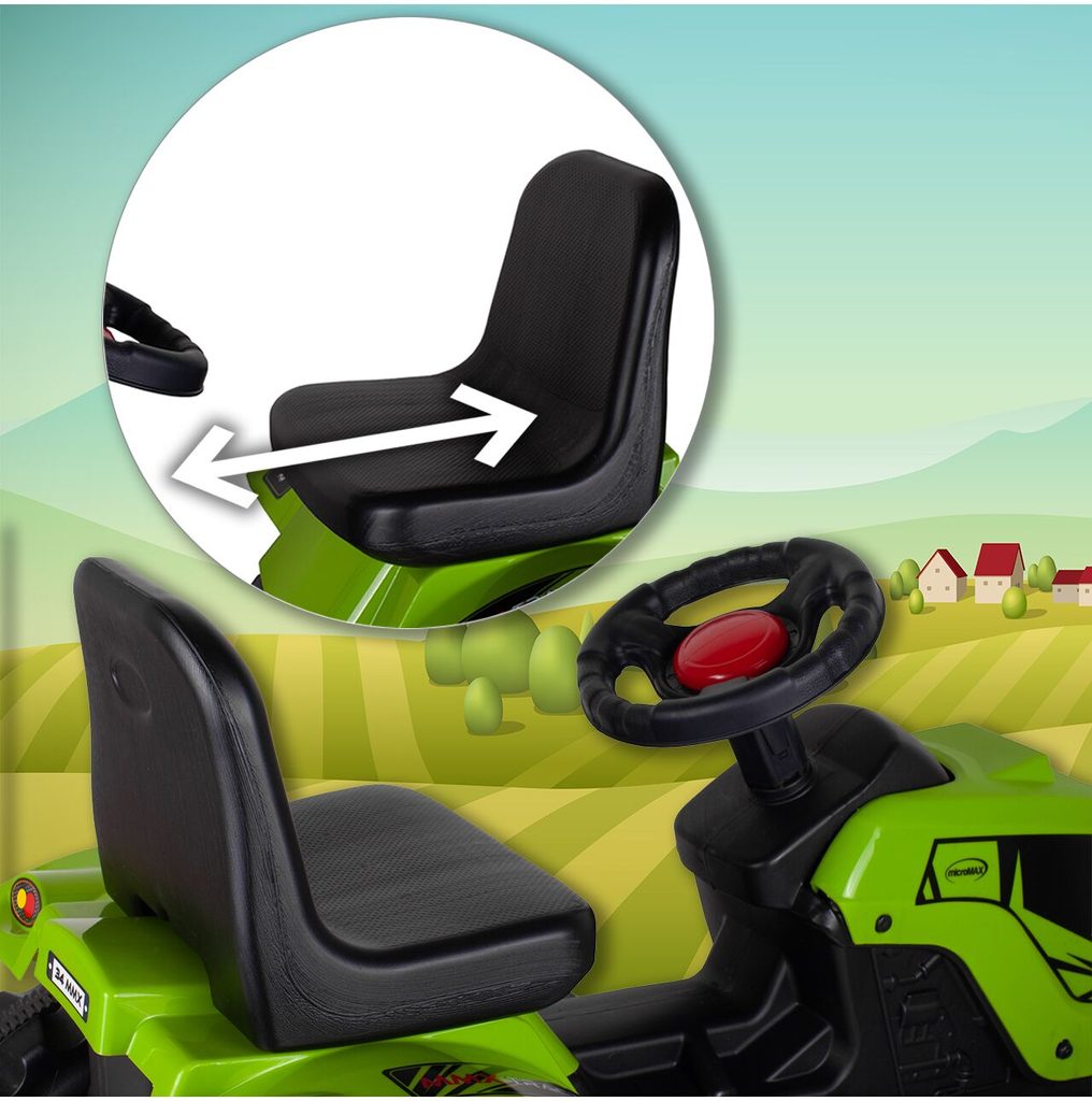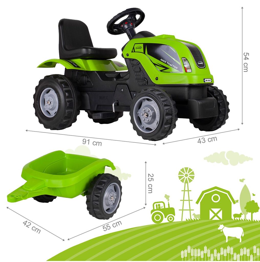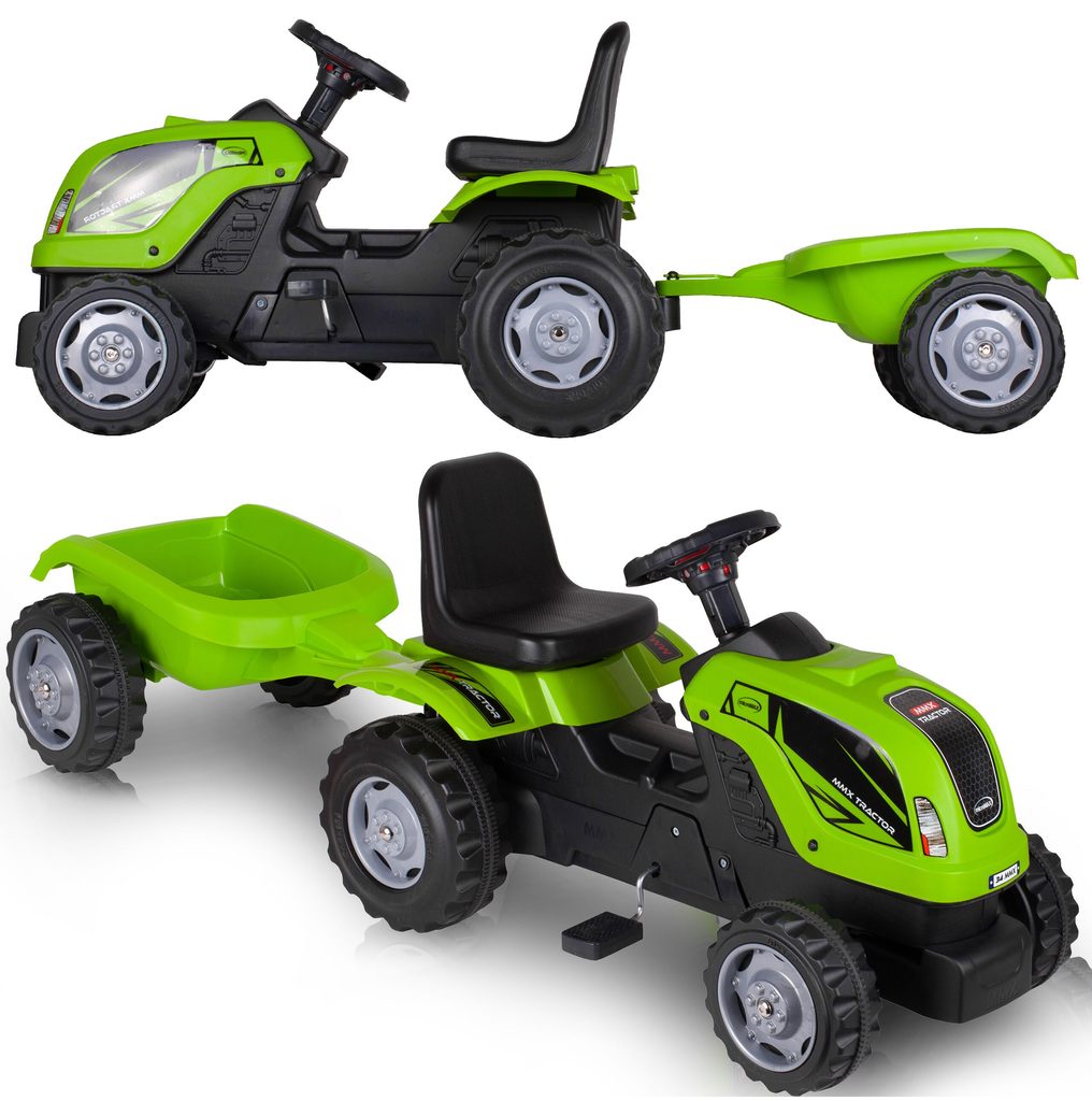 Dětský šlapací traktor s přívěsem je určen pro děti od 3 let a hmotnosti 30 kg. Pohon zajištuje řetěz. Traktůrek má otáčivá přední kola, která se ovládají pomocí volantu. Ve volantu je také umístěný klakson. Sedadlo je regulovatelné ve dvou pozicích. Je vyrobený z plastu a vyznačuje se velmi nízkou hmotností