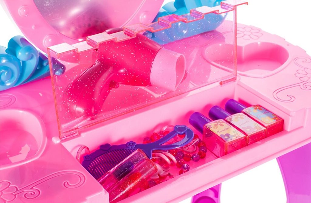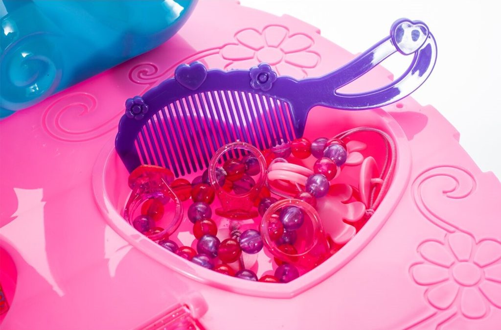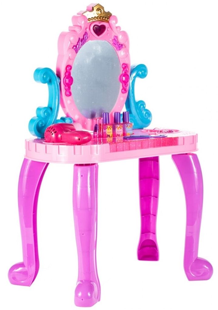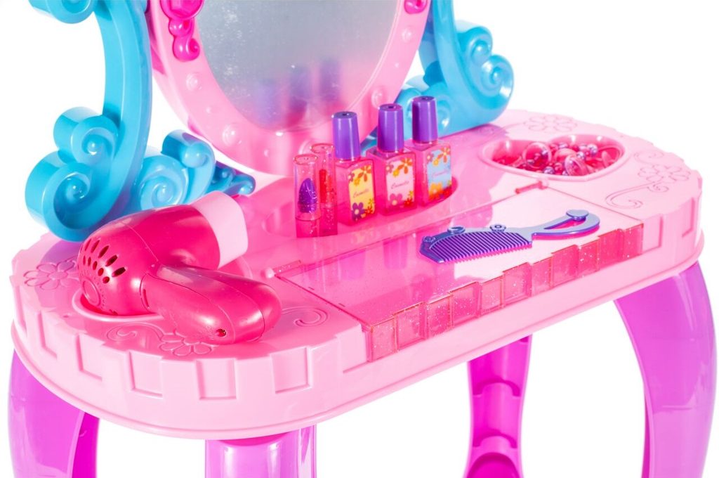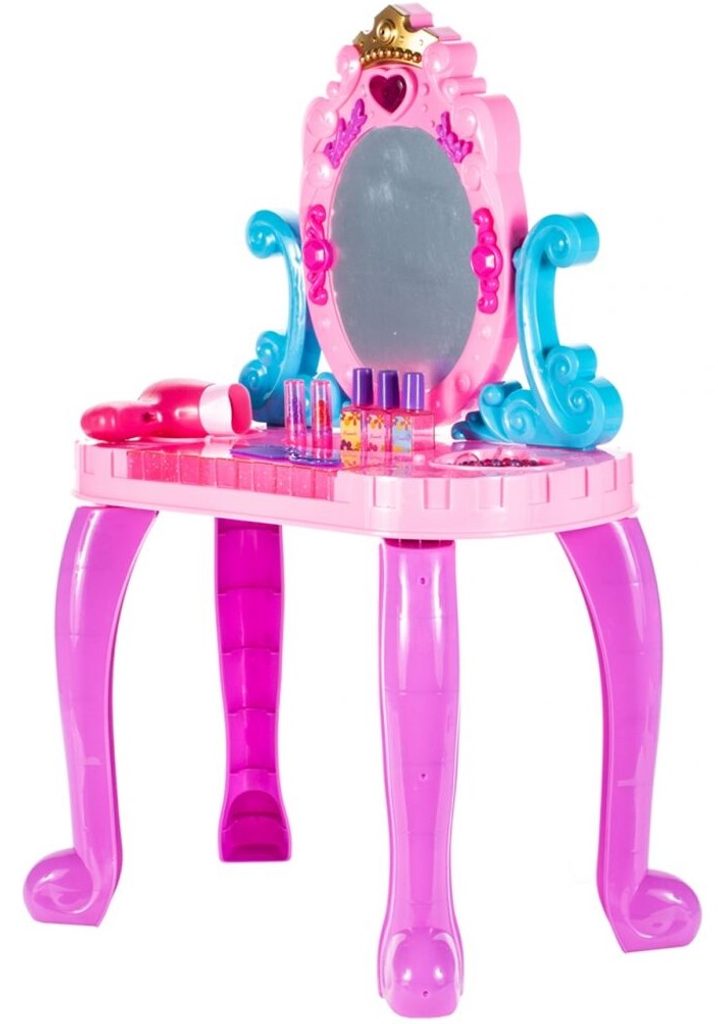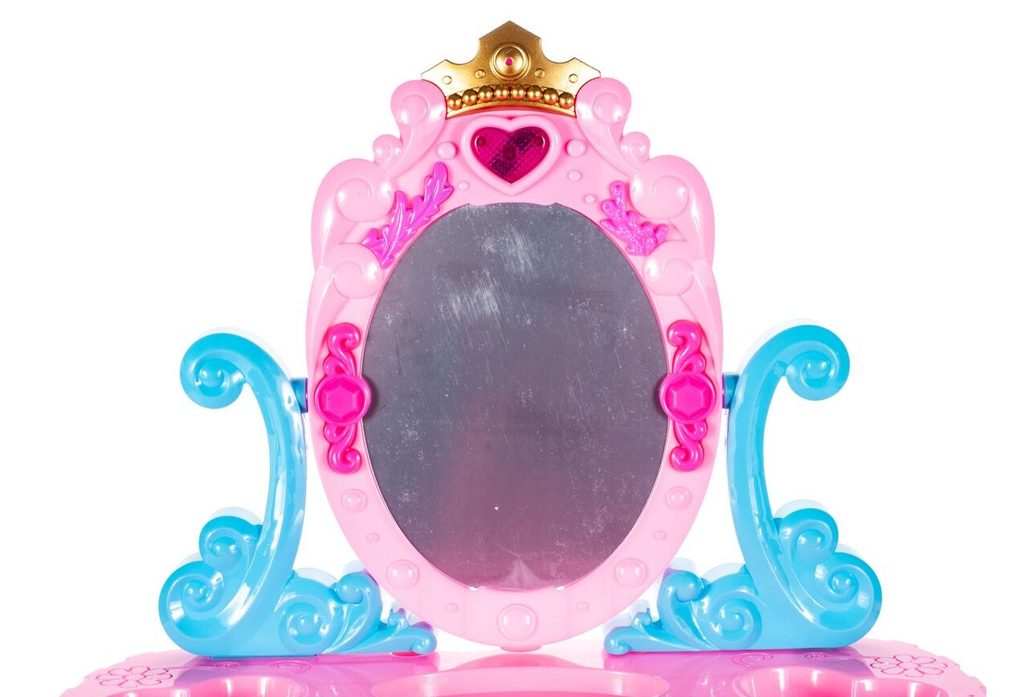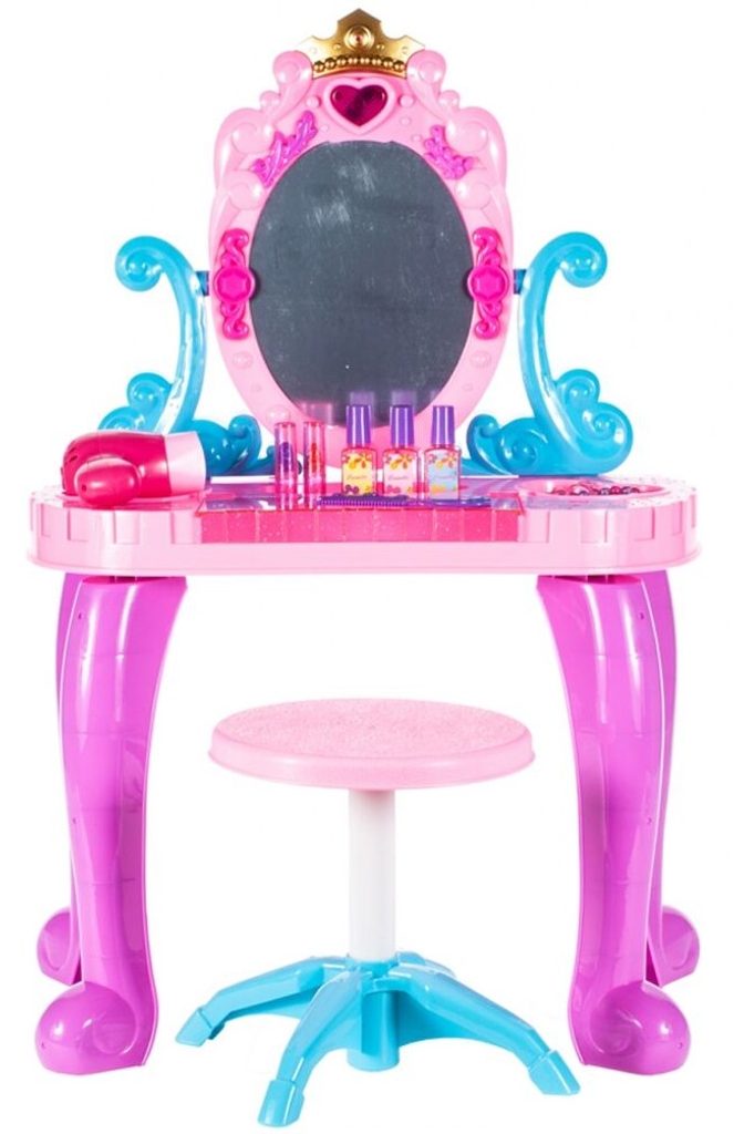 Toaletní stoleček Crown Vanity musí být součástí pokojíčku každé malé princezny. Je vybaven spoustou důležitých věcí pro každou malou parádnici. Set obsahuje imitace kosmetiky, hřeben, a další příslušenství. Ve stolku je také praktická přední otevírací část na drobnosti. Pro ještě větší zábavu vydává melodie zmáčknutím horního srdíčka. Fén na baterie fouká vzduch jako by byl skutečný. Hračka je určena pro děti od 36 měsíců věku.