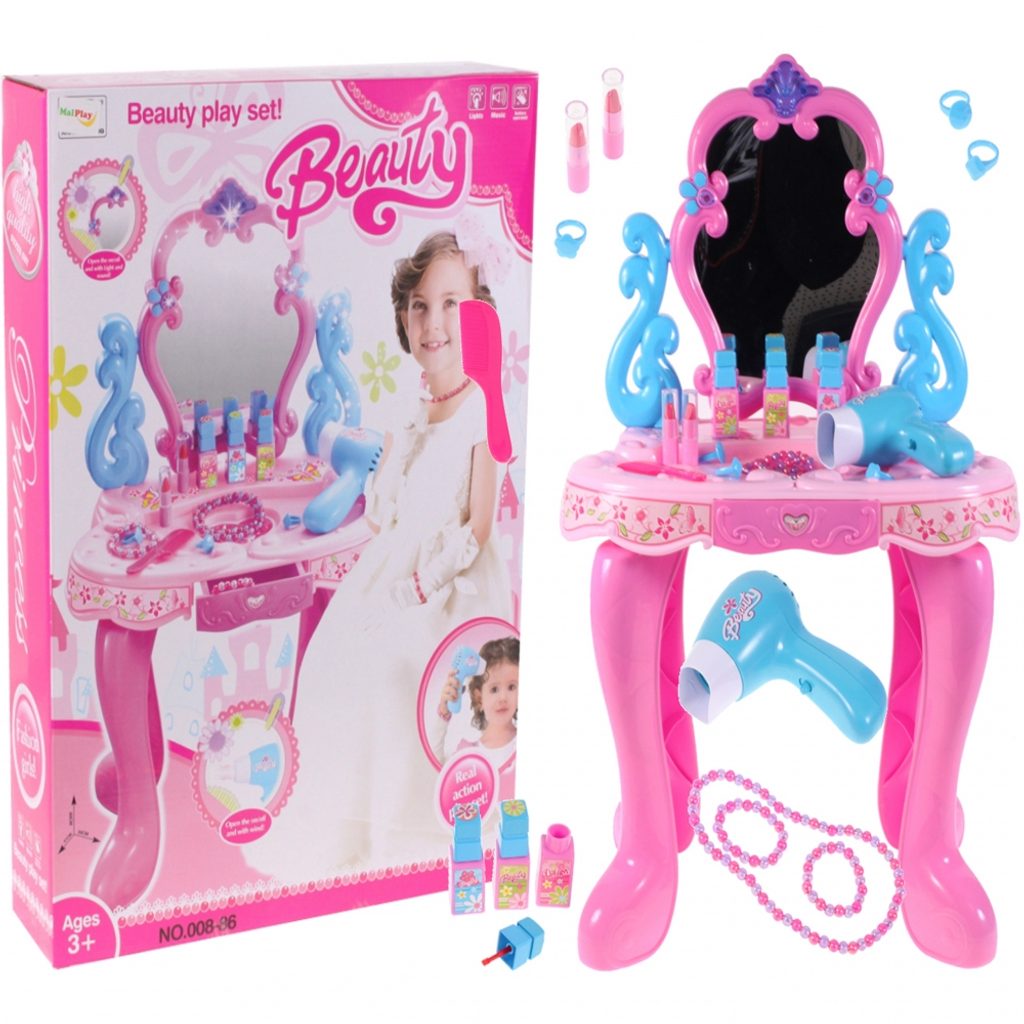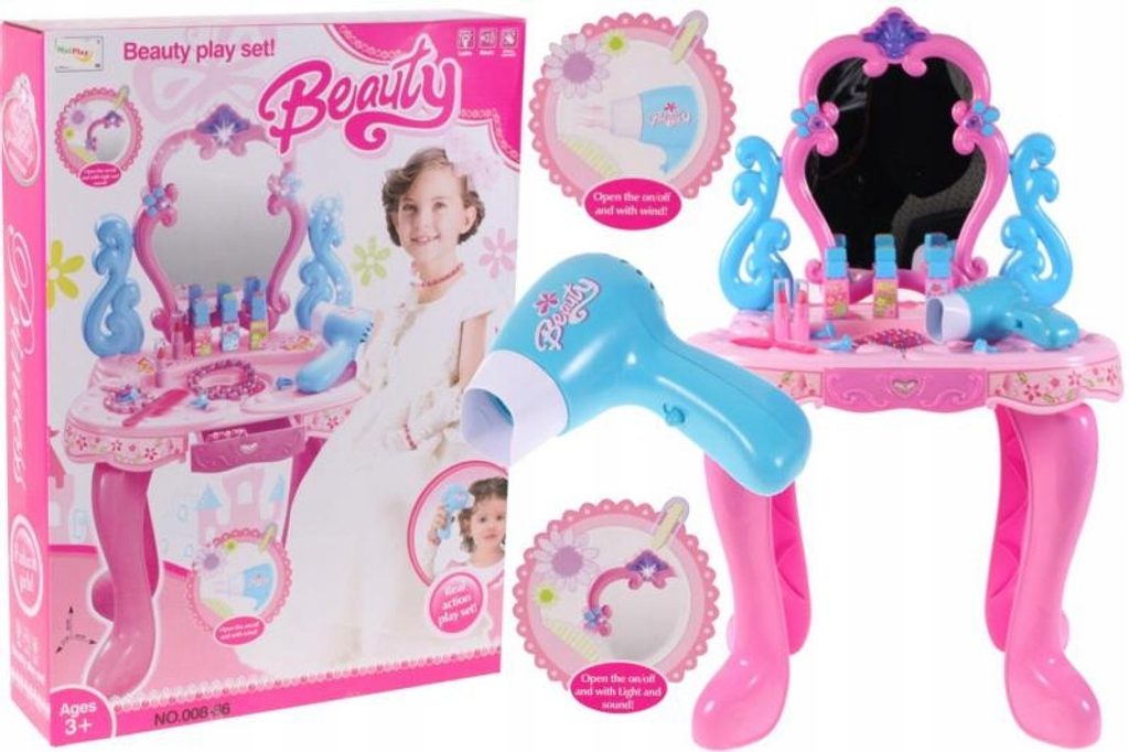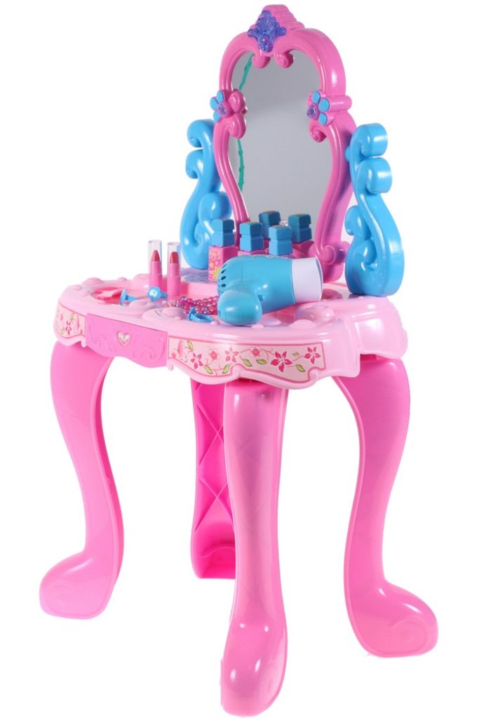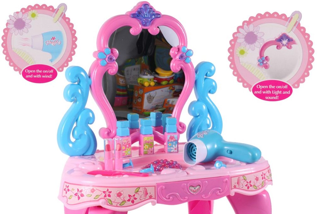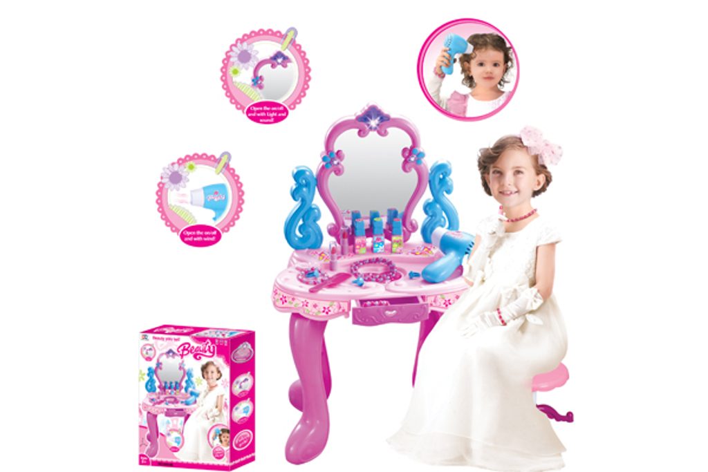 Toaletní stoleček Beauty Dresser musí být součástí pokojíčku každé malé princezny. Je vybaven spoustou důležitých věcí pro každou malou parádnici. Set obsahuje imitace kosmetiky, hřeben, náramky a další příslušenství. Ve stolku je také praktický šuplíček na drobnosti. Pro ještě větší zábavu má stoleček světelné efekty a vydává melodie. Fén na baterie fouká vzduch jako by byl skutečný. Hračka je určena pro děti od 36 měsíců věku.