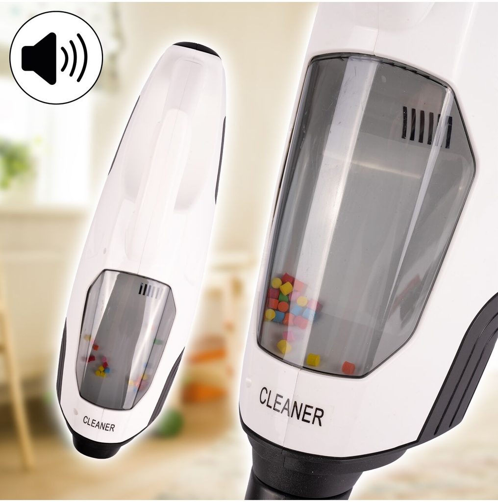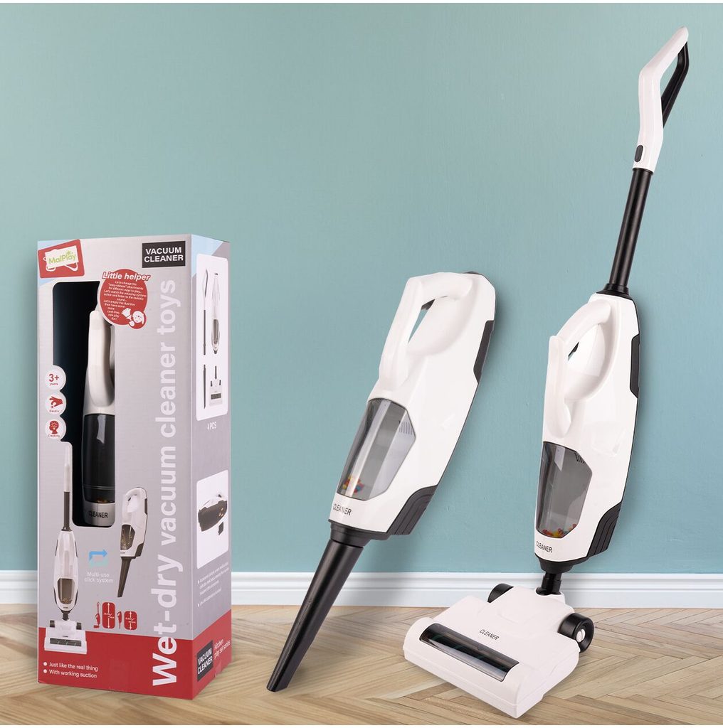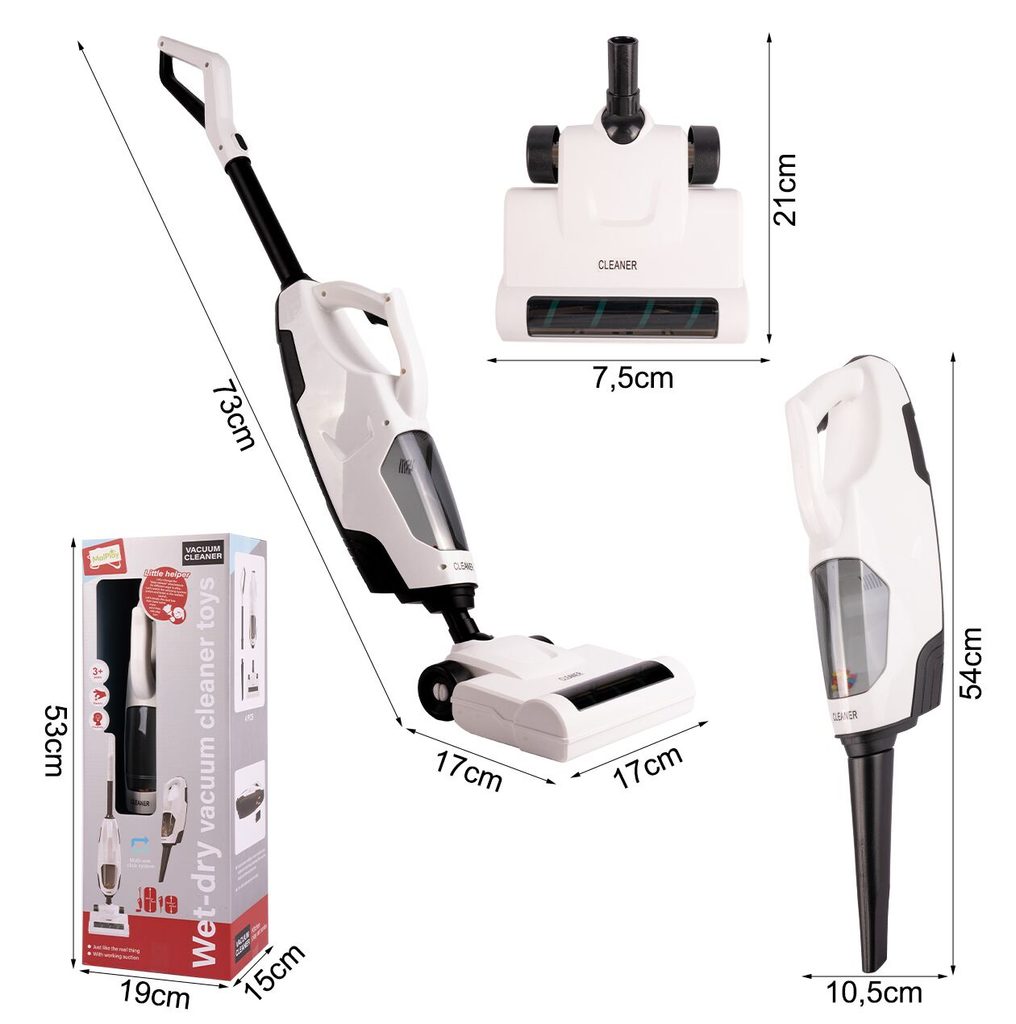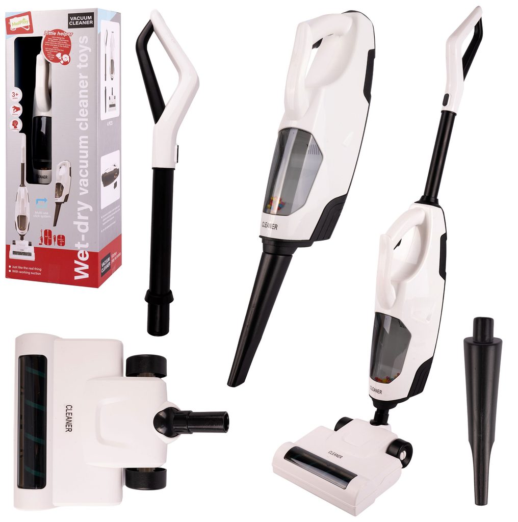 Dětský tyčový vysavač 2v1 Wet&Dry přemění Vaše dítě v opravdovou paní nebo pána domu a naučí ho pečovat o čistotu. Sada obsahuje větší podlahový a mnší ruční vysavač. Má nádobu na nečistoty. Vysavač vydává zvuky jako skutečný. Vysavač je napájen bateriemi, které nejsou součástí balení. Hračka je určena pro děti od 36 měsíců věku.
