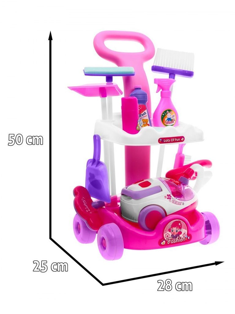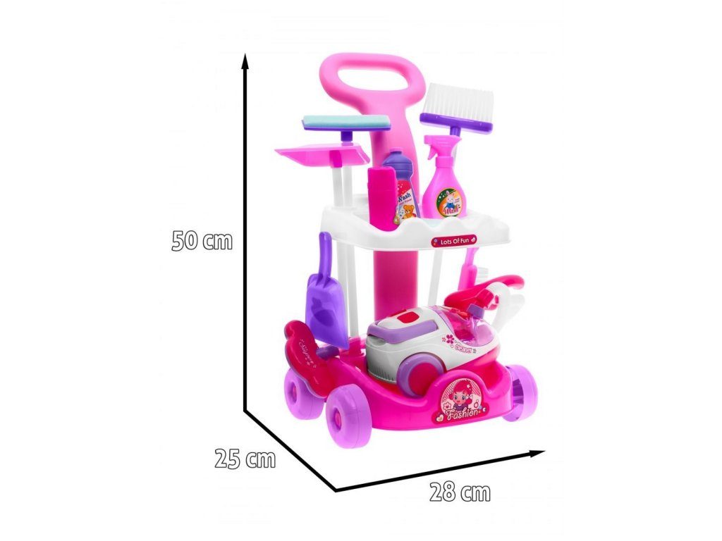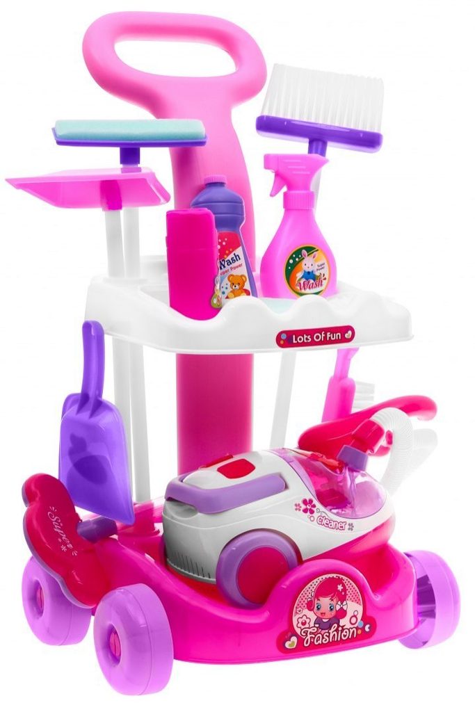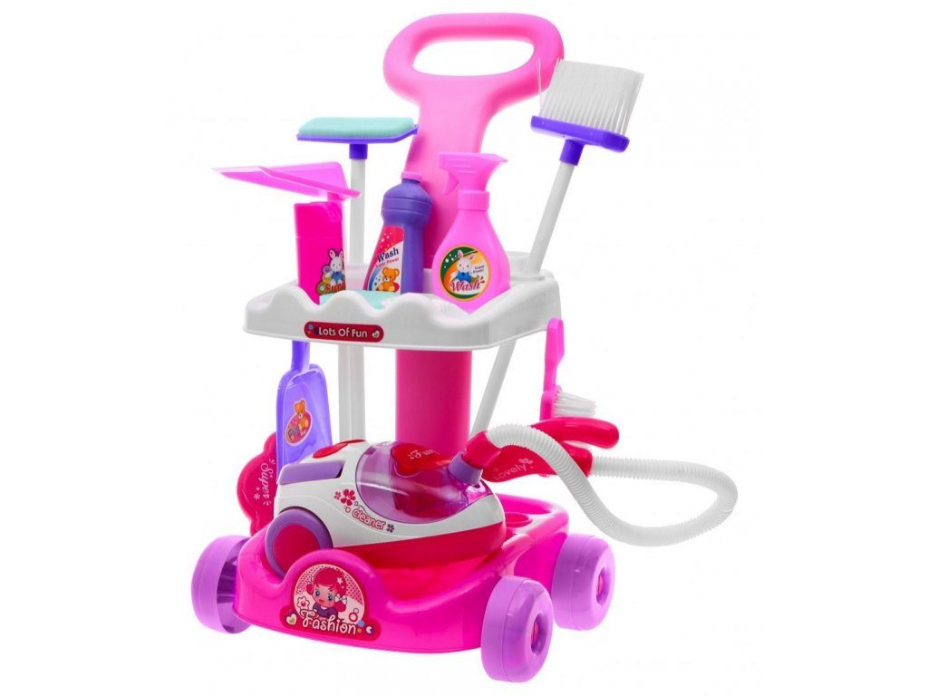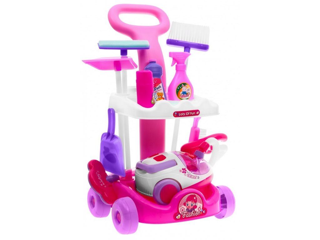 Kompletně vybavený dětský úklidový vozíček přemění Vaše dítě v opravdovou paní domu. Je vybaven dvěma policemi, velkým a malým smetákem, mopem, houbičkou na okna a dalšími nezbytnými věcmi pro úklid. Součástí vozíčku je vysavač na baterie, který vydává zvuky a světelné efekty. Pro co nejreálnější vysávání jsou v sestavě také malé kuličky ,které imitují smetí. Hračka je určena pro děti od 36 měsíců věku.