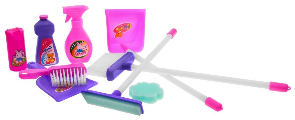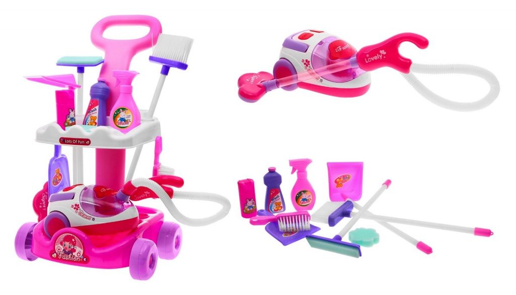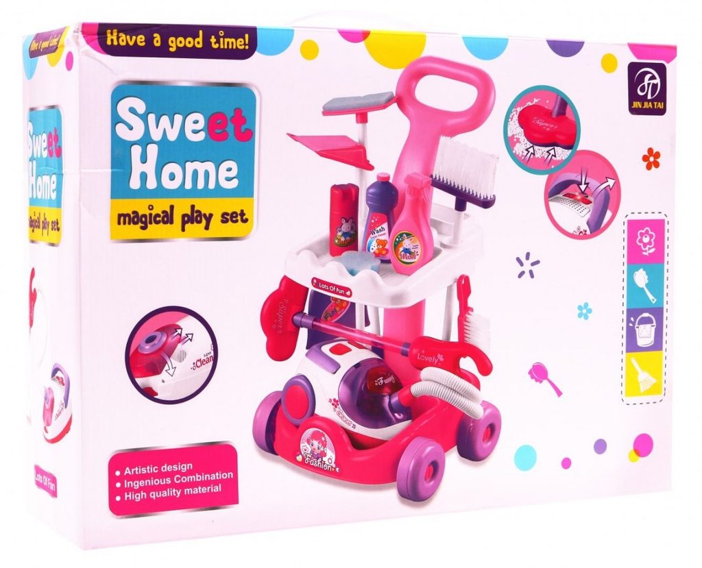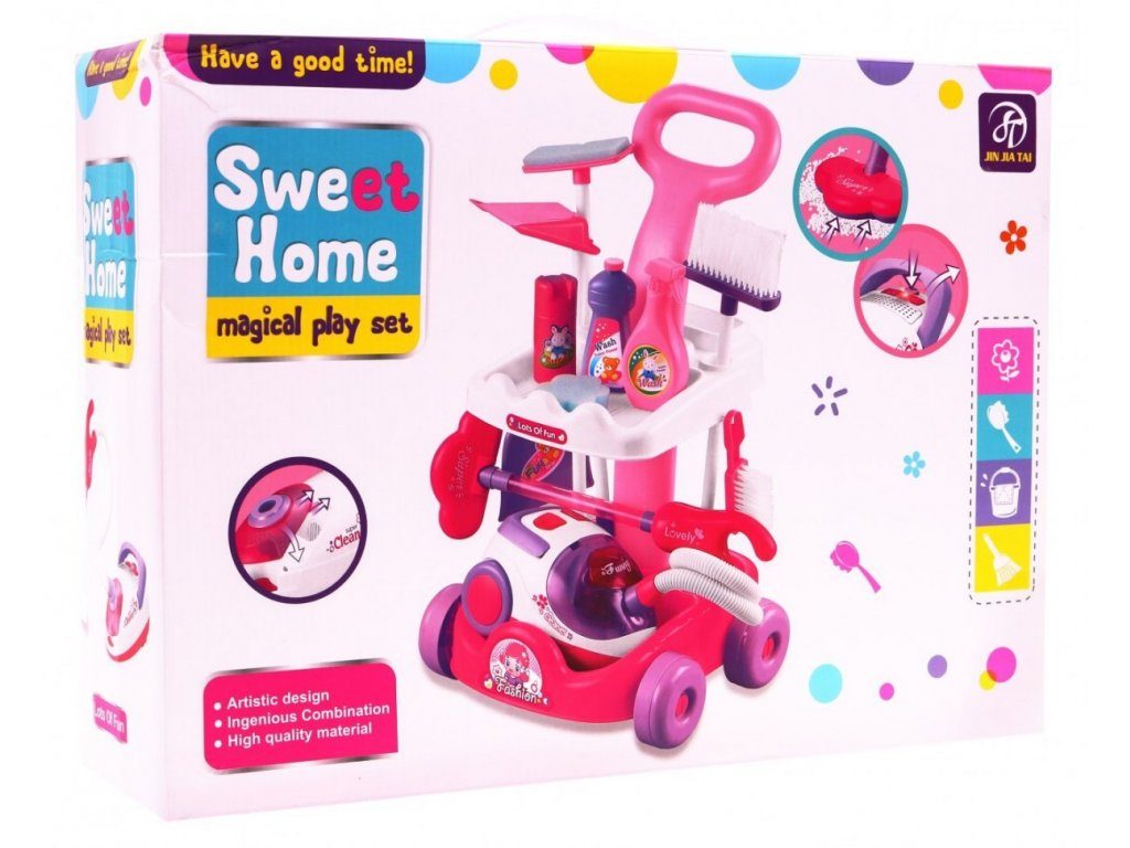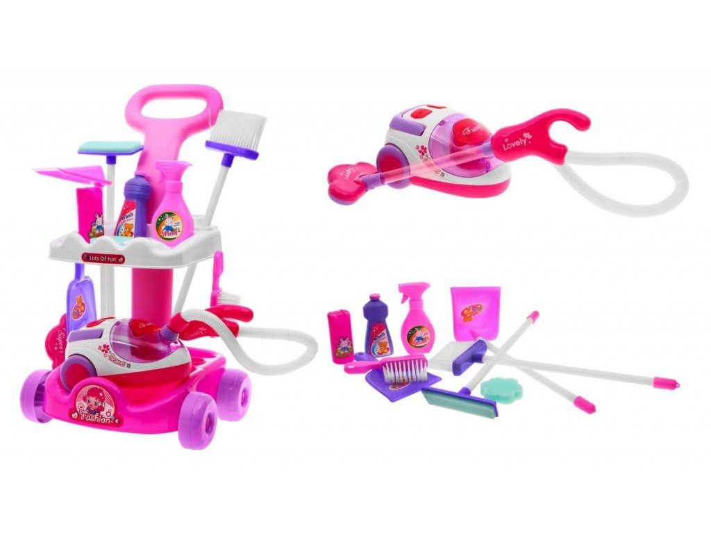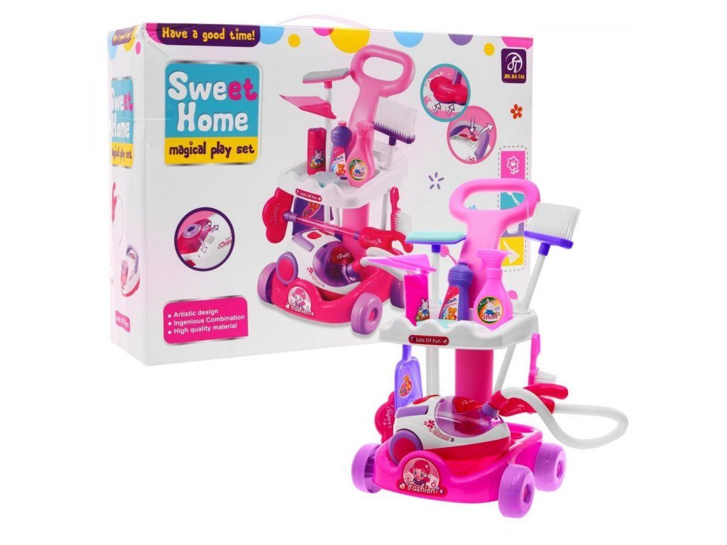 Kompletně vybavený dětský úklidový vozíček přemění Vaše dítě v opravdovou paní domu. Je vybaven dvěma policemi, velkým a malým smetákem, mopem, houbičkou na okna a dalšími nezbytnými věcmi pro úklid. Součástí vozíčku je vysavač na baterie, který vydává zvuky a světelné efekty. Pro co nejreálnější vysávání jsou v sestavě také malé kuličky ,které imitují smetí. Hračka je určena pro děti od 36 měsíců věku.