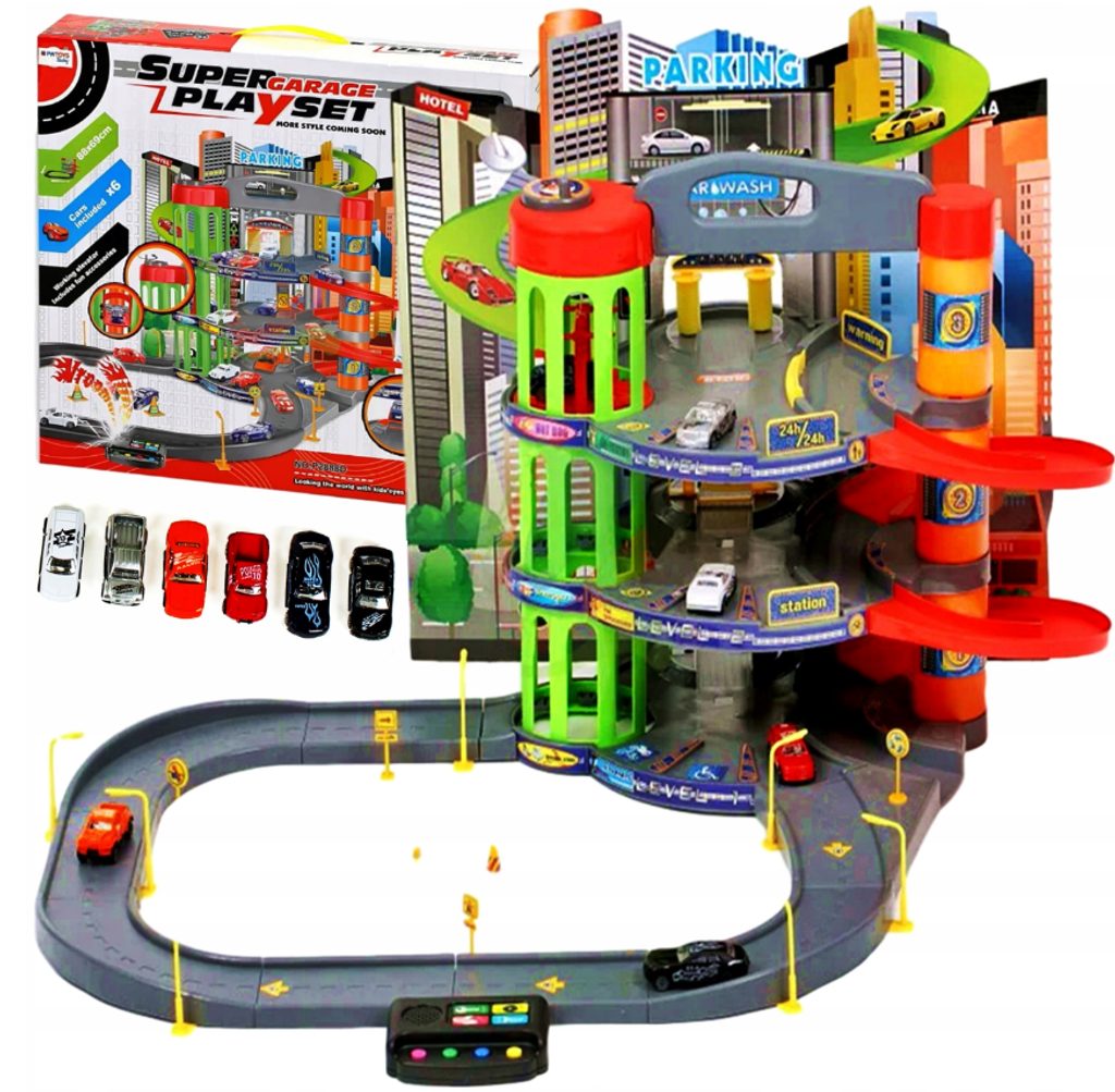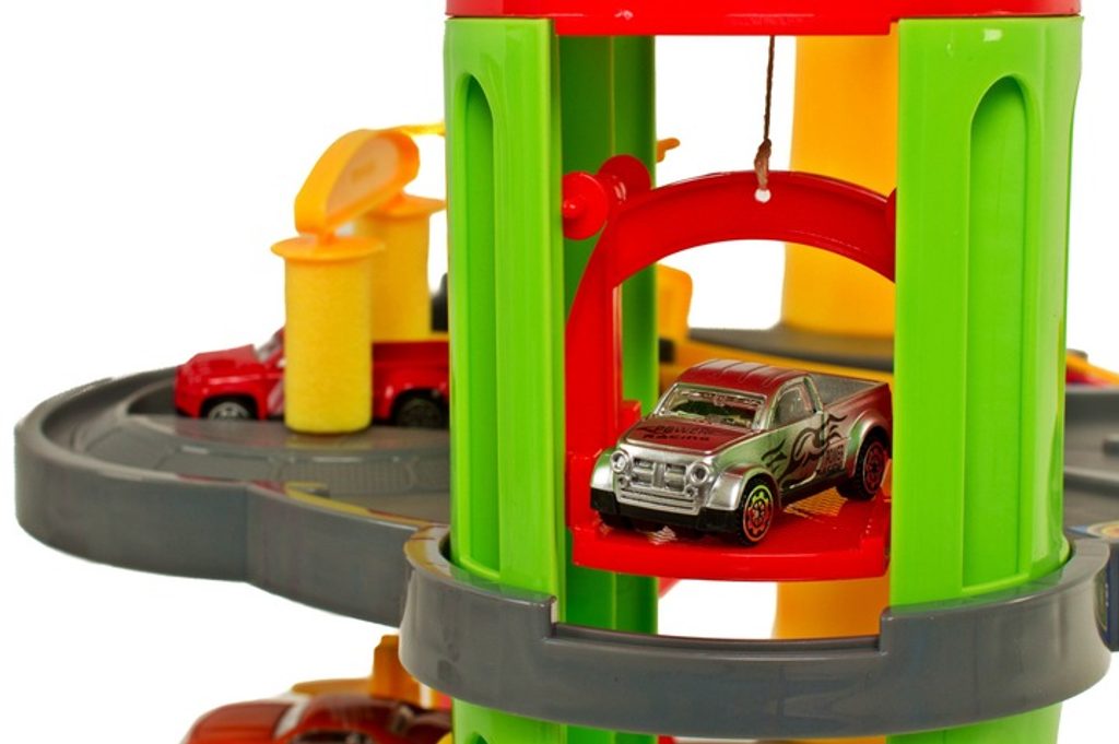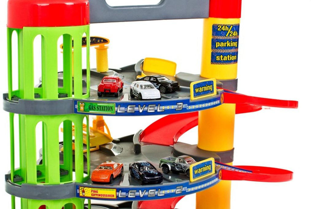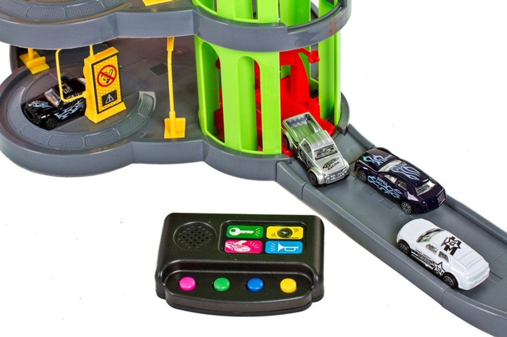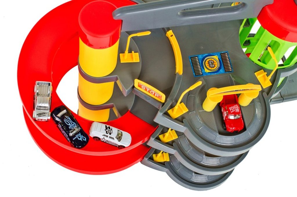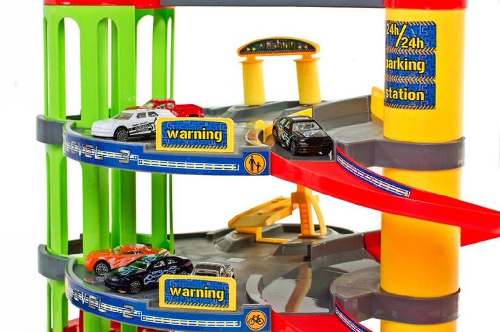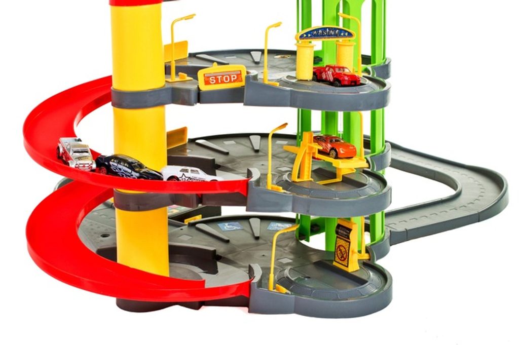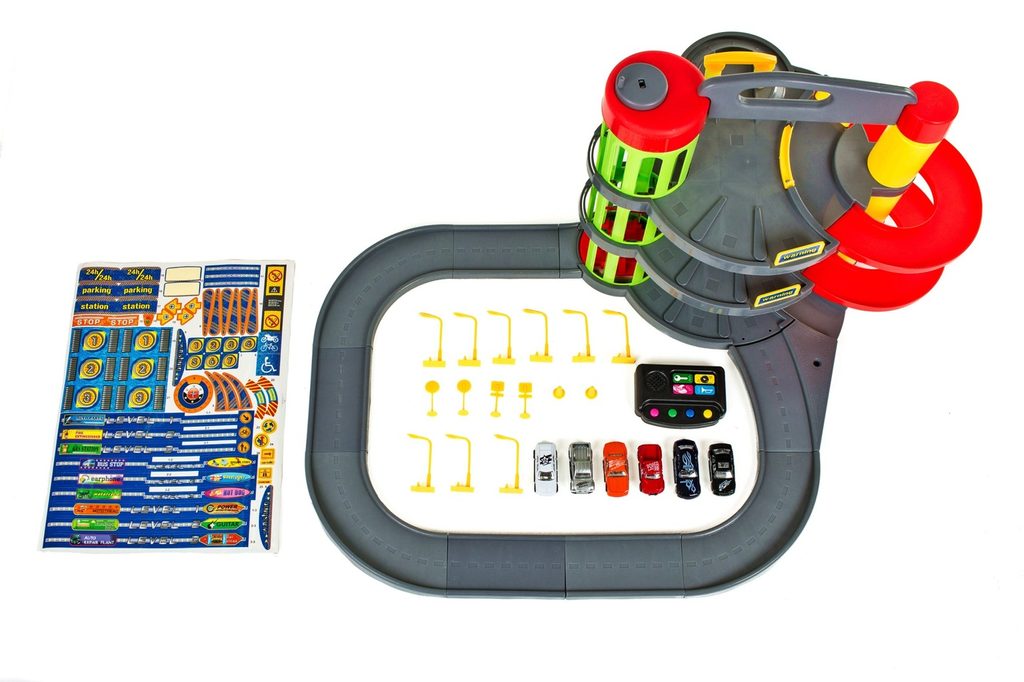 Dětská parkovací garáž s elektronickým modulem . Na parkovišti je pohyblivý výtah, který umožňuje přesouvat autíčka mezi jednotlivými patry. Souprava obsahuje mnoho pohyblivých částí a veškerého příslušenství potřebného k obsluze vozů během závodů, což zaručuje velkou zábavu. Je vybavena všemi potřebami mladého nadšence motoristů. Patrovou garáž lze kdykoli přenést na jiné místo, k tomu slouží speciální úchytka v horní části konstrukce.