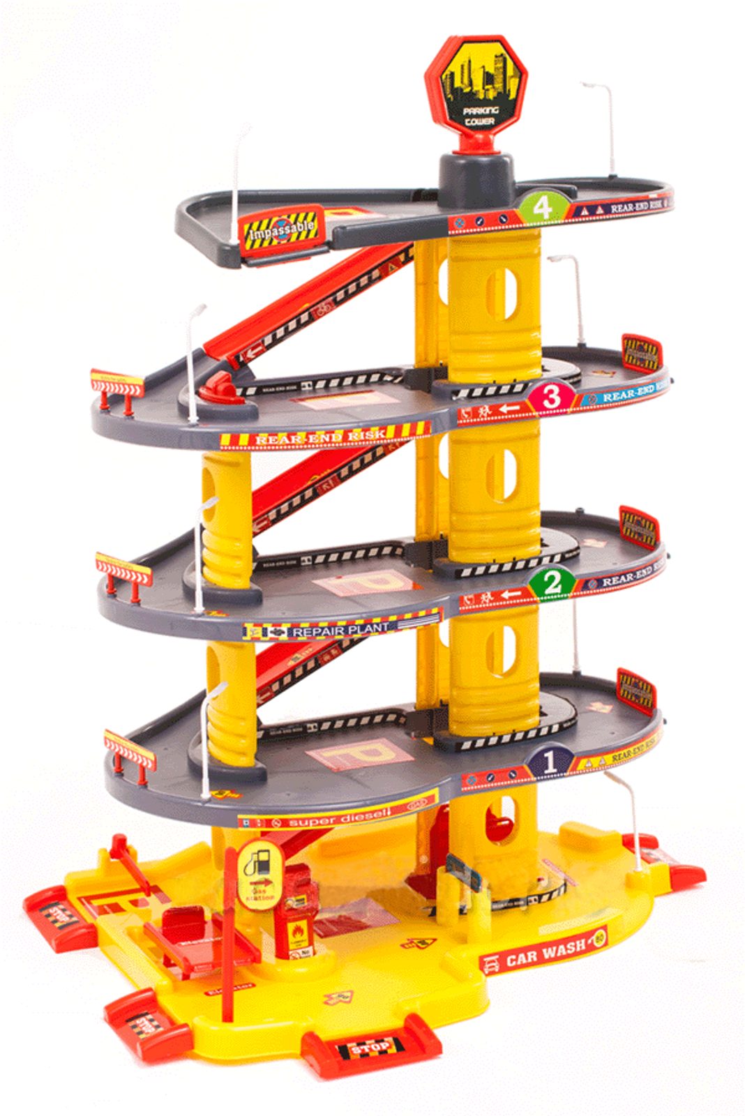 Dětská patrová garáž s 5 autíčky. Součástí parkoviště je pohyblivý výtah, který umožňuje přesouvat autíčka mezi jednotlivými patry, pouliční osvětlení a benzínová pumpa. Jednotlivá patra jsou propojena spirálovitou dráhou. Mladý motoristický nadšenec zde nalezne vše co potřebuje. Vyrobena z velmi kvalitního materiálu bez ostrých hran.