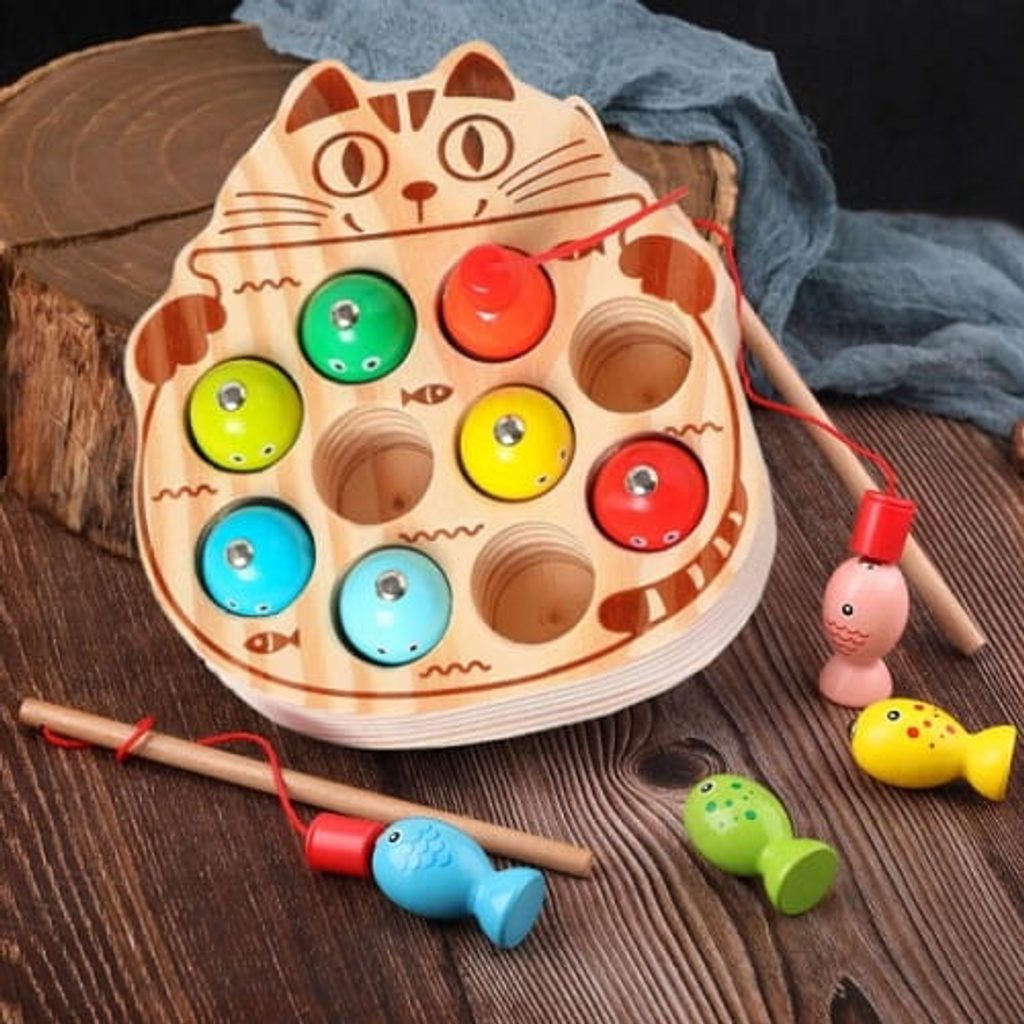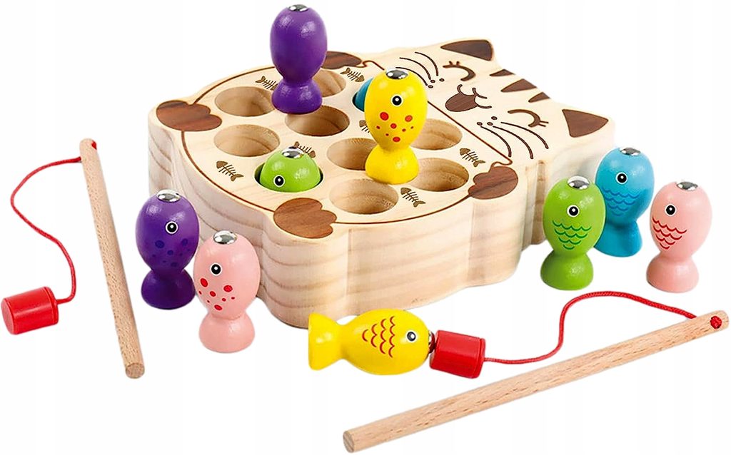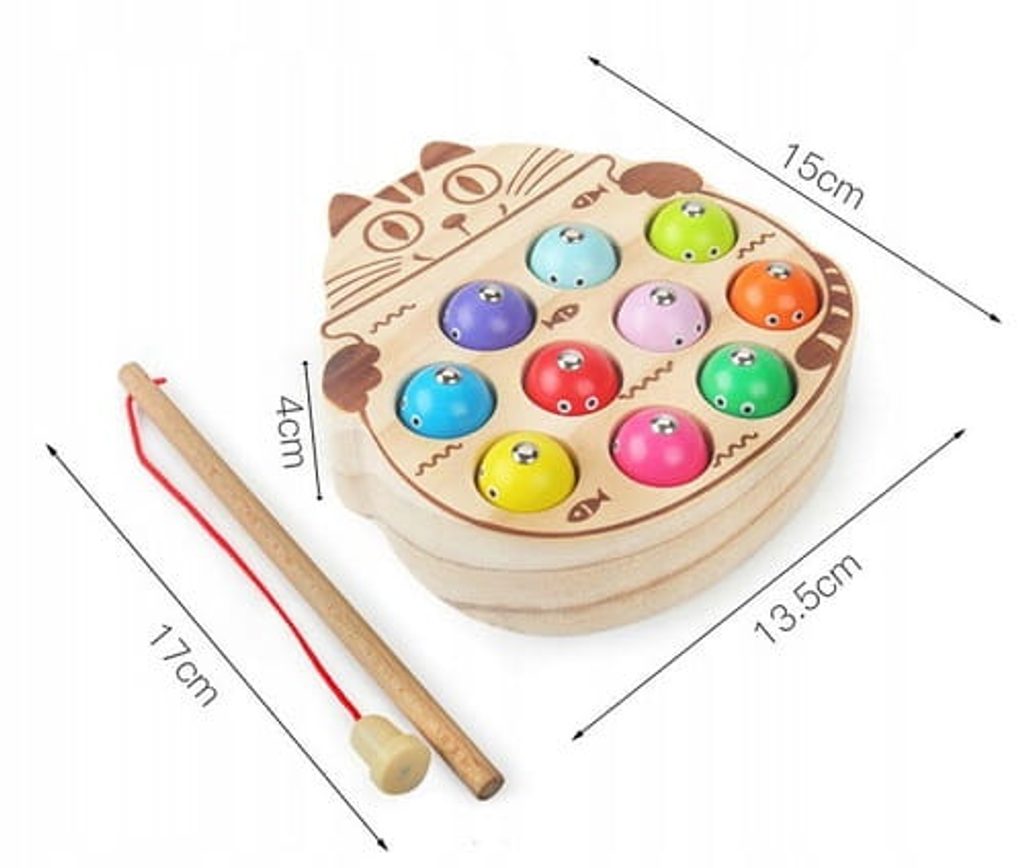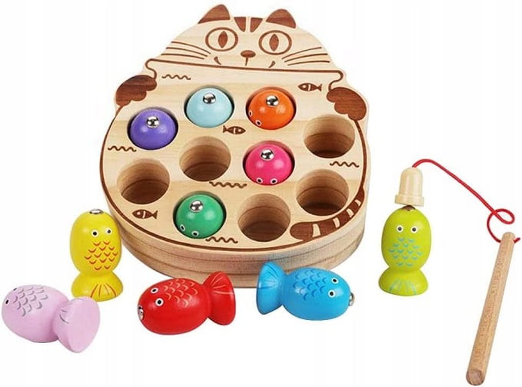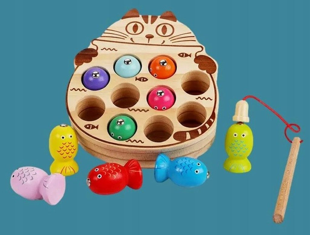 Dětská hra Lovení rybiček Cat Fishing s magnetem učí dětí koordinaci a podporuje kreativitu. Pomocí dvou přiložených prutů lze lovit dřevěné rybičky a ukládat je druhou část hry v provedení kočičky. Vše je vyrobeno ze dřeva bez ostrých hran. Hračka je určena pro děti od 36 měsíců věku.
