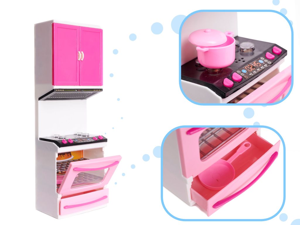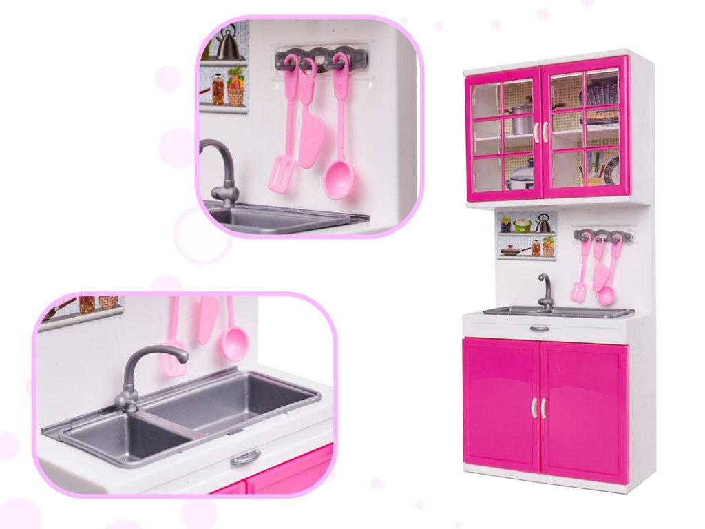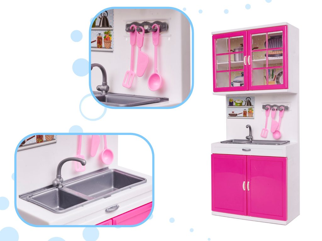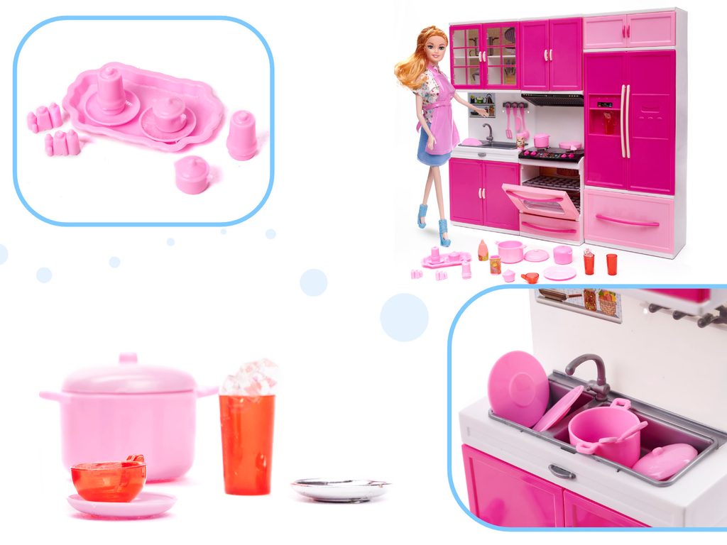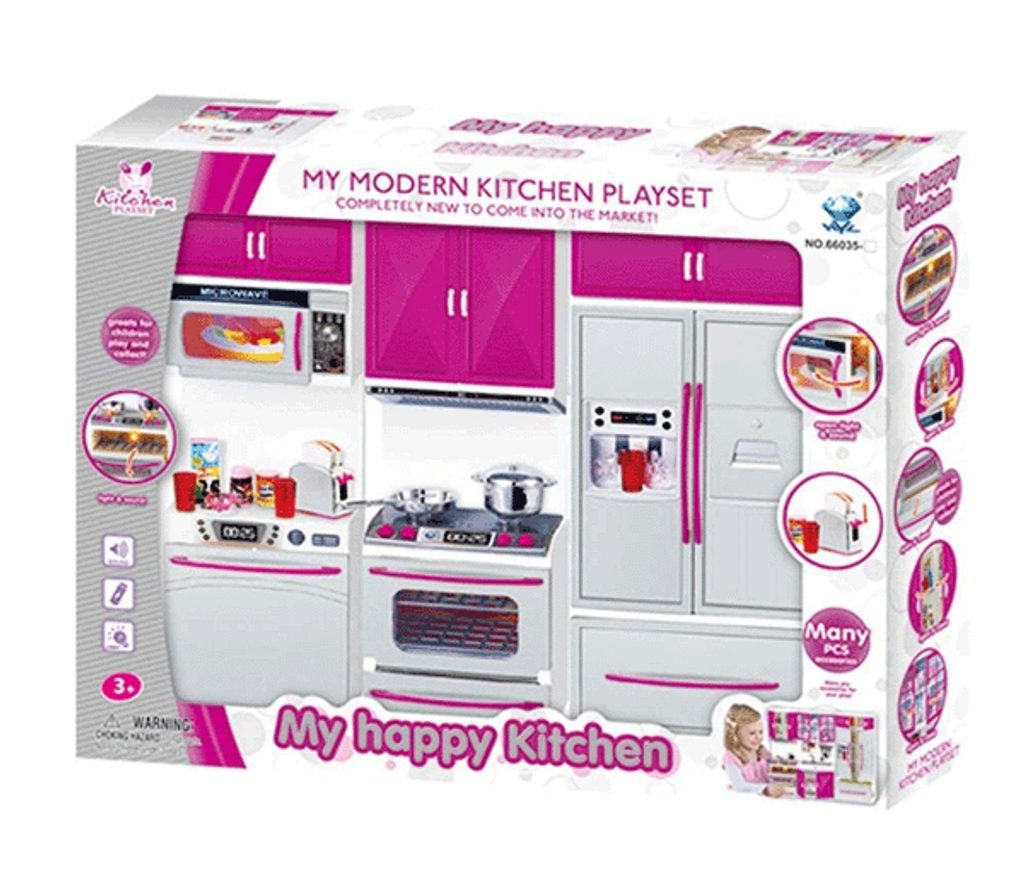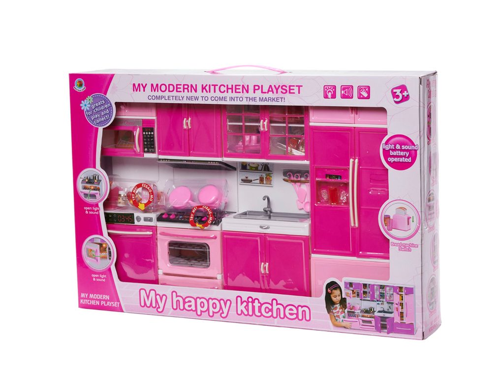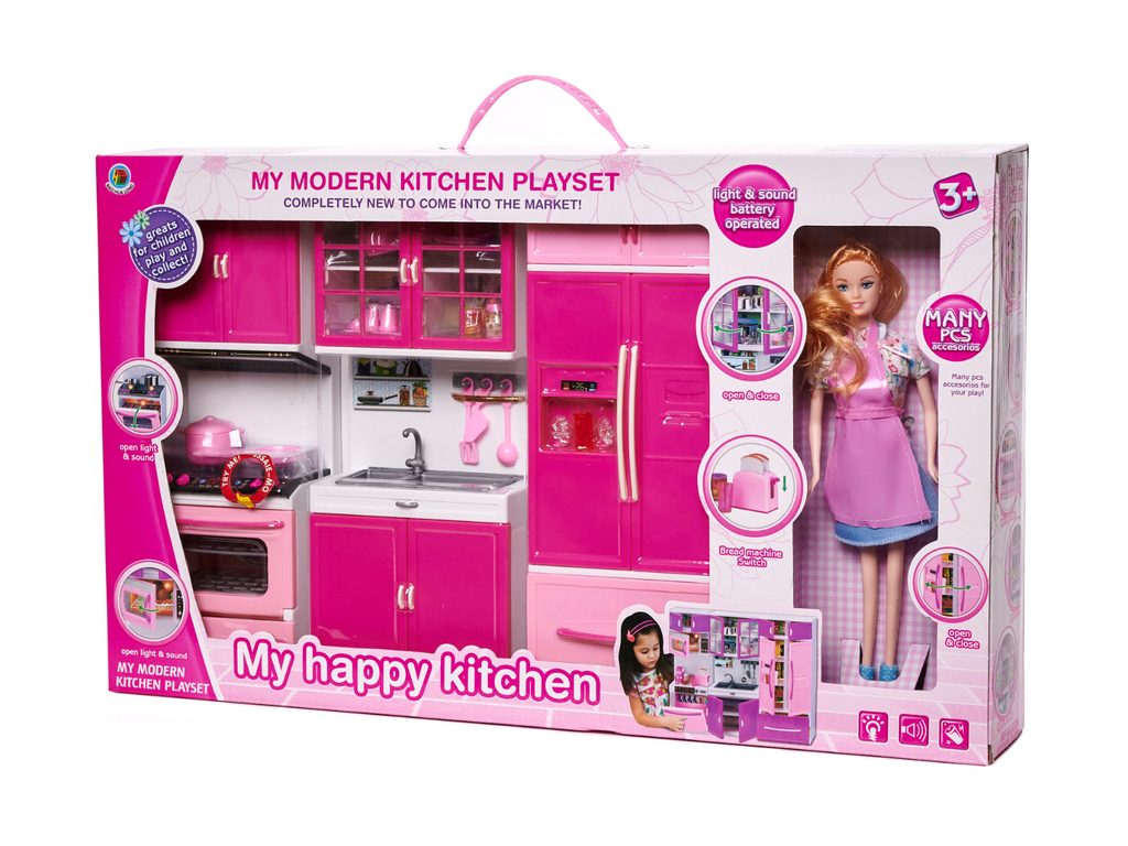 Interaktivní dětská kuchyňka Doris Happy Kitchen se zvuky, světlem a příslušenstvím je určena pro děti od 36 měsíců věku. Skládá se ze třech samostatných elementů, které vytvářejí praktický celek. V jedná části naleznete mikrovlnnou troubu s myčkou nádobí, ve druhé potom sporák s kuchyňskou skříňkou a v další části je velké lednice. Set obsahuje další příslušenství jako jsou imitace potravin, toaster, hrnec, pánev, skleničky, imitace ledových kostek a další. Vše je doplněno zvukovými a světelnými efekty. Kuchyňka je vyrobena z kvalitního plastu v pestrobarevném provedení.