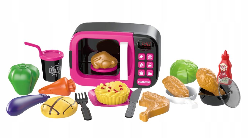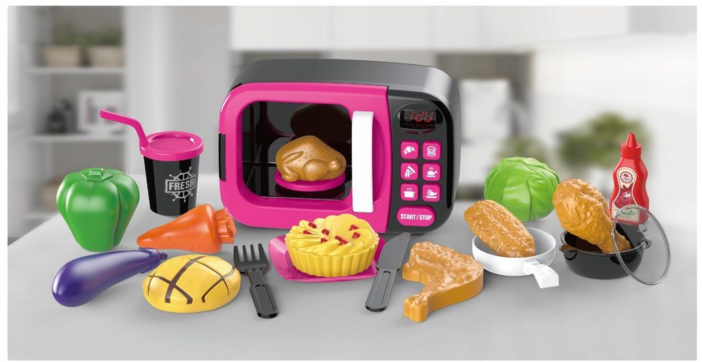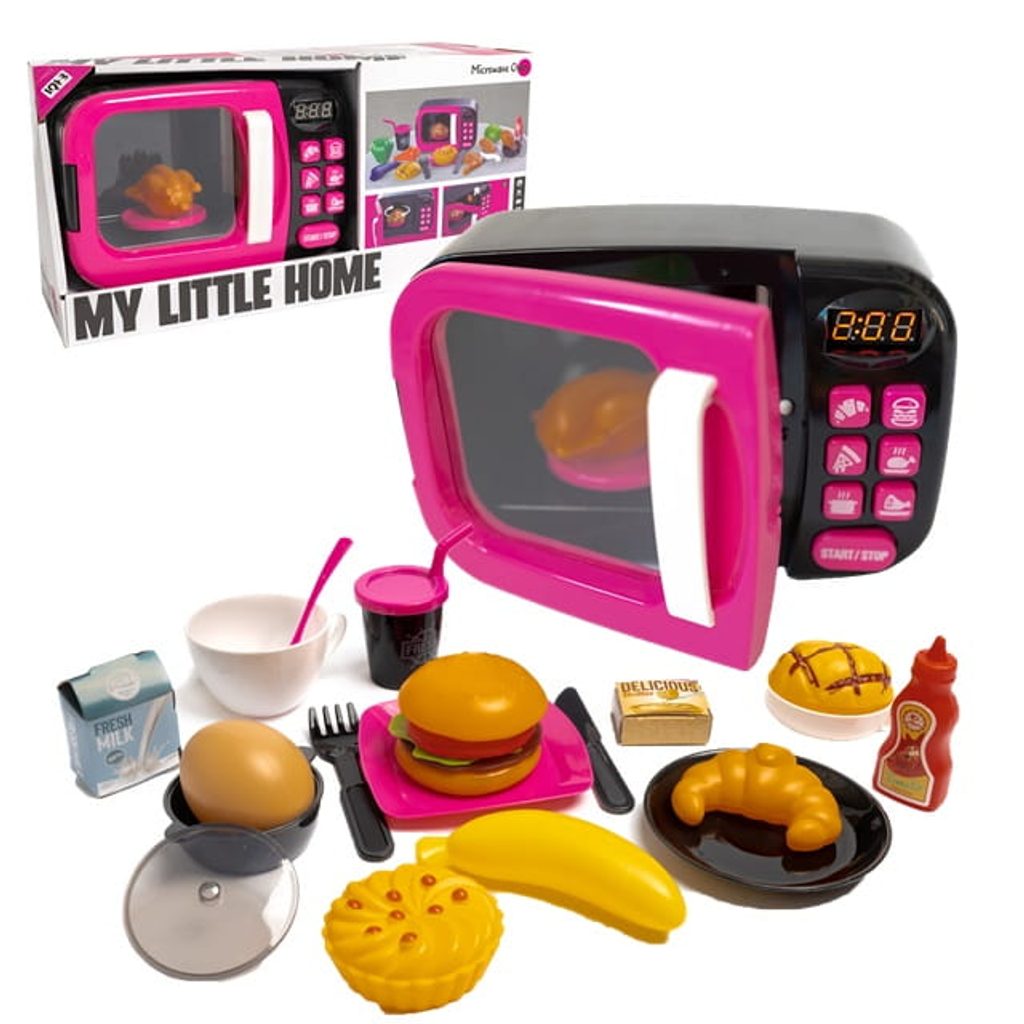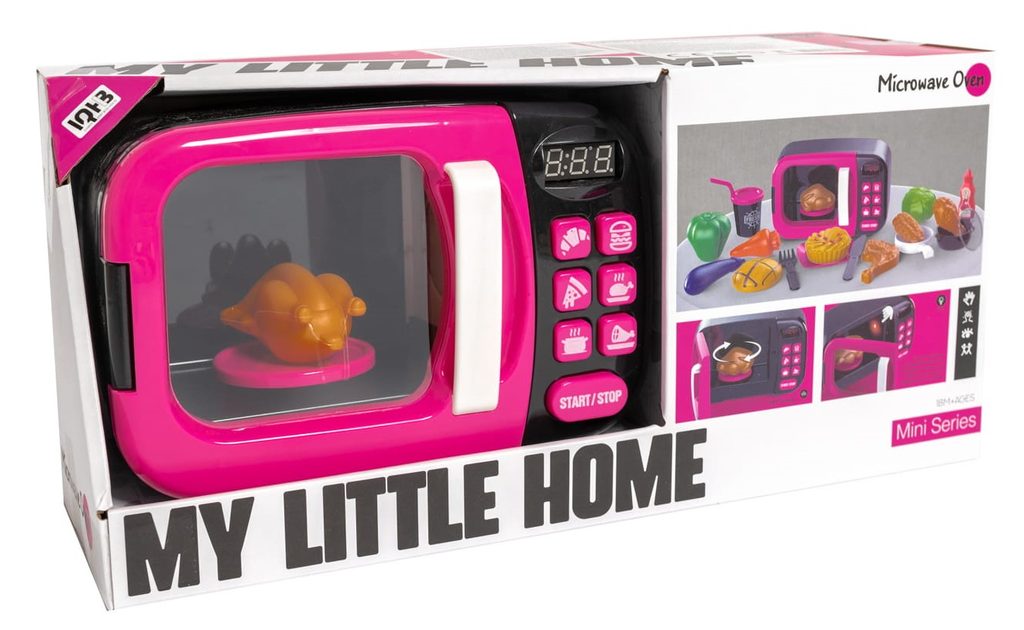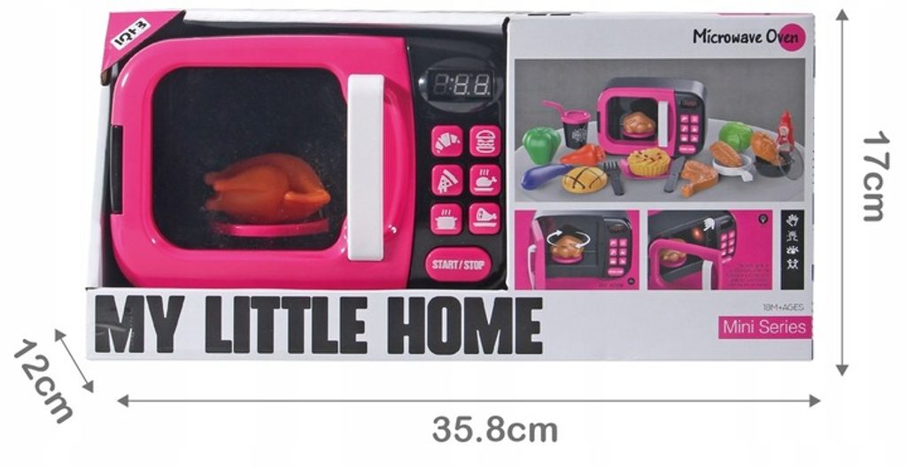 Dětská mikrovlnná trouba MyLittle Home umožní Vašemu dítěti "ohřát" jakékoliv jídlo jako ve skutečné kuchyni. Součástí sady jsou kromě samotné trouby také příbory, talířek, kelímek, nádobí a imitace jídel a potravin. Tlačítka v přední části umožnují výběr pokrmu pro ohřátí. Po zapnutí se talíř uvnitř otáčí a také se spustí vnitřní světlo. Hračka je určena pro děti od 36 měsíců věku.