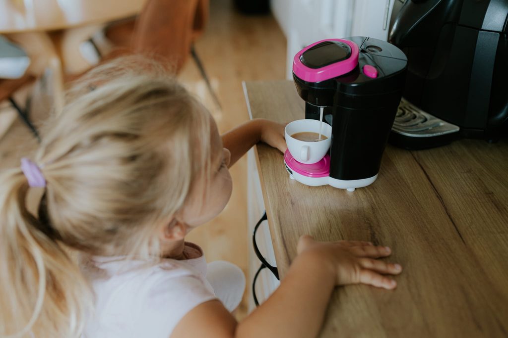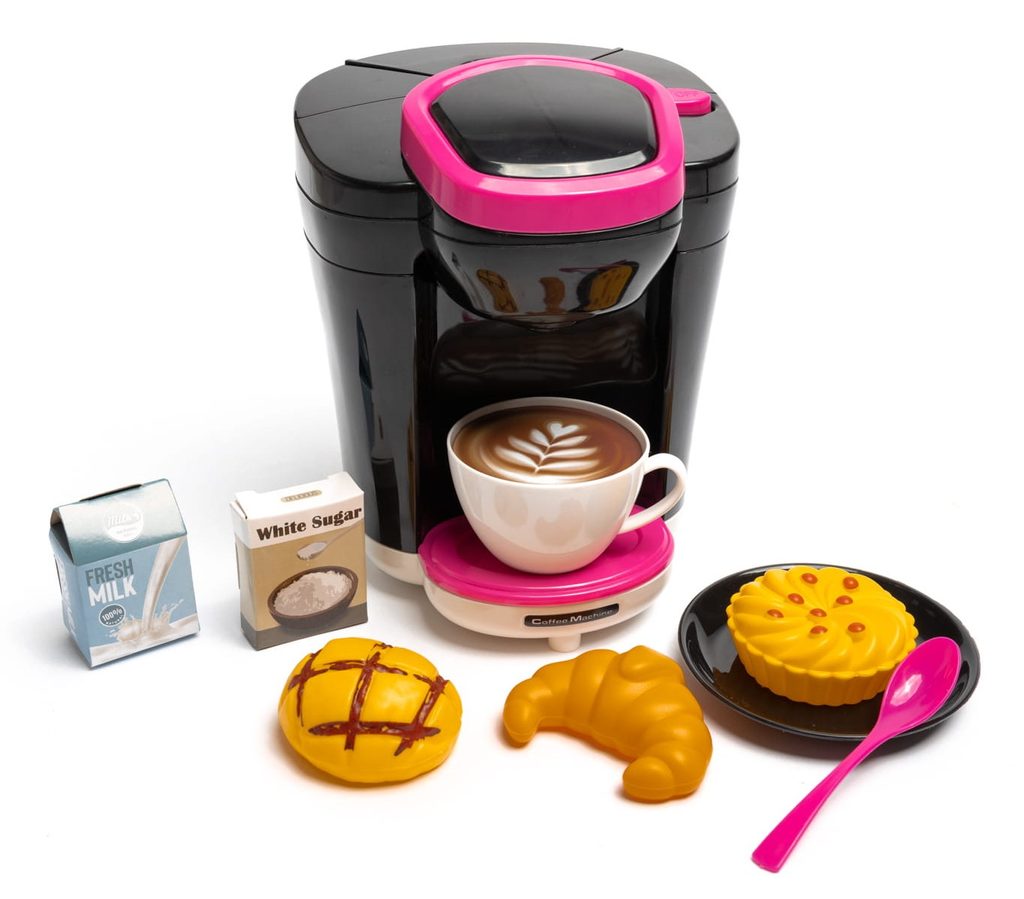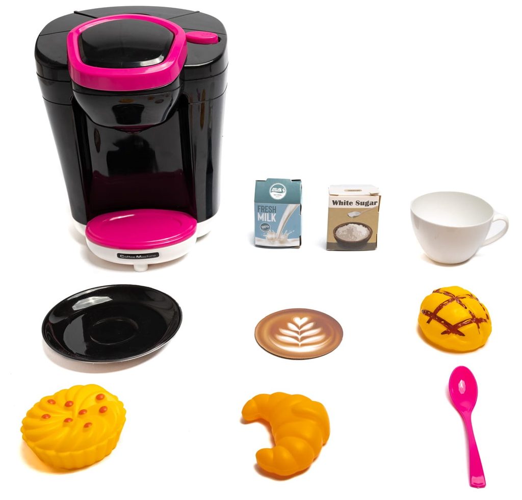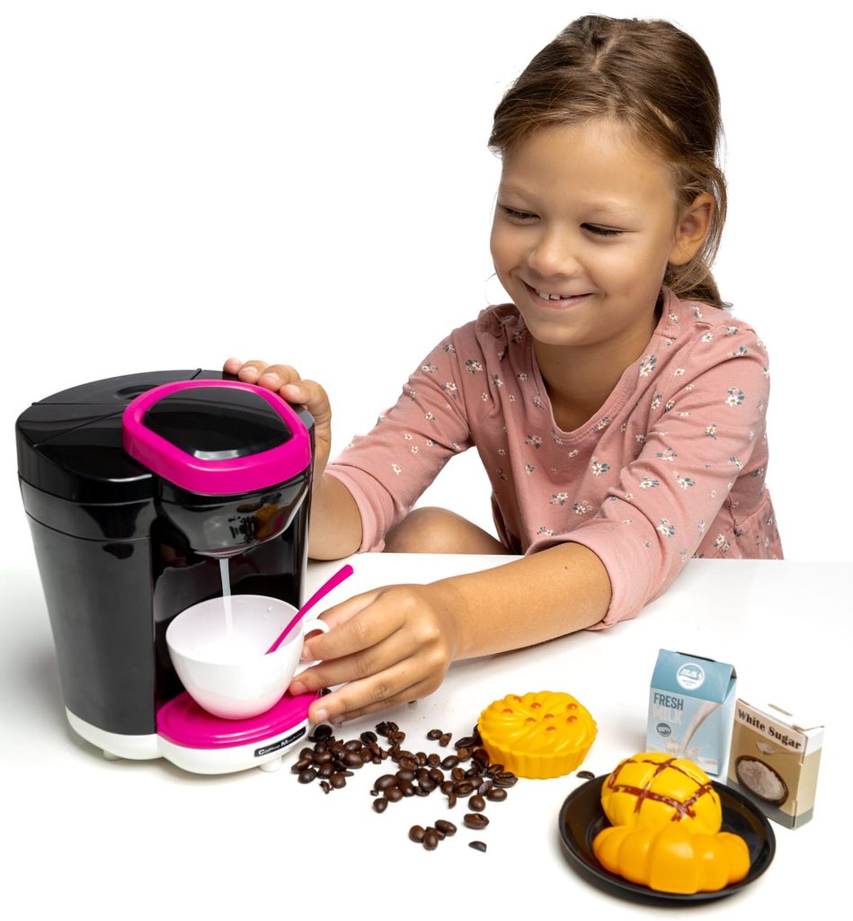 Dětský kávovar - espresso umožní Vašemu dítěti uvařit kávu pro své oblíbené panenky nebo pro rodiče. Součástí sady je kávovar, hrneček s talířkem, lžička a imitace potravin. Během provozu vydává kávovar zvuky a svítí světýlko. Hračka je určena pro děti od 36 měsíců věku.