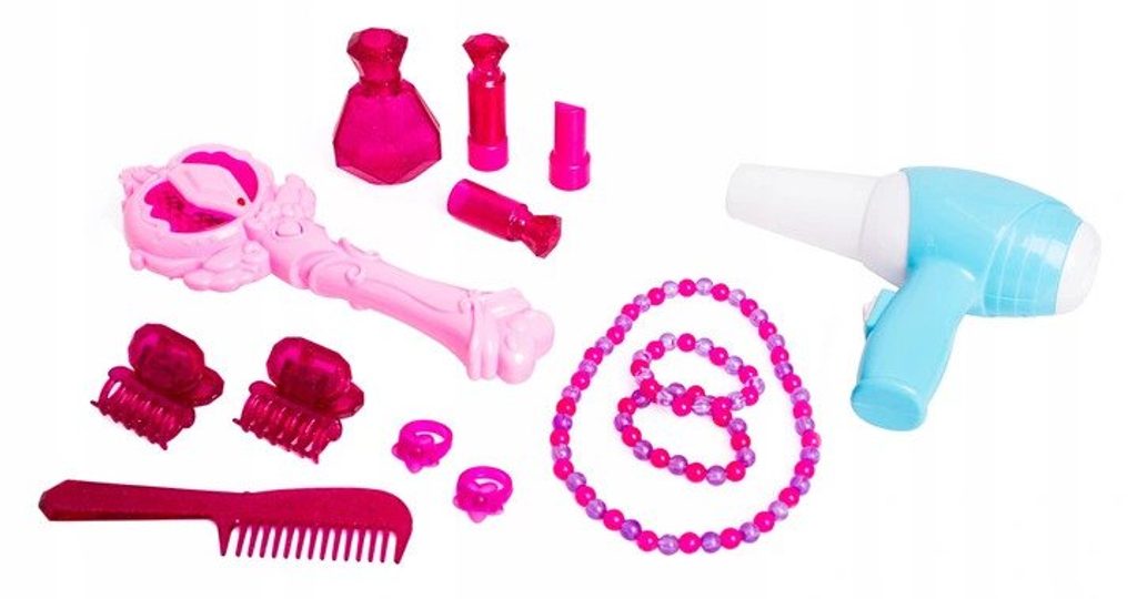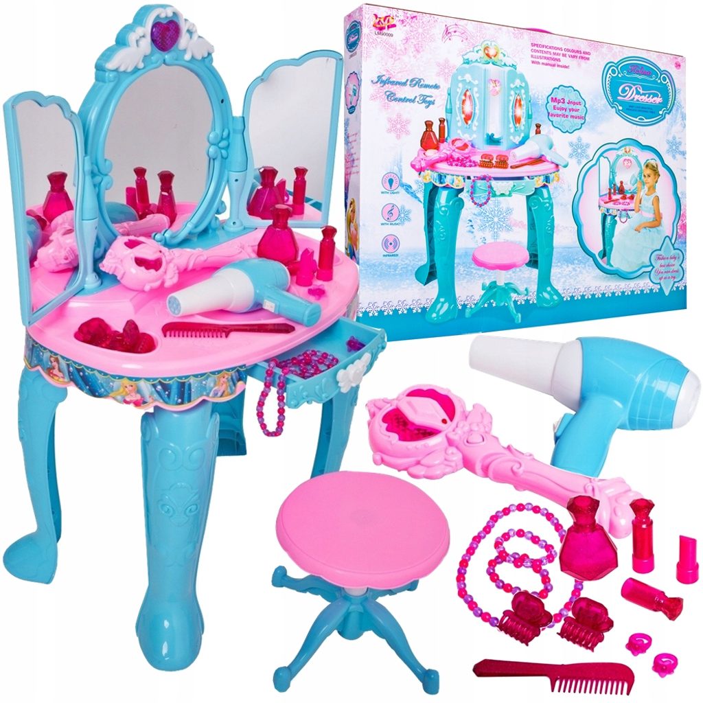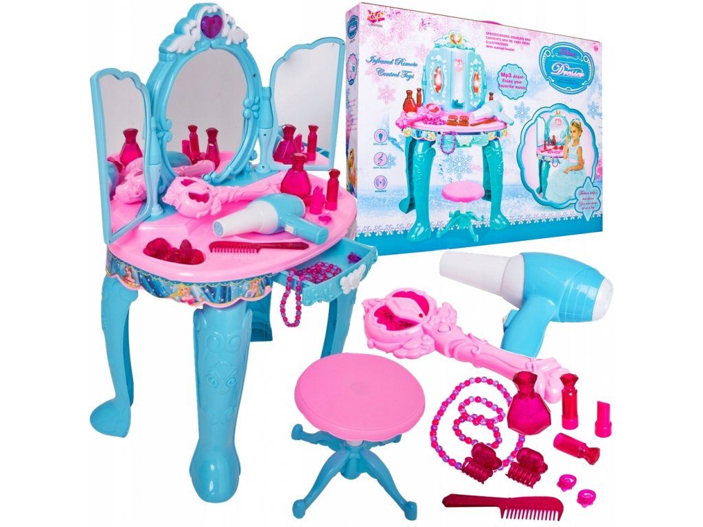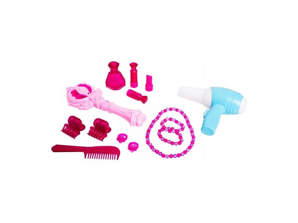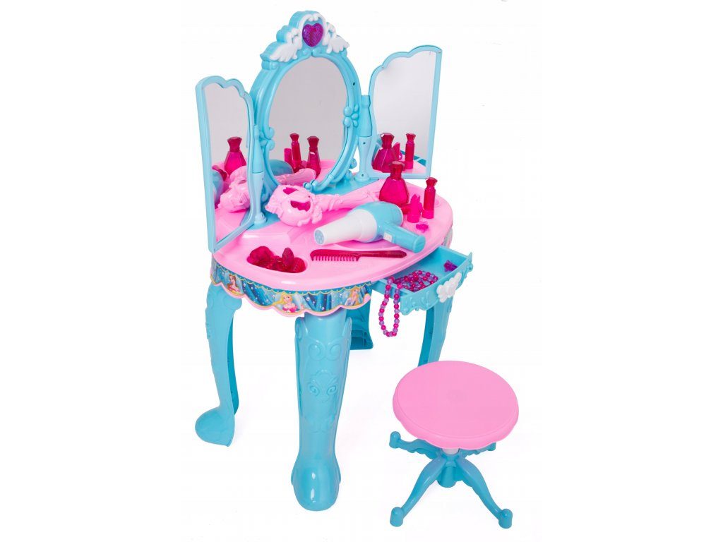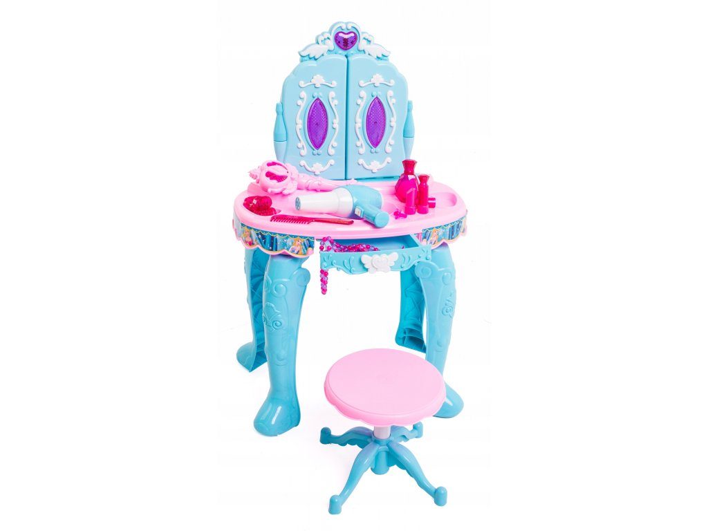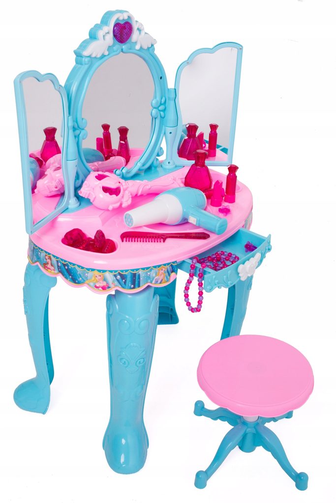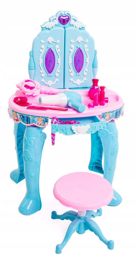 Doris plastový toaletní stoleček Magické zrcadlo musí být součástí pokojíčku každé malé princezny. Pomocí magické hůlky na baterie se otevírá zrcadlo. Po jeho otevření se objeví na zrcadle obrázek princezny, spustí se zvuk a světelné efekty. Když se zrcadlo zavře obrázek zmizí. Je vybaven spoustou důležitých věcí pro každou malou parádnici. Set obsahuje imitace kosmetiky, hřeben, náhrdelník, prstýnky, praktickou stoličku, oboustranné zrcadlo. Pro ještě větší zábavu je stoleček vybaven konektorem na propojení z MP3. Fén na baterie fouká vzduch jako by byl skutečný. Hračka je určena pro děti od 36 měsíců věku.