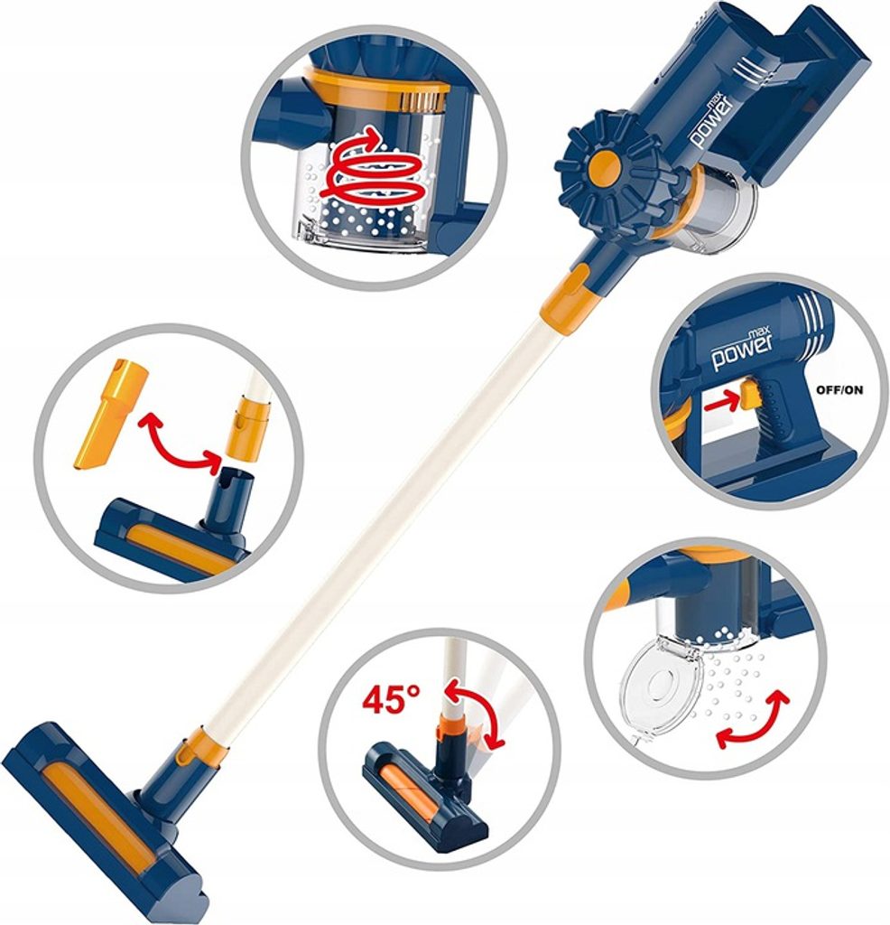 Doris dětský tyčový vysavač Vacuum Cleaner přemění Vaše dítě v opravdovou paní nebo pána domu a naučí ho pečovat o čistotu. Nádoba na nečistoty je otevírací a součástí balení jsou také polystyrenové kuličky imitující smetí. Vysavač vydává zvuky jako skutečný. V sadě jsou tří různé nástavce kdy pomocí nich můžete vysavač využít jako ruční. Vysavač je napájen bateriemi, které nejsou součástí balení. Hračka je určena pro děti od 36 měsíců věku.