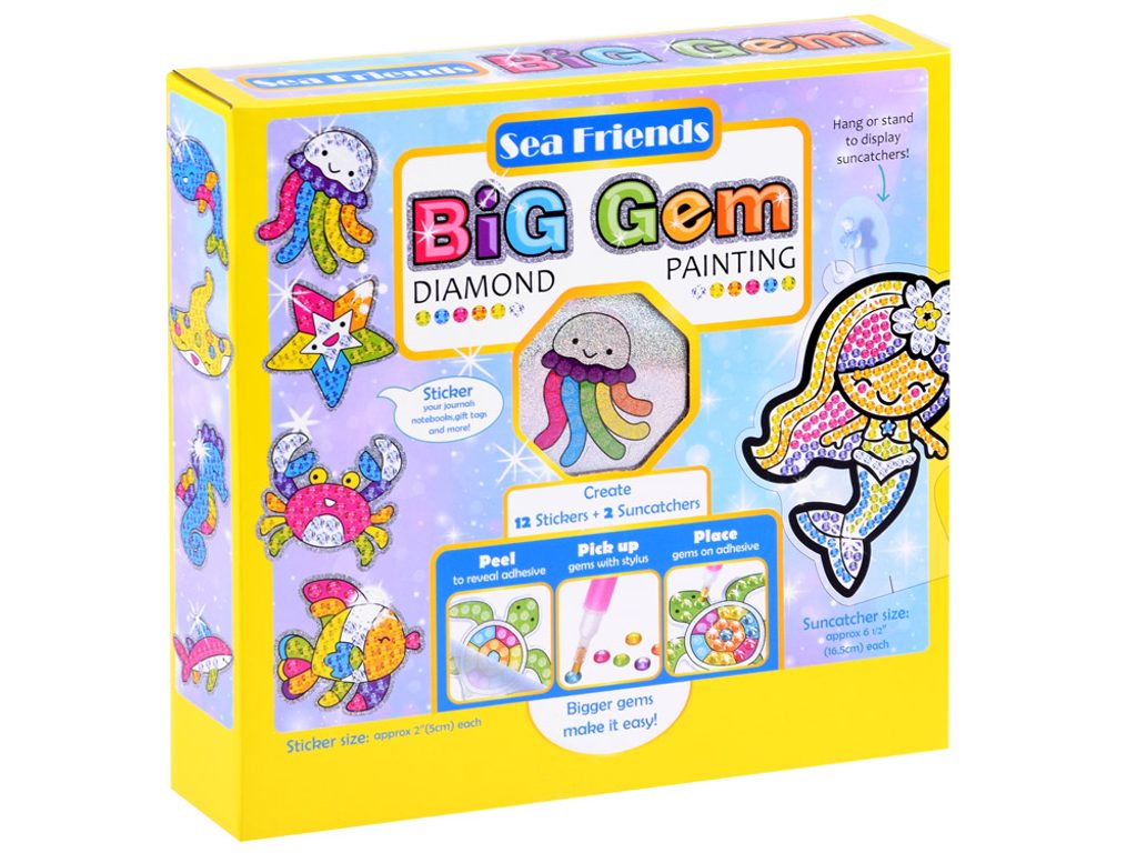 Doris diamantová mozaika Big Gem Ocean učí dětí představivost, podporuje kreativitu a manuální dovednosti. Sada obsahuje celkem 1000 ks brokátových "diamantů" v 7 barevných odstínech a kompletní příslušenství pro práci s nimi. Princip hry je v ukládání diamantů do předem připravených vzorů ve formě nálepek. Hračka je určena pro děti od 3 let věku.