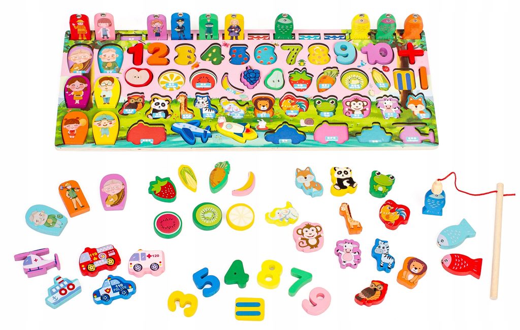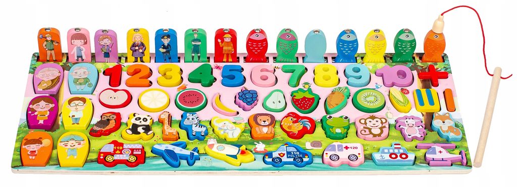 Doris dřevěná edukační vkládačka 5v1 Alphanumeric Pairing nabízí dětem několik možností hry. Naučí je rozpoznávat barvy a tvary, počítat a také angličtinu kdy jsou na podložce vepsány anglické názvy. A navíc může lovit dřevěné rybičky s magnetem pomocí přiložené udičky. Součástí sady je mimo podložky velké množství kostek v různých tvarech a s různými obrázky. Hračka je určena pro děti od 36 měsíců věku.