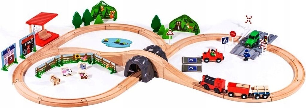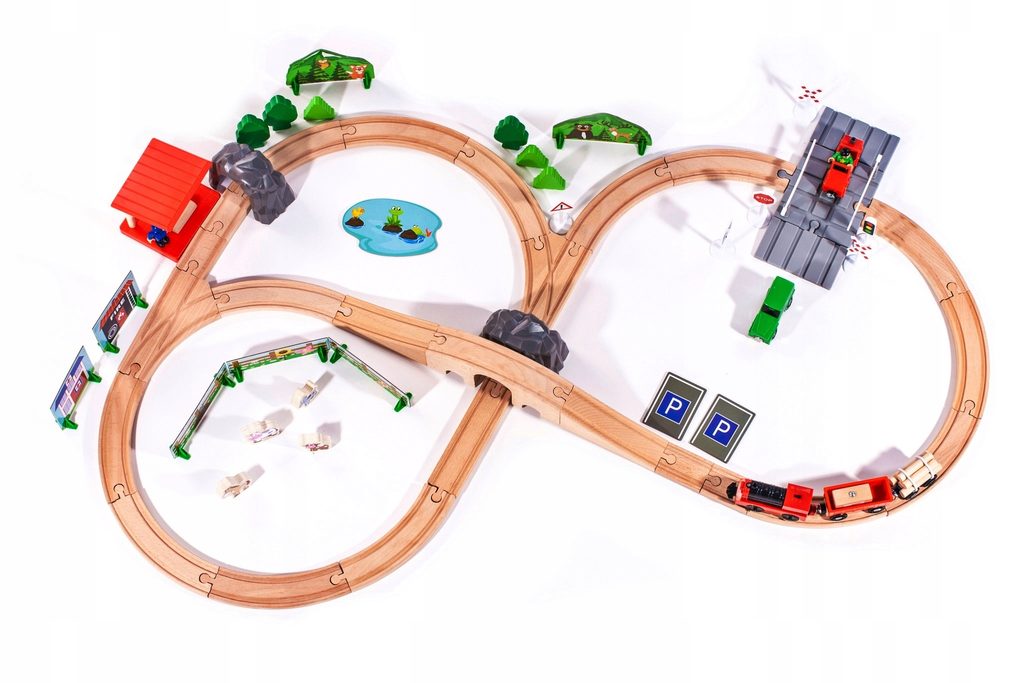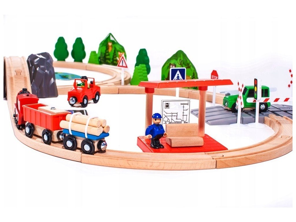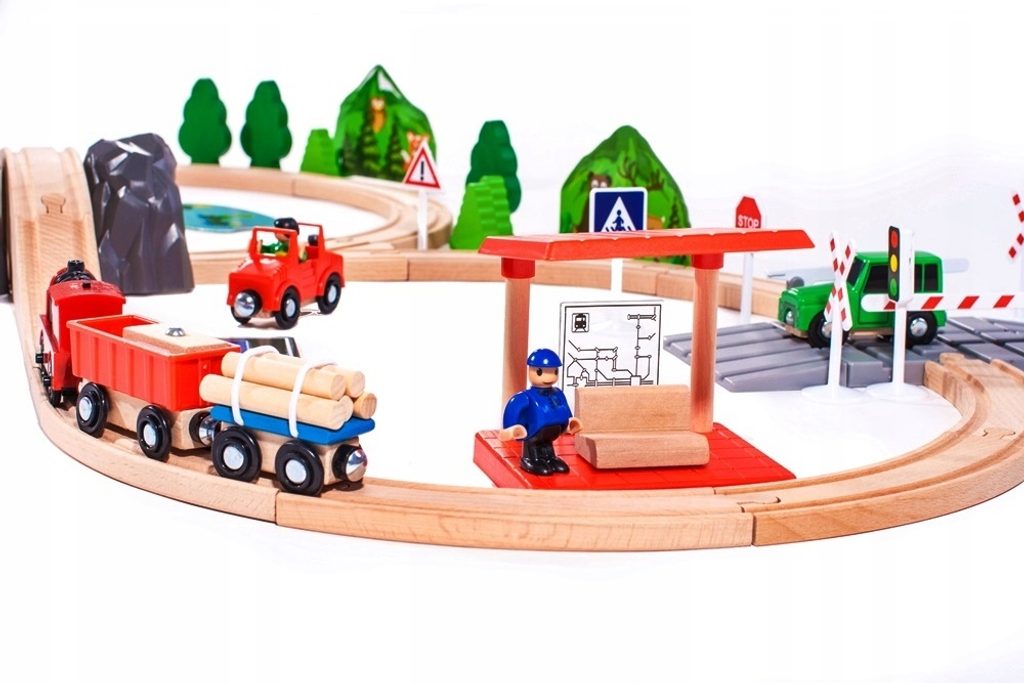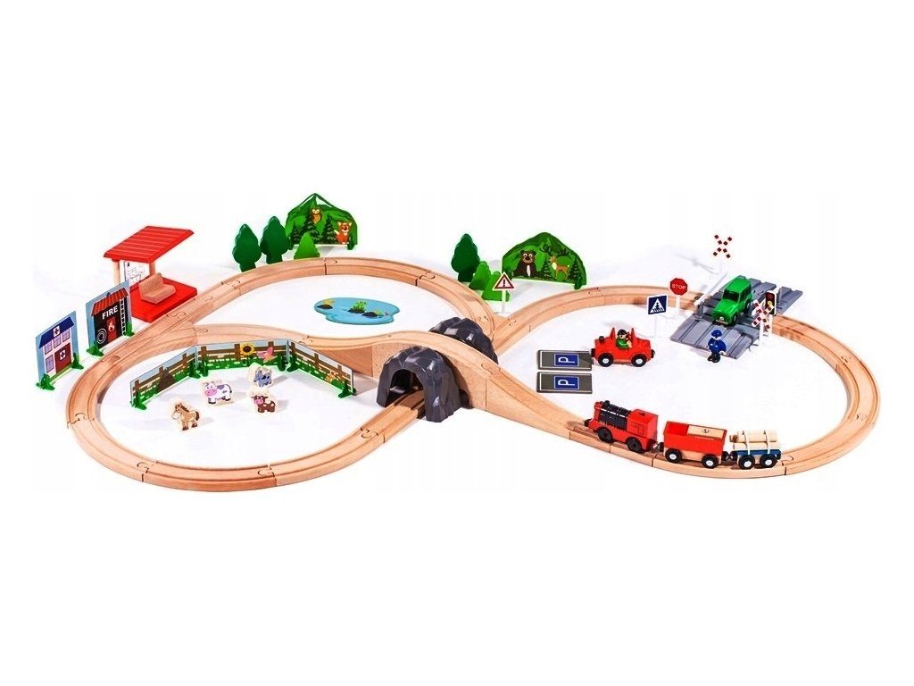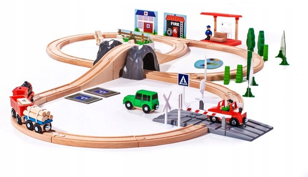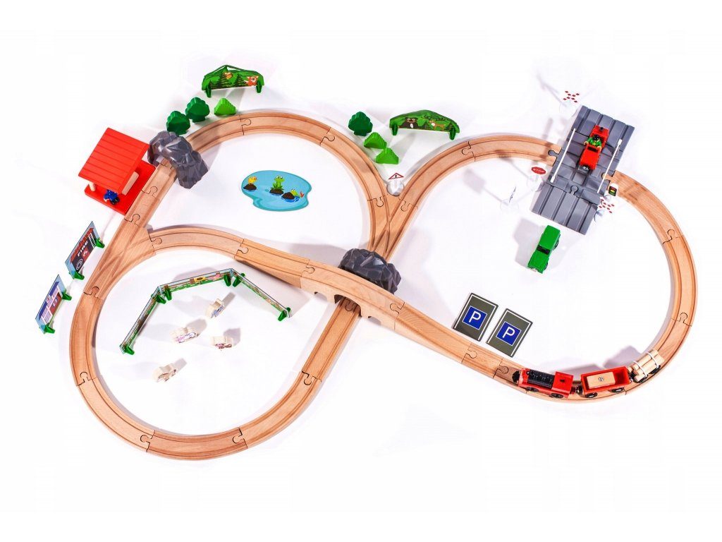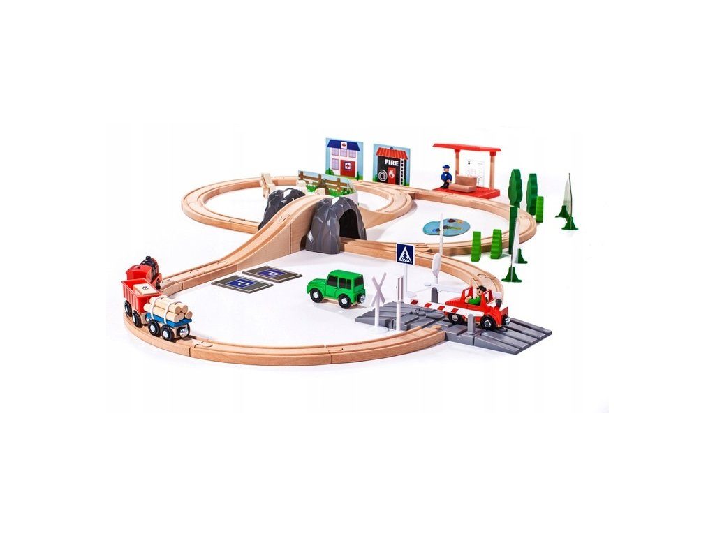 Doris dřevěná vláčkodráha s 90 elementy učí dětí představivost a podporuje kreativitu. Vláčkodráha je kompletně vybavená, naleznete zde lokomotivu s vagony, autíčka, zastávku, přejezd se závorami, dopravní značky, dřevěné stromečky, figurky a další. Lokomotiva je poháněná baterií a vagonky lze připojit pomocí magnetu. Vše je vyrobeno z kvalitního dřeva bez ostrých hran. Hračka je určena pro děti od 36 měsíců věku.