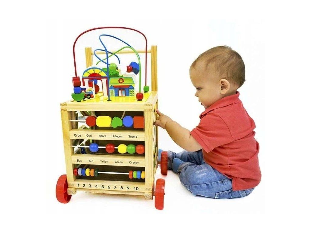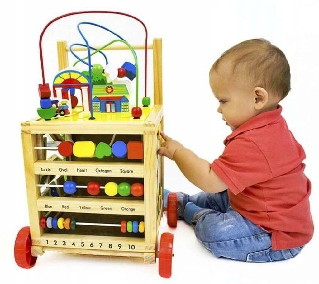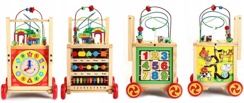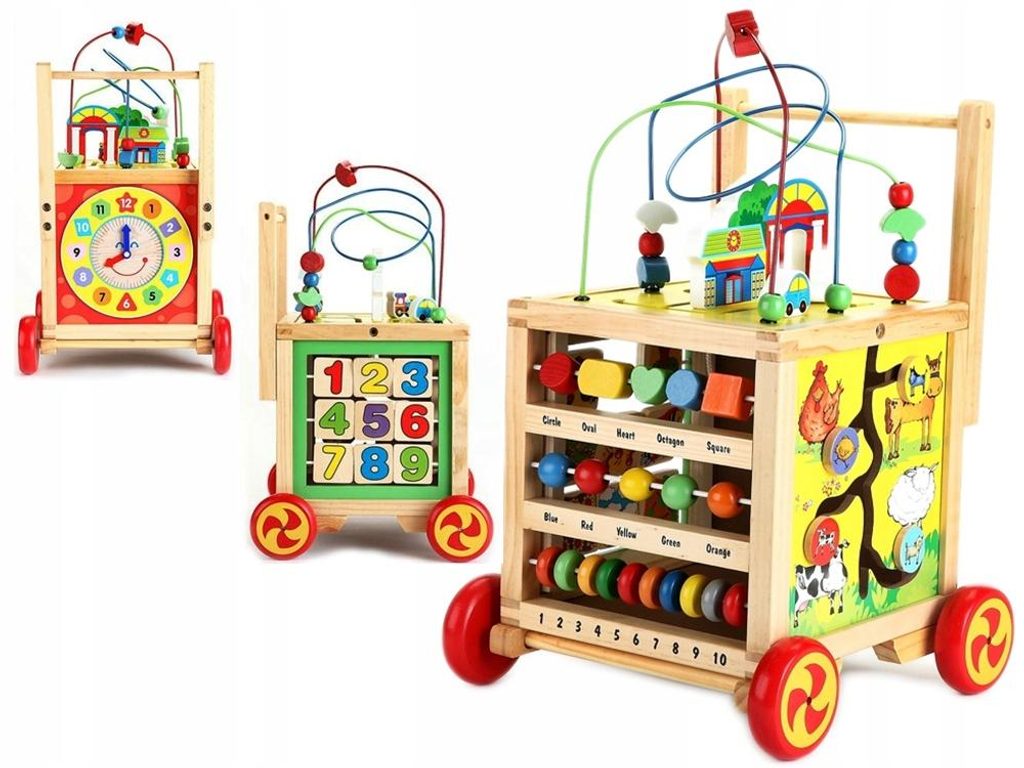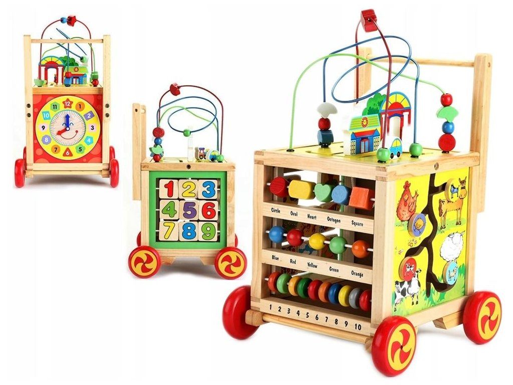 Doris dřevěné chodítko edukační kostka 6v1.V horní části umístěna kovová konstrukce - labyrint s korálky které se mohou libovolně přesouvat a lze ho odejmout. Stěna s otočnými čísly slouží pro nauku počítání. Hodiny naučí dítě rozpoznávat čas.Počítadlo učí dítě rozpoznávat čísla a první anglická slovíčka. Kostka je ideální hračkou pro rozvoj dětské motoriky, hmatu, zraku a logického myšlení. Hračka je určena pro děti už od 12 měsíců věku.