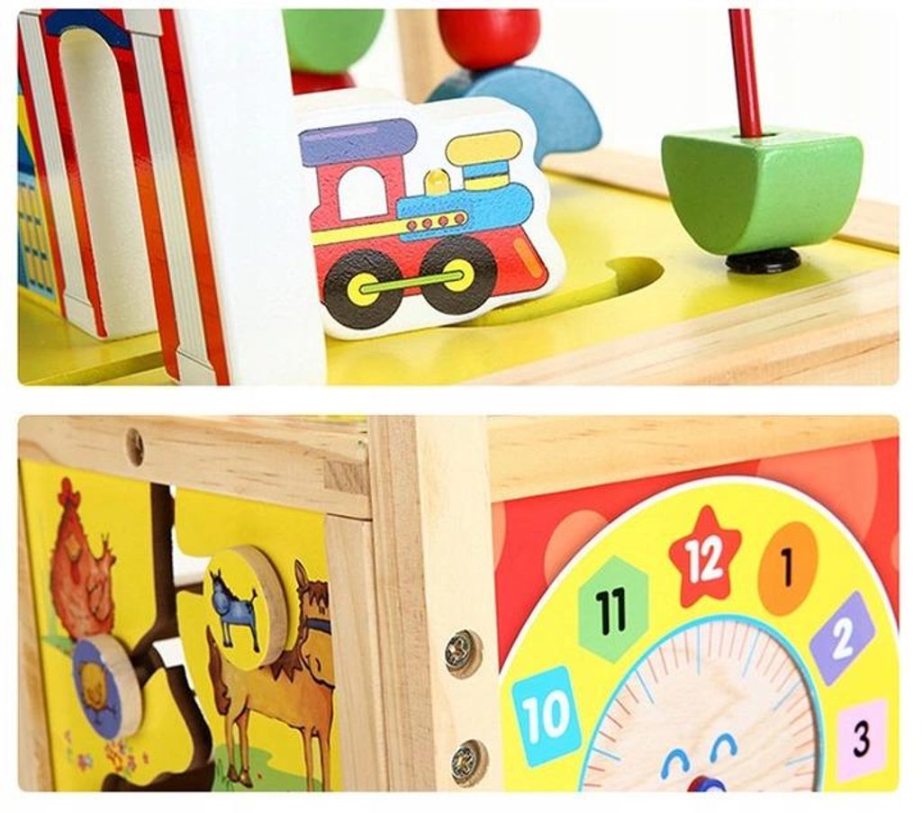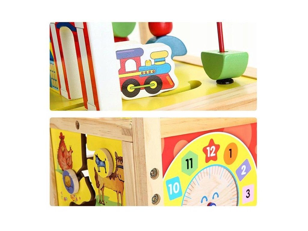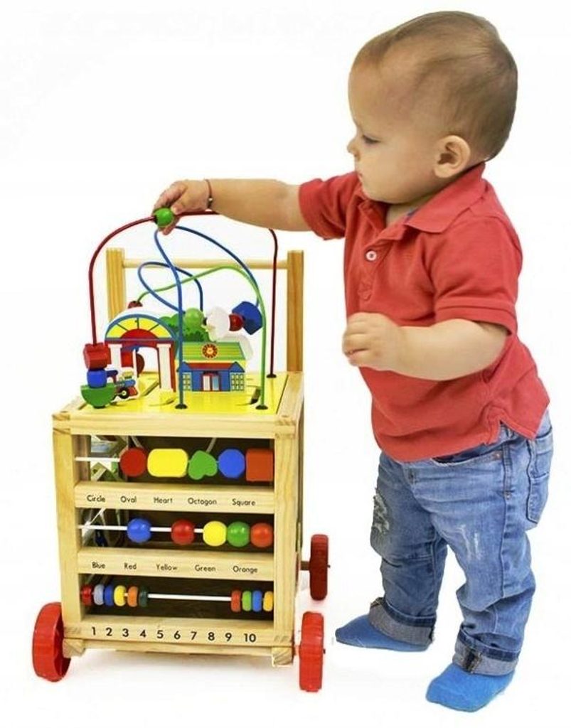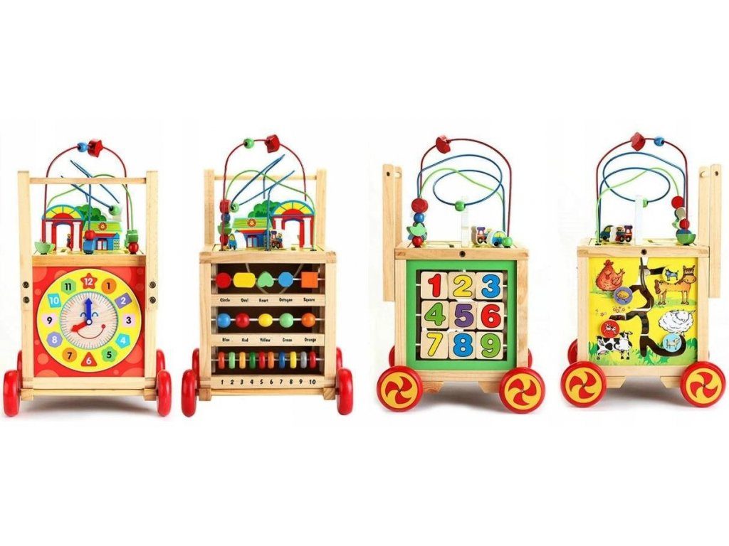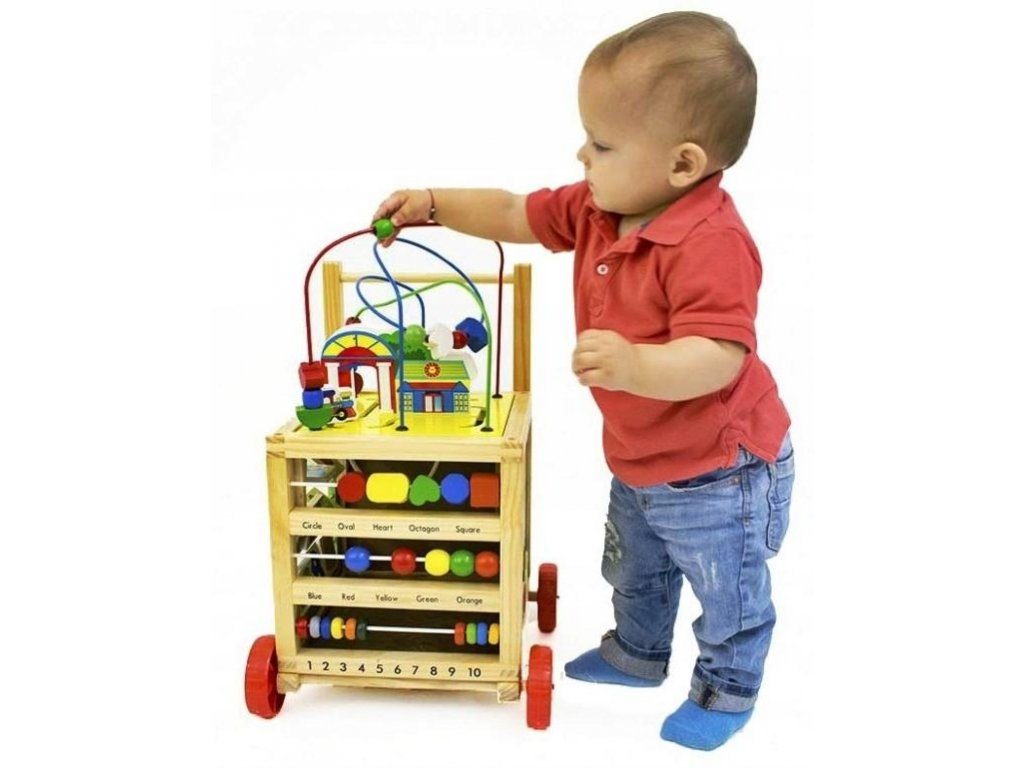 Doris dřevěné chodítko edukační kostka 6v1.V horní části umístěna kovová konstrukce - labyrint s korálky které se mohou libovolně přesouvat a lze ho odejmout. Stěna s otočnými čísly slouží pro nauku počítání. Hodiny naučí dítě rozpoznávat čas.Počítadlo učí dítě rozpoznávat čísla a první anglická slovíčka. Kostka je ideální hračkou pro rozvoj dětské motoriky, hmatu, zraku a logického myšlení. Hračka je určena pro děti už od 12 měsíců věku.
