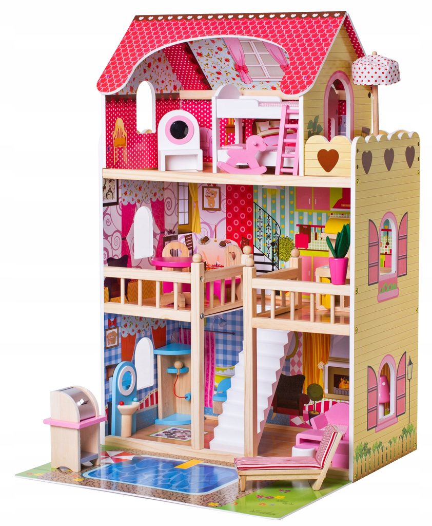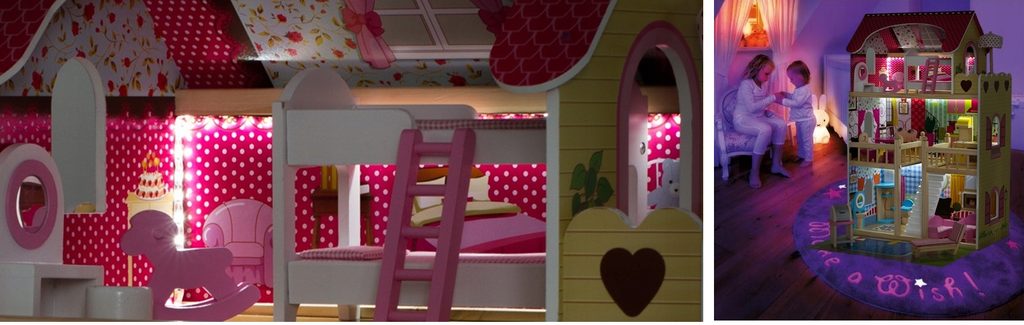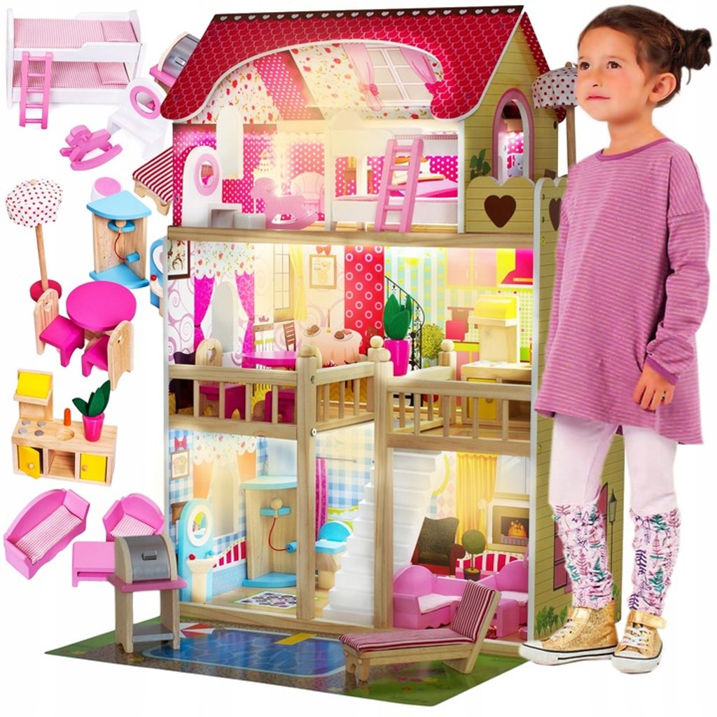 Nádherný dřevěný domeček pro panenky se 2 patry je snem každé malé princezny. Je vhodný pro všechny panenky typu Barbie do výšky 24 cm. Vila ztělesňuje život dítěte v dospělém světě. Pomocí všech věcí každodenní potřeby se dítě učí tvořivosti. Může také pozvat kamarády a užít si s nimi spoustu zábavy. Všechny prvky jsou provedeny v pestrých barvách a lze je libovolně uspořádat. Celý domeček je osvětlený LED páskou, která má celkem 15 barevných odstínů. O osvětlení lze nastavit rychlost blikání světýlek, zcela ho vypnout a také je zde možnost nastavení bílého zimního světla. Součástí je dálkový ovladač se 24 funkcemi.