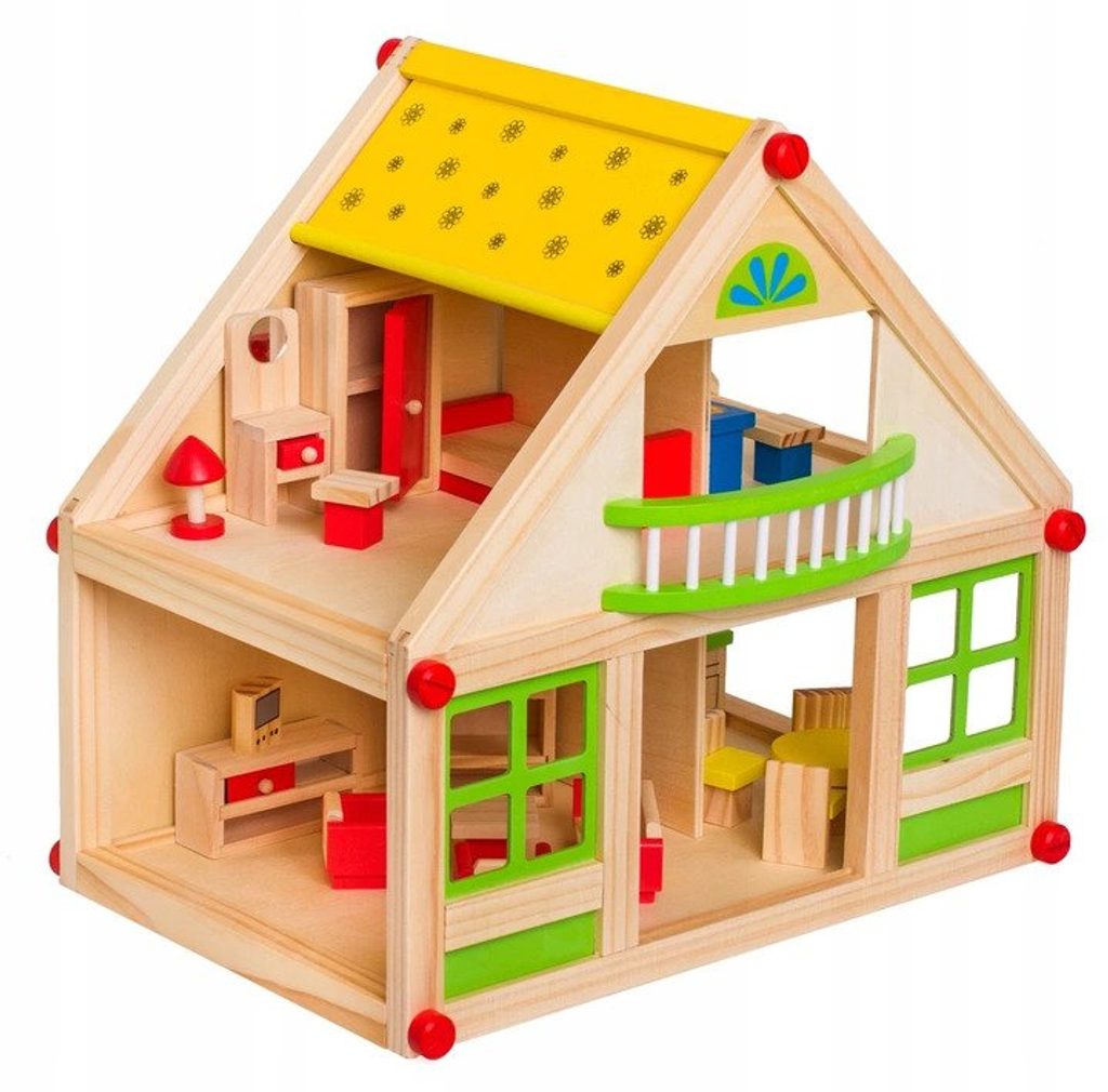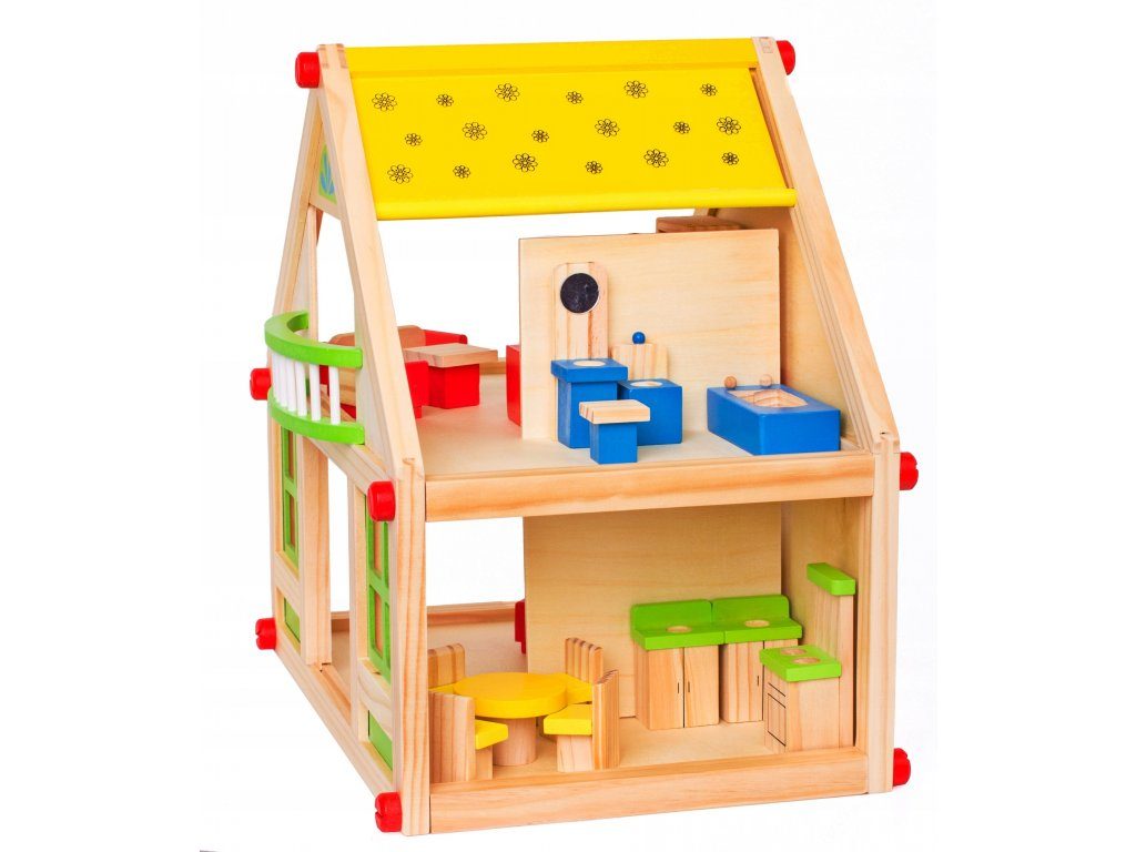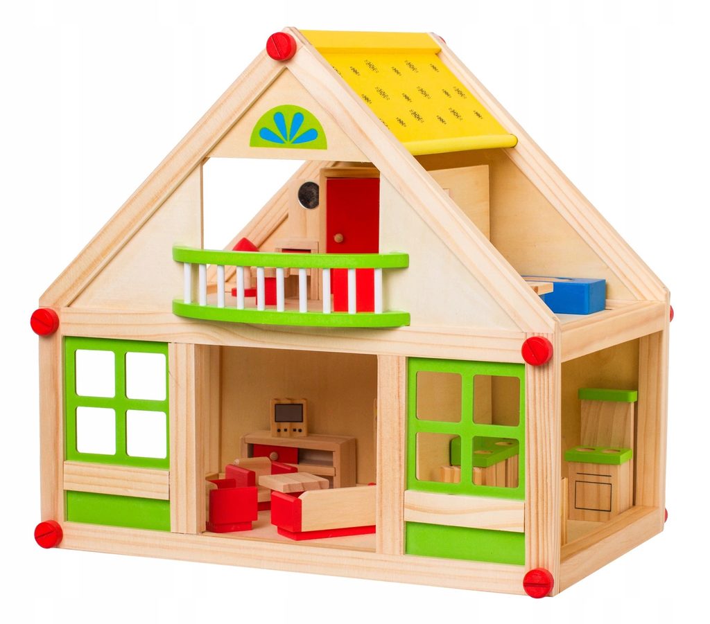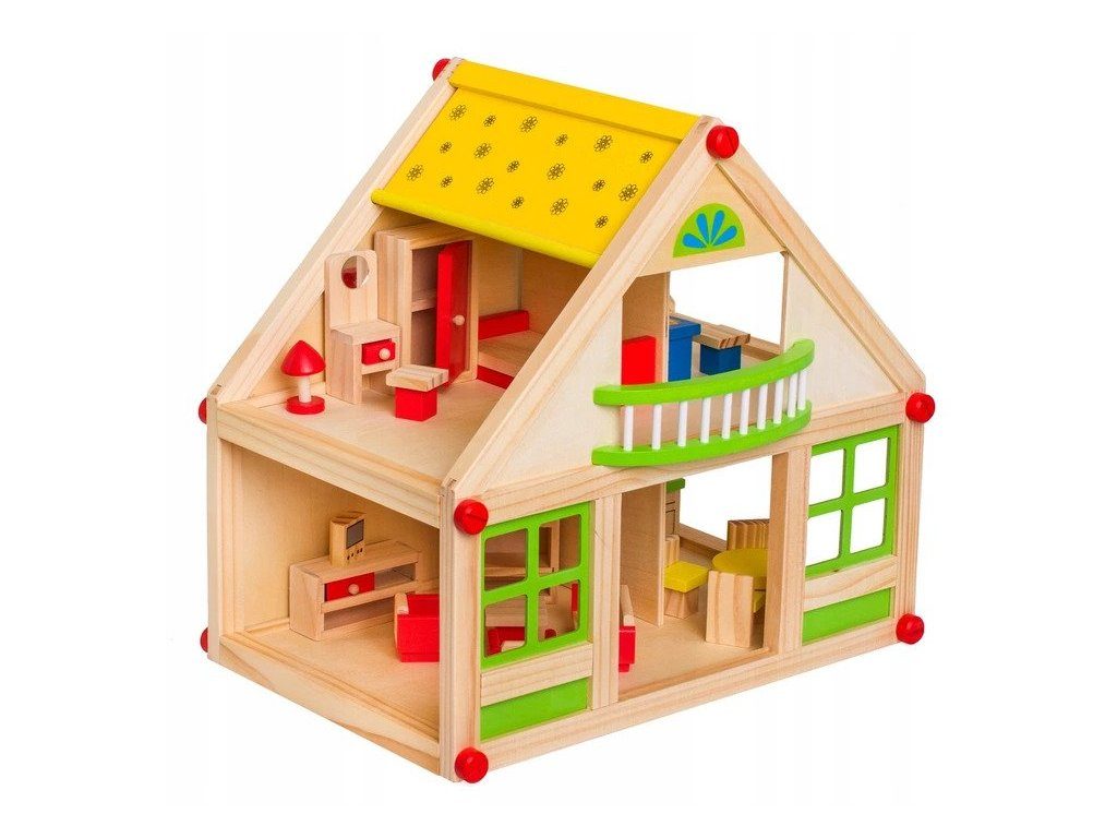 Nádherný dřevěný domeček pro panenky s přízemím a prvním patrem je snem každé malé princezny. Dítě si může jednotlivé díly nabarvit čím se stane domeček originálním. Pomocí všech věcí každodenní potřeby se dítě učí tvořivosti. Může také pozvat kamarády a užít si s nimi spoustu zábavy. Obsahuje 24 ks nábytku.