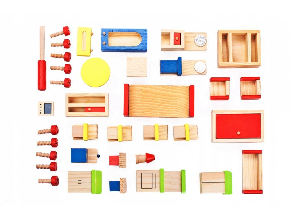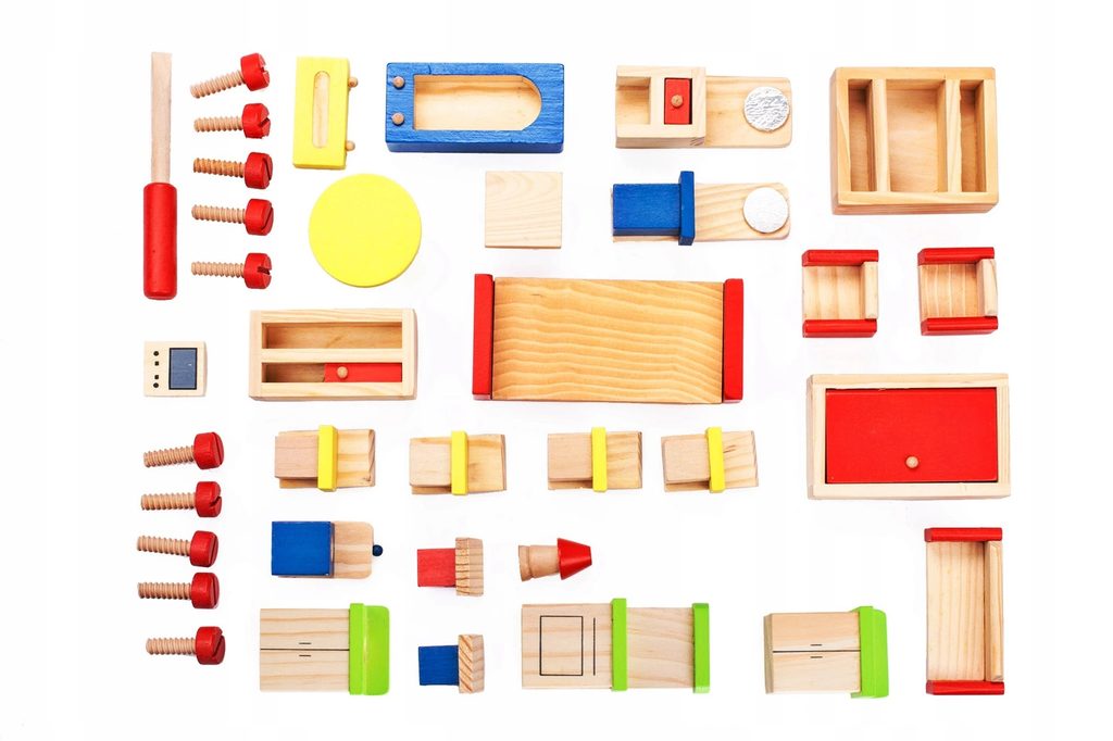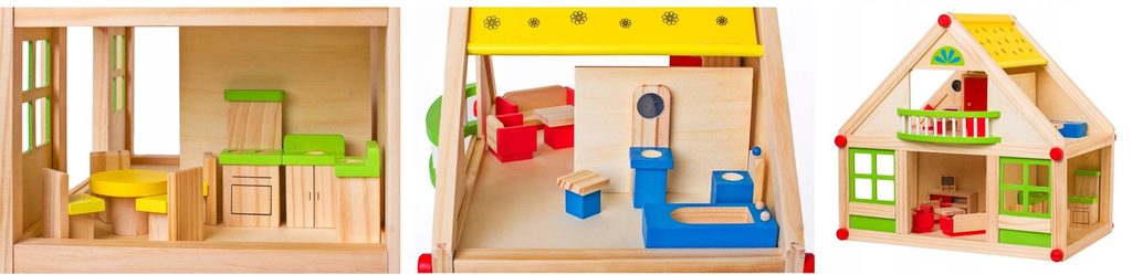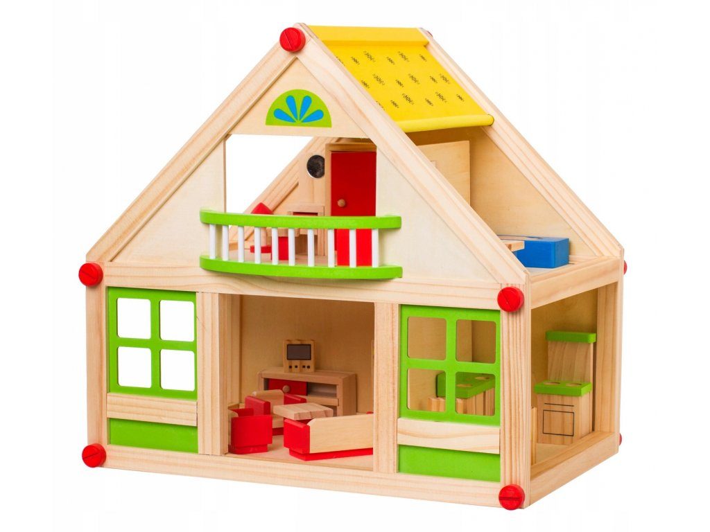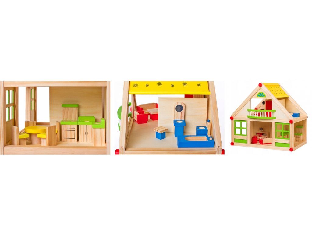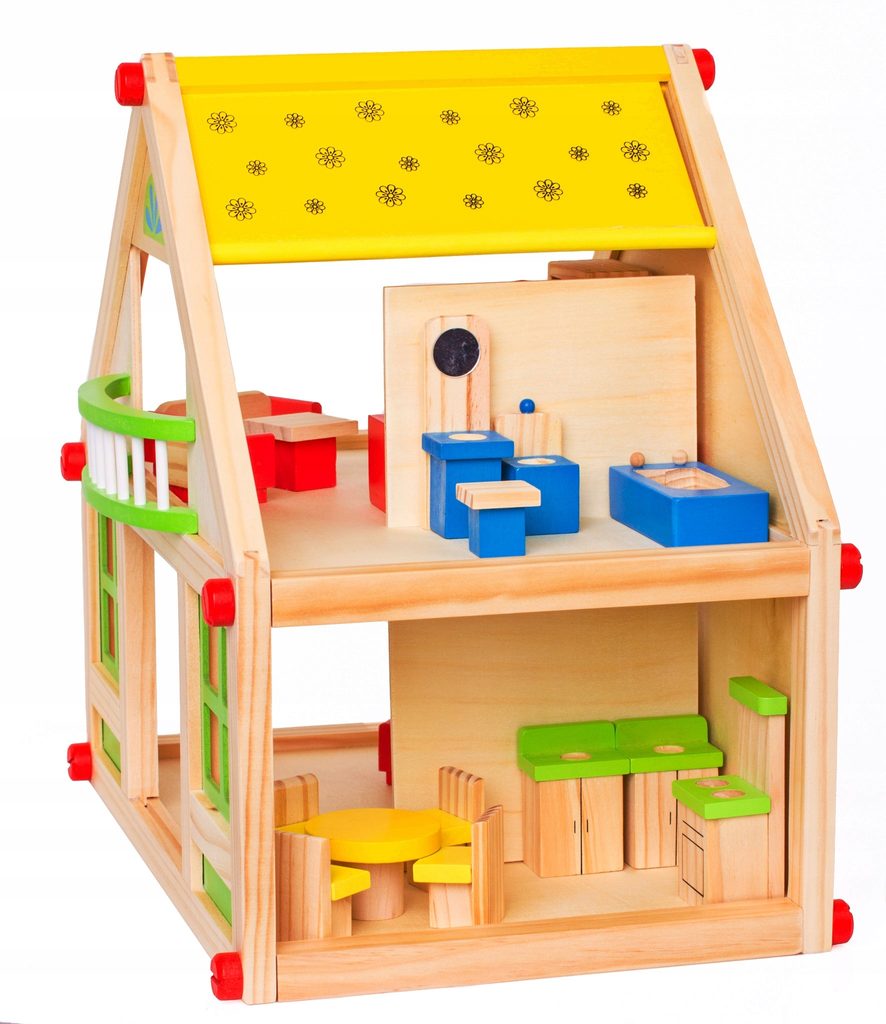 Nádherný dřevěný domeček pro panenky s přízemím a prvním patrem je snem každé malé princezny. Dítě si může jednotlivé díly nabarvit čím se stane domeček originálním. Pomocí všech věcí každodenní potřeby se dítě učí tvořivosti. Může také pozvat kamarády a užít si s nimi spoustu zábavy. Obsahuje 24 ks nábytku.