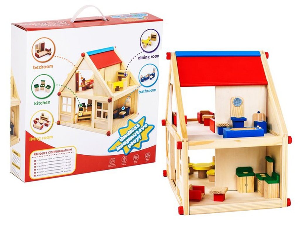 Nádherný dřevěný domeček pro panenky s přízemím a prvním patrem je snem každé malé princezny. Dítě si může jednotlivé díly nabarvit čím se stane domeček originálním. Pomocí všech věcí každodenní potřeby se dítě učí tvořivosti. Může také pozvat kamarády a užít si s nimi spoustu zábavy. Obsahuje 24 ks nábytku.