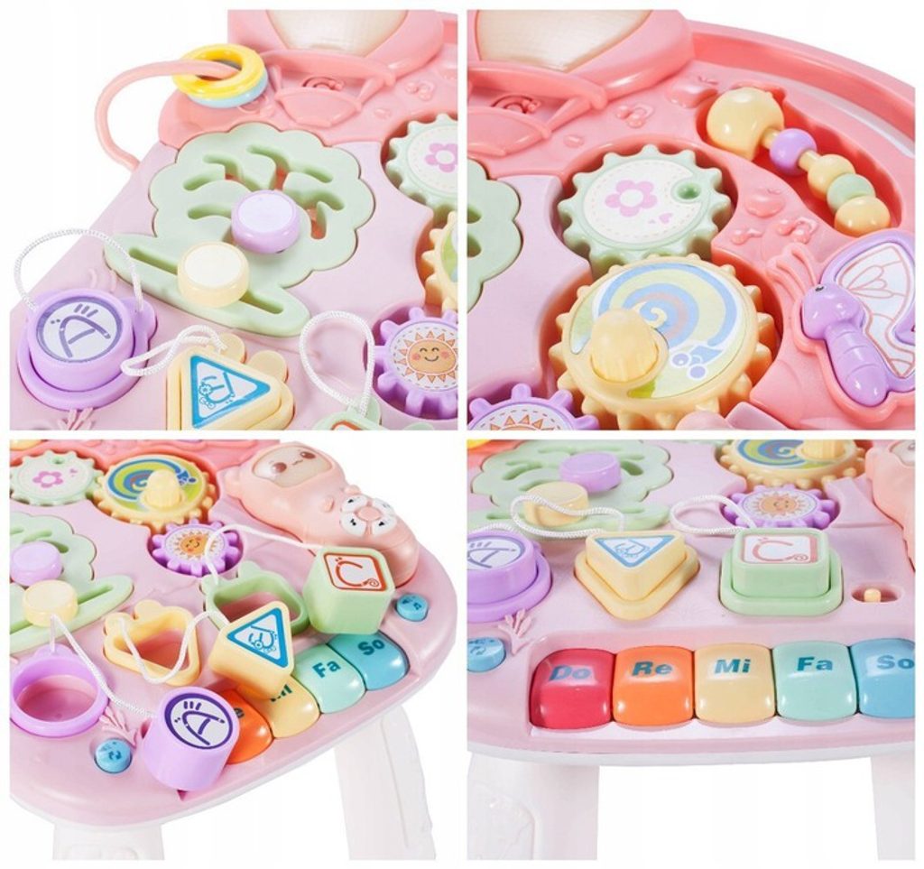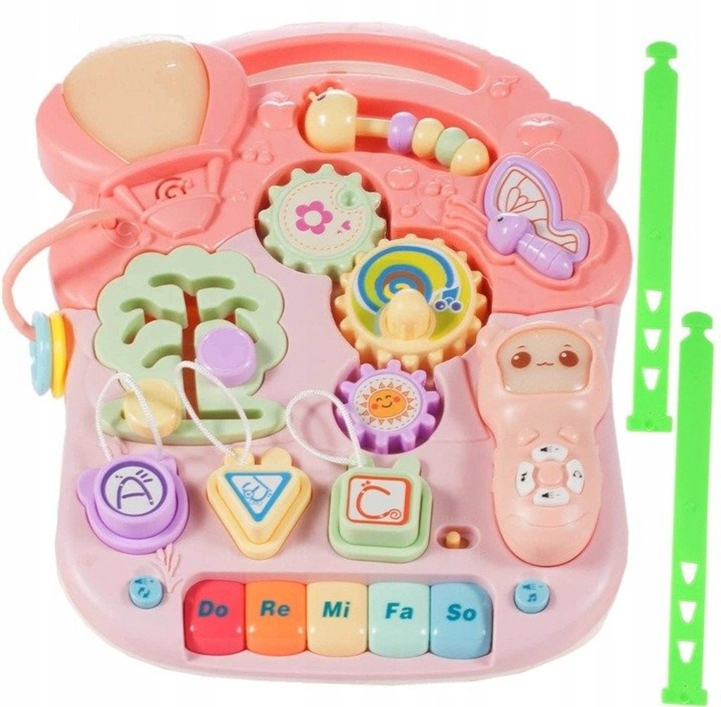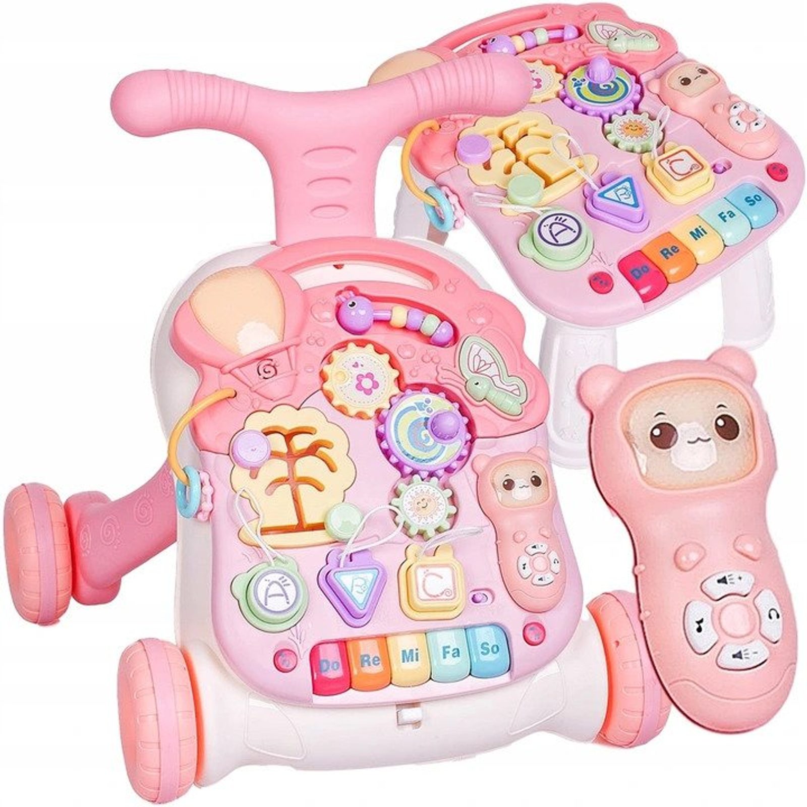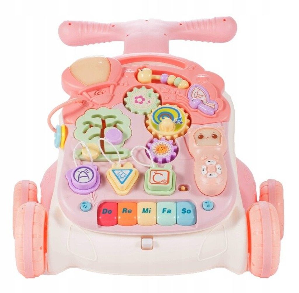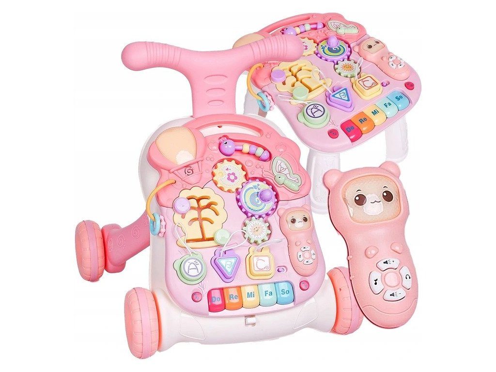 Dětské multifunkční chodítko pro ty nejmenší děti, edukační centrum. Lze ho využít jako samostatné chodítko, hudební stoleček pro sedící děti nebo lze multifunkční panel zavěsit nad postýlku. Panel je vybaven odnímatelným telefonem s 15 melodiemi a zvukem dětského smíchu, bludištěm, počítadlem, motýlkem s melodiemi, otáčivými ozubenými kolečky a spoustou dalších zábavných prvků. V horní části chodítka je umístěn držák pomocí kterého dítě snadno udrží rovnováhu a nespadne na zem. Kolečka mají protiskluzovou úpravu a brzdu. Určeno pro děti od 6 měsíců věku a je ideální hračkou pro nauku prvních krůčků.