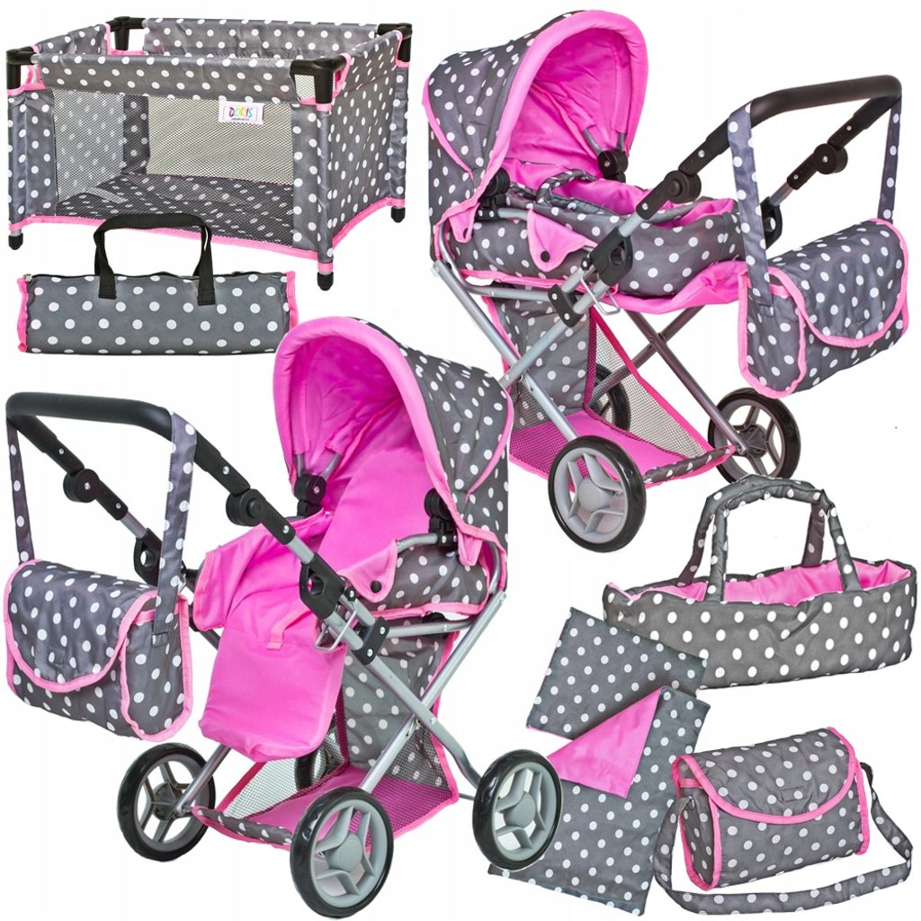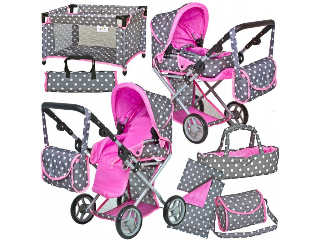 Velký set pro ty nejmenší holčičky. Kombinovaný kočárek pro panenky v několika nádherných barevných provedeních. Má velmi lehkou stabilní konstrukci vyrobenou z hliníkových trubek, svrchní část je z impregnované bavlny. Lze ji jednoduše sejmout a kdykoliv vyprat. Rukojeť kočárku je nastavitelná a obalená pěnou. Uvnitř kočárku je nosítko s úchytkami a povlečením sloužící k přenášení panenky. Před automatickým složením chrání dítě blokace. Panenka je proti vypadnutí zabezpečena bezpečnostním pásem. Pěnová kola s disky nezanechávají šmouhy na podlaze. Set dále obsahuje cestovní postýlku, peřinku s polštářkem a tašku na přenos postýlky.