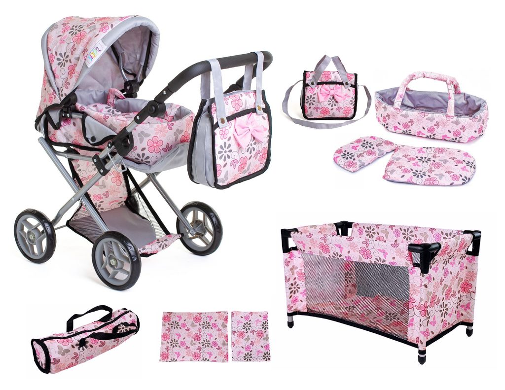 Velký set pro ty nejmenší holčičky. Kombinovaný kočárek pro panenky v několika nádherných barevných provedeních. Má velmi lehkou stabilní konstrukci vyrobenou z hliníkových trubek, svrchní část je z impregnované bavlny. Lze ji jednoduše sejmout a kdykoliv vyprat. Rukojeť kočárku je nastavitelná a obalená pěnou. Uvnitř kočárku je nosítko s úchytkami a povlečením sloužící k přenášení panenky. Před automatickým složením chrání dítě blokace. Panenka je proti vypadnutí zabezpečena bezpečnostním pásem. Pěnová kola s disky nezanechávají šmouhy na podlaze. Set dále obsahuje cestovní postýlku, peřinku s polštářkem a tašku na přenos postýlky.