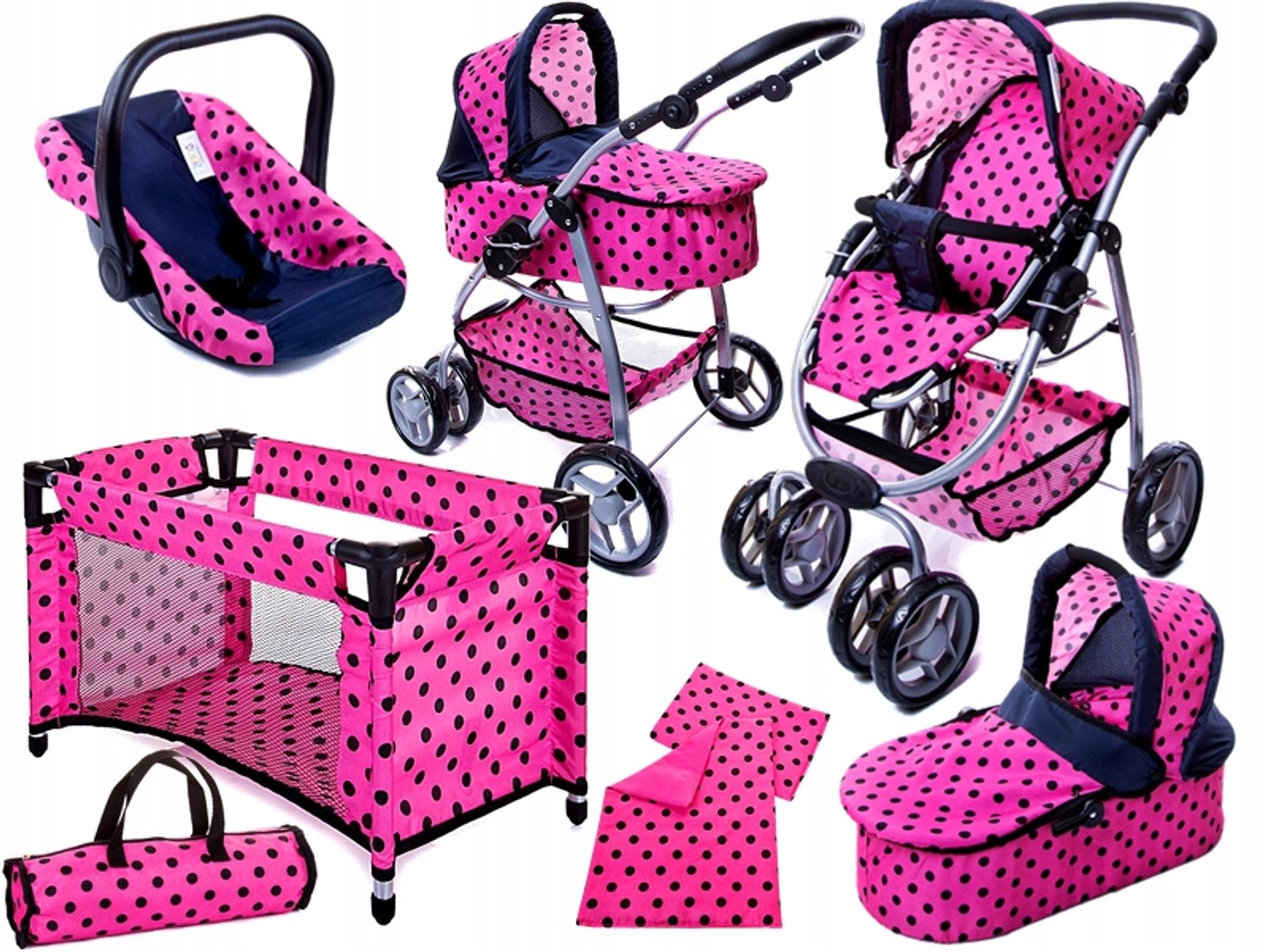 Velký set pro holčičky od 4 do 8 let. Kočárek má velmi lehkou stabilní konstrukci vyrobenou z hliníkových trubek, svrchní část je z impregnované bavlny. Lze ji jednoduše sejmout a kdykoliv vyprat. Rukojeť kočárku je nastavitelná a obalená pěnou. Uvnitř kočárku je korbička sloužící k snadnéme přenášení panenky. Před automatickým složením chrání dítě blokace. Panenka je ve sportovní verzi proti vypadnutí zabezpečena bezpečnostním pásem. Jednoduchá změna z hluboké na sportovní verzi. Set dále obsahuje cestovní postýlku, peřinku s polštářkem, tašku na přenos postýlky ,autosedačku a přebalovací tašku. Vhodné pro panenky do 45 cm.