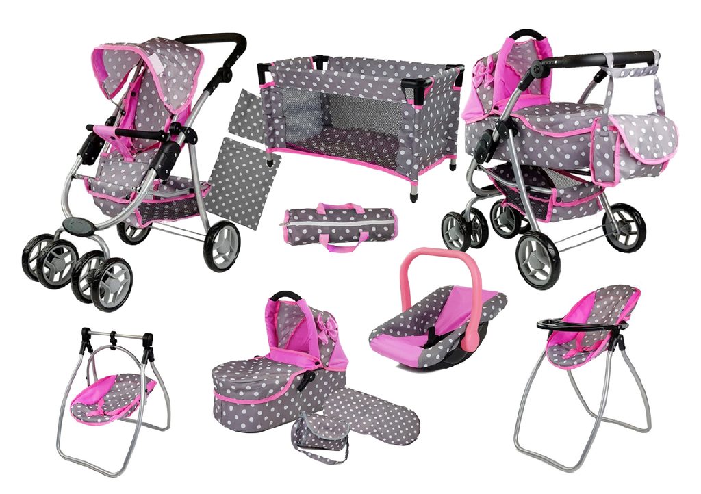 Největší set pro holčičky od 4 do 8 let. Kočárek má velmi lehkou stabilní konstrukci vyrobenou z hliníkových trubek, svrchní část je z impregnované bavlny. Lze ji jednoduše sejmout a kdykoliv vyprat. Rukojeť kočárku je nastavitelná a obalená pěnou. Uvnitř kočárku je korbička sloužící k snadnému přenášení panenky. Před automatickým složením chrání dítě blokace. Panenka je ve sportovní verzi proti vypadnutí zabezpečena bezpečnostním pásem. Jednoduchá změna z hluboké na sportovní verzi. Set dále obsahuje cestovní postýlku, peřinku s polštářkem, tašku na přenos postýlky ,autosedačku, přebalovací tašku, jídelní židličku a houpátko pro panenku 2v1. Vhodné pro panenku do 45 cm.