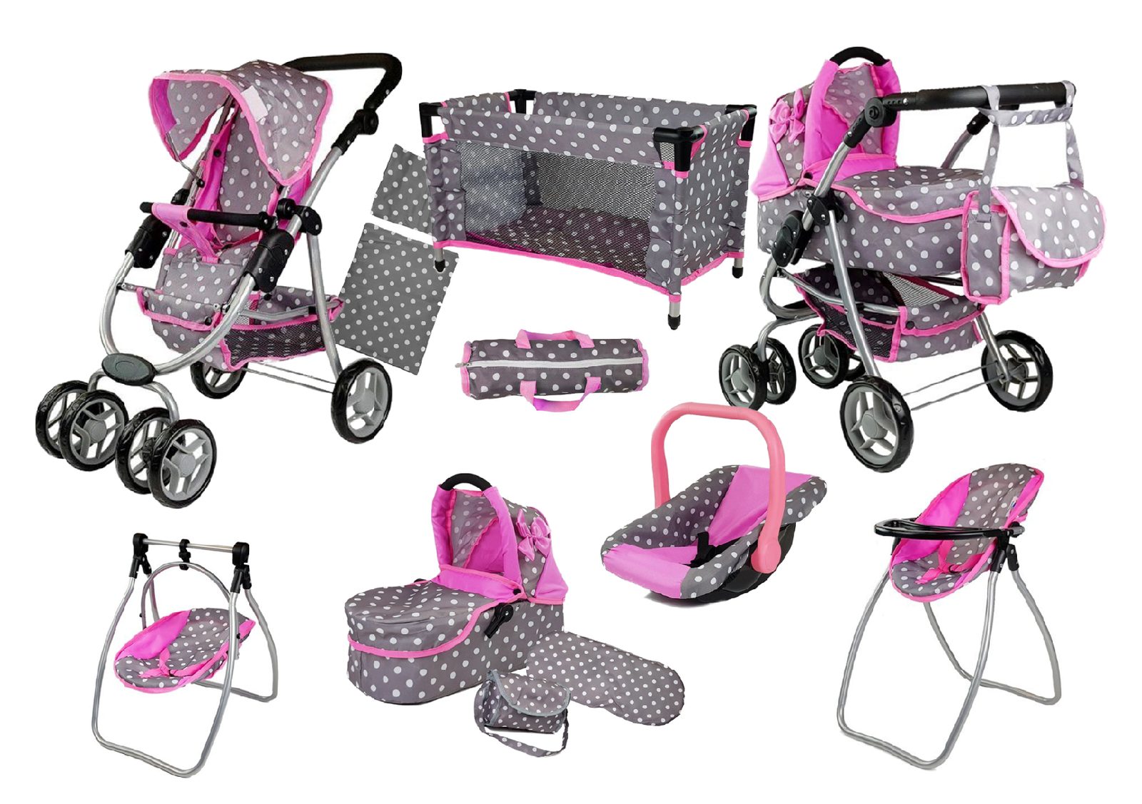 • obsahuje : sportovní kočárek pro panenku 3v1, cestovní postýlku, tašku na postýlku, peřinku z polštářkem, autosedačku, přebalovací tašku, jídelní židličku a houpátko pro panenku 2v1