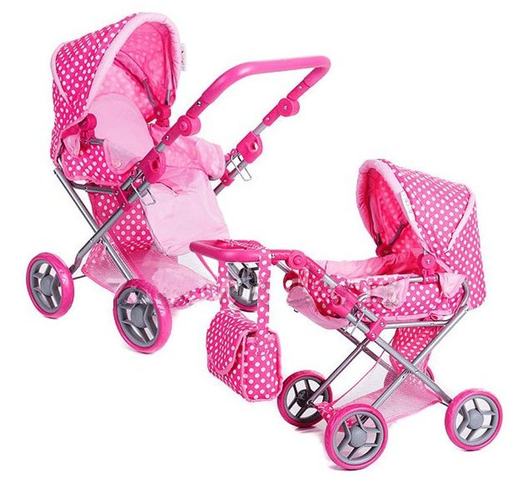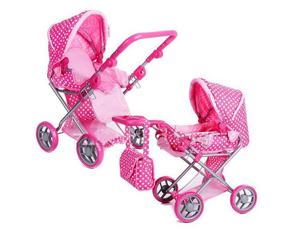 Kombinovaný kočárek pro panenky v několika nádherných barevných provedeních. Má velmi lehkou stabilní konstrukci vyrobenou z hliníkových trubek, svrchní část je z impregnované bavlny. Lze ji jednoduše sejmout a kdykoliv vyprat. Rukojeť kočárku je nastavitelná a obalená pěnou. Uvnitř kočárku je nosítko s úchytkami a povlečením sloužící k přenášení panenky. Před automatickým složením chrání dítě blokace. Panenka je proti vypadnutí zabezpečena bezpečnostním pásem. Pěnová kola s disky nezanechávají šmouhy na podlaze.