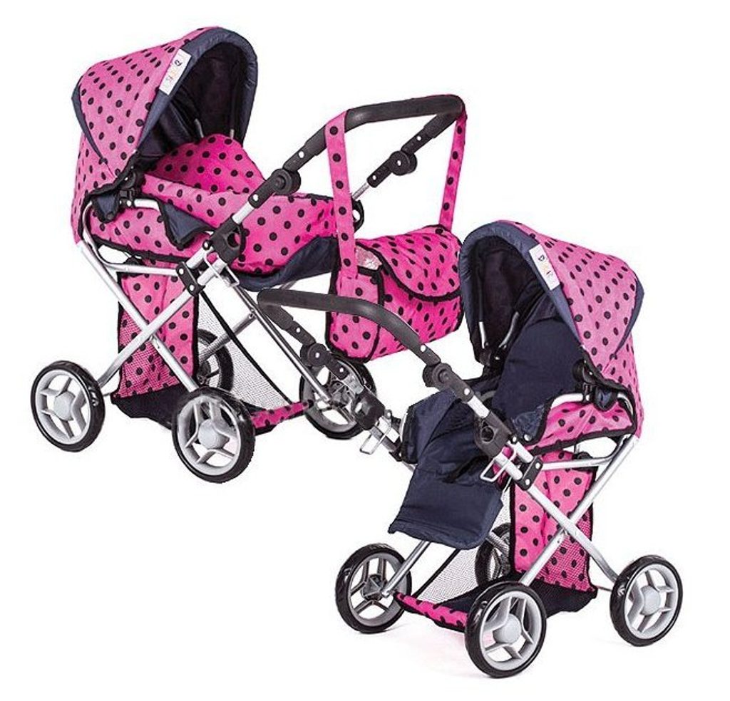 Kombinovaný kočárek pro panenky v několika nádherných barevných provedeních. Má velmi lehkou stabilní konstrukci vyrobenou z hliníkových trubek, svrchní část je z impregnované bavlny. Lze ji jednoduše sejmout a kdykoliv vyprat. Rukojeť kočárku je nastavitelná a obalená pěnou. Uvnitř kočárku je nosítko s úchytkami a povlečením sloužící k přenášení panenky. Před automatickým složením chrání dítě blokace. Panenka je proti vypadnutí zabezpečena bezpečnostním pásem. Pěnová kola s disky nezanechávají šmouhy na podlaze.