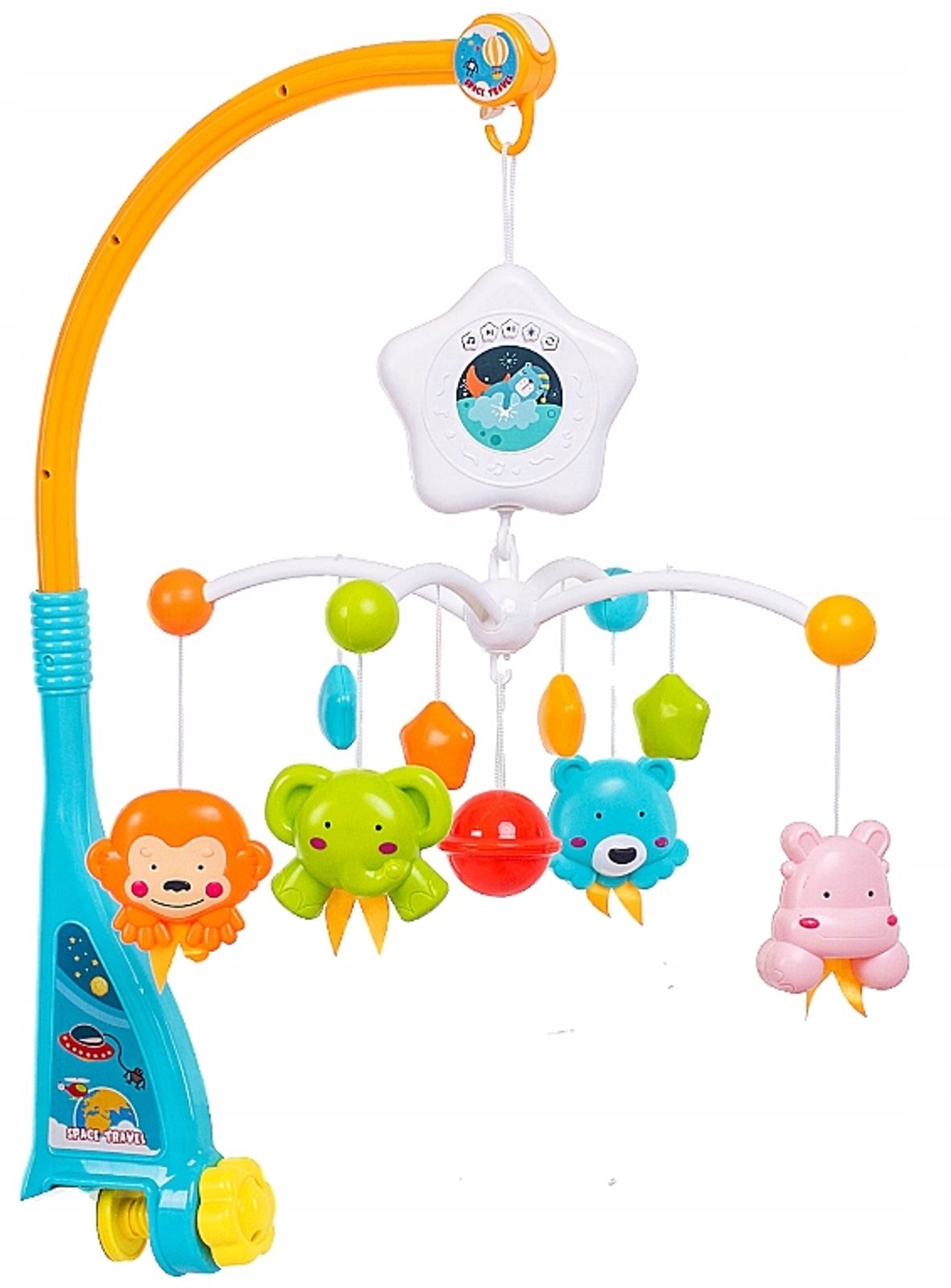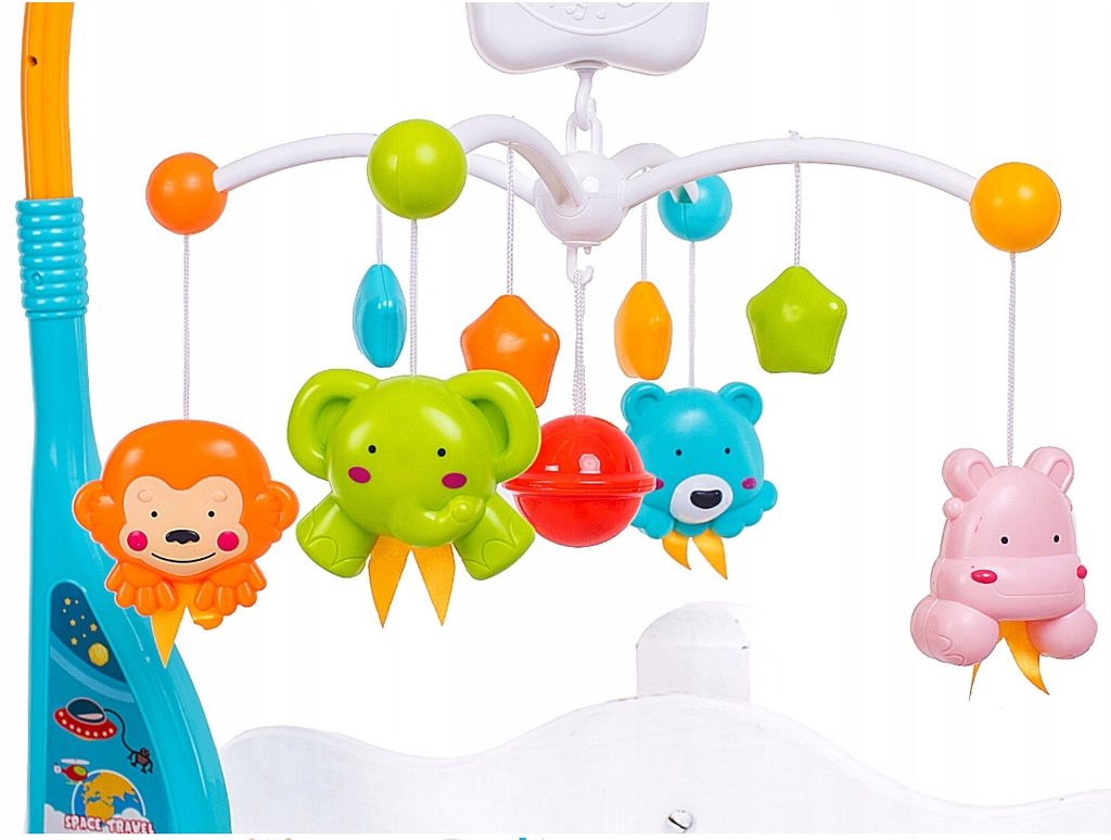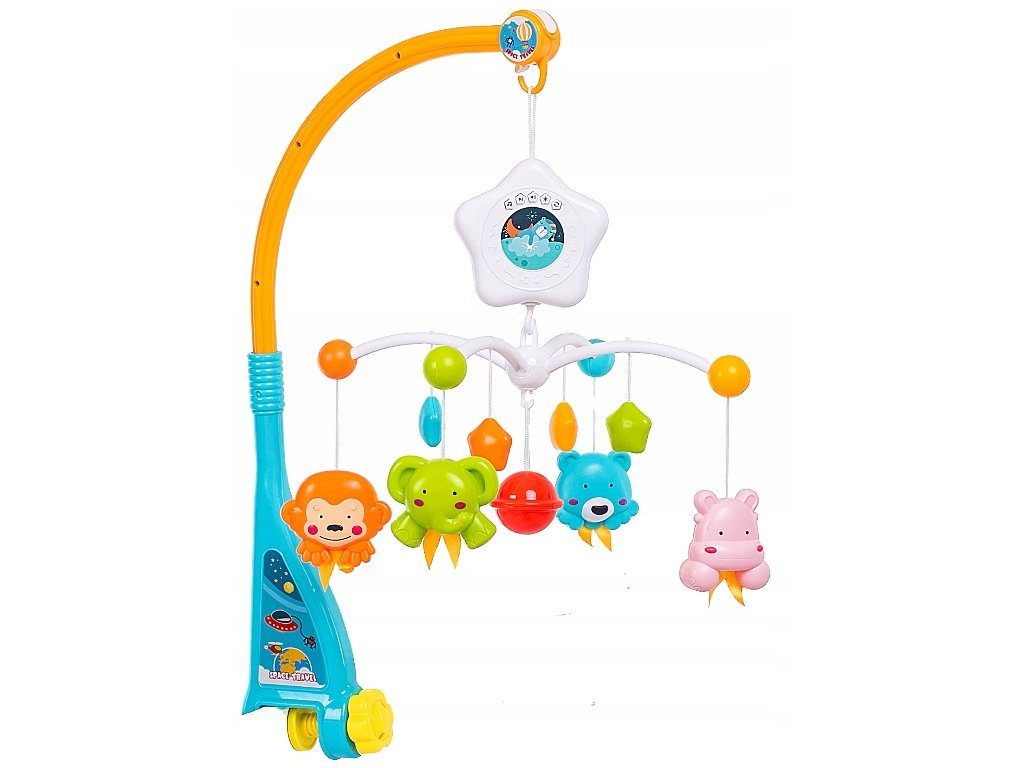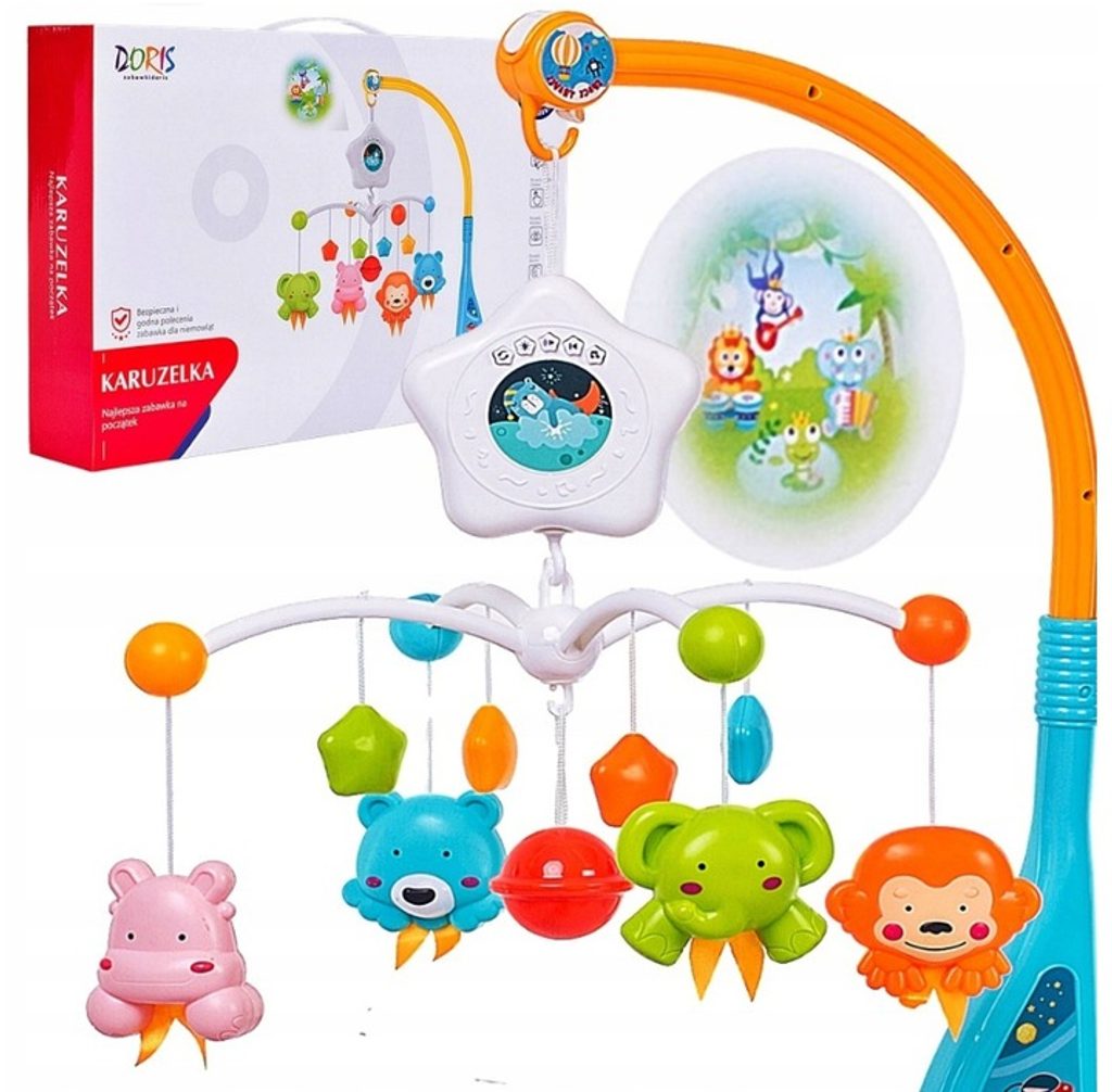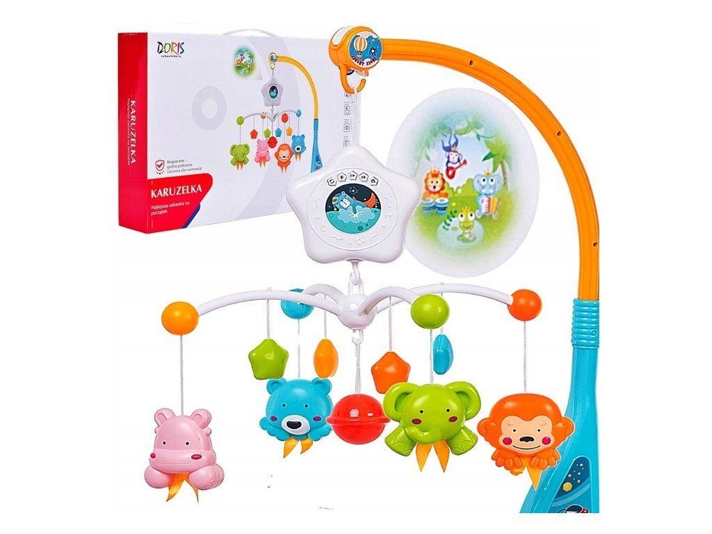 Nádherný dětský kolotoč Doris Space Travel se 4 zavěšenými hračkami, chrastítkem a projektorem, který zobrazuje obrázky zvířátek na stropě pomůže každému dítětu hravě usnout. Hračky lze odejmout a použít samostatně. Kolotoč je vybaven uklidňujícími melodiemi, vypínačem zvuku a regulací hlasitosti. Lze ho snadno demontovat, můžete to ho tak umístit i nad kočárek. Je určen pro děti od narození.