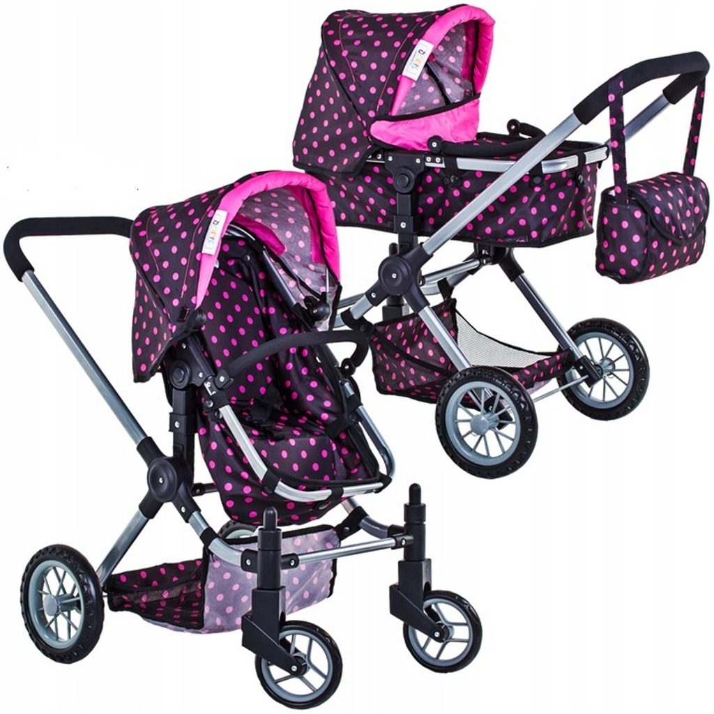 Kombinovaný kočárek pro panenky 2v1. Má velmi lehkou stabilní konstrukci vyrobenou z hliníkových trubek, svrchní část je z impregnované bavlny. Lze ji jednoduše sejmout a kdykoliv vyprat. Před automatickým složením chrání dítě blokace. Panenka je ve sportovní verzi proti vypadnutí zabezpečena bezpečnostním pásem. Jednoduchá změna z hluboké na sportovní verzi. Ve spodní části je umístěn koš a kočárek má praktickou závěsnou tašku.