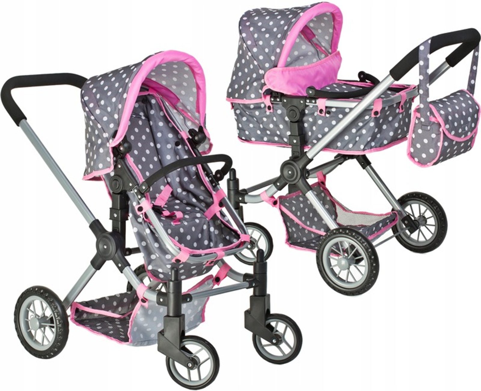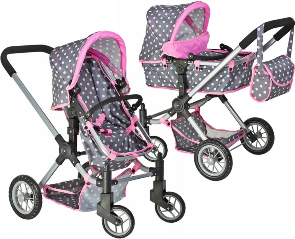 Kombinovaný kočárek pro panenky 2v1. Má velmi lehkou stabilní konstrukci vyrobenou z hliníkových trubek, svrchní část je z impregnované bavlny. Lze ji jednoduše sejmout a kdykoliv vyprat. Před automatickým složením chrání dítě blokace. Panenka je ve sportovní verzi proti vypadnutí zabezpečena bezpečnostním pásem. Jednoduchá změna z hluboké na sportovní verzi. Ve spodní části je umístěn koš a kočárek má praktickou závěsnou tašku.