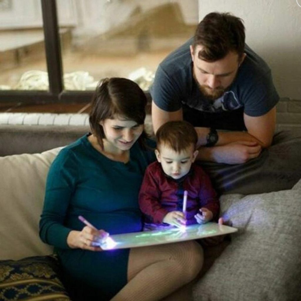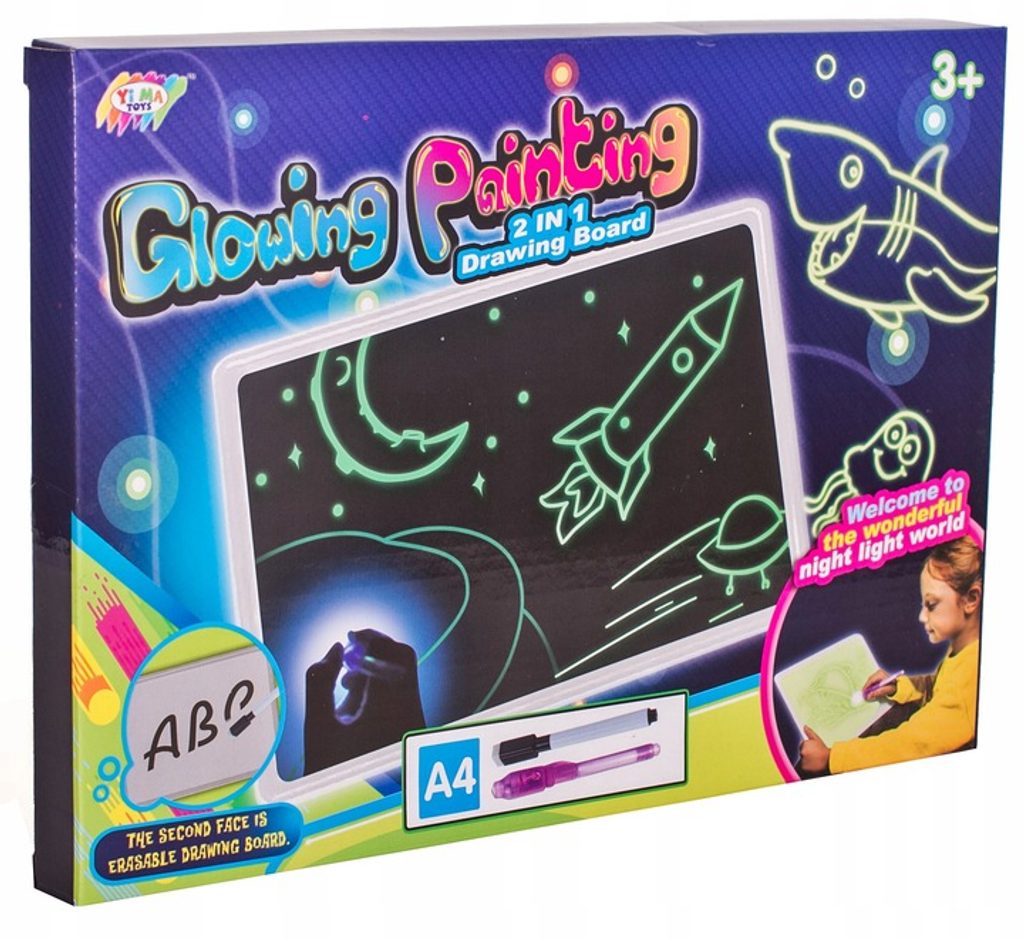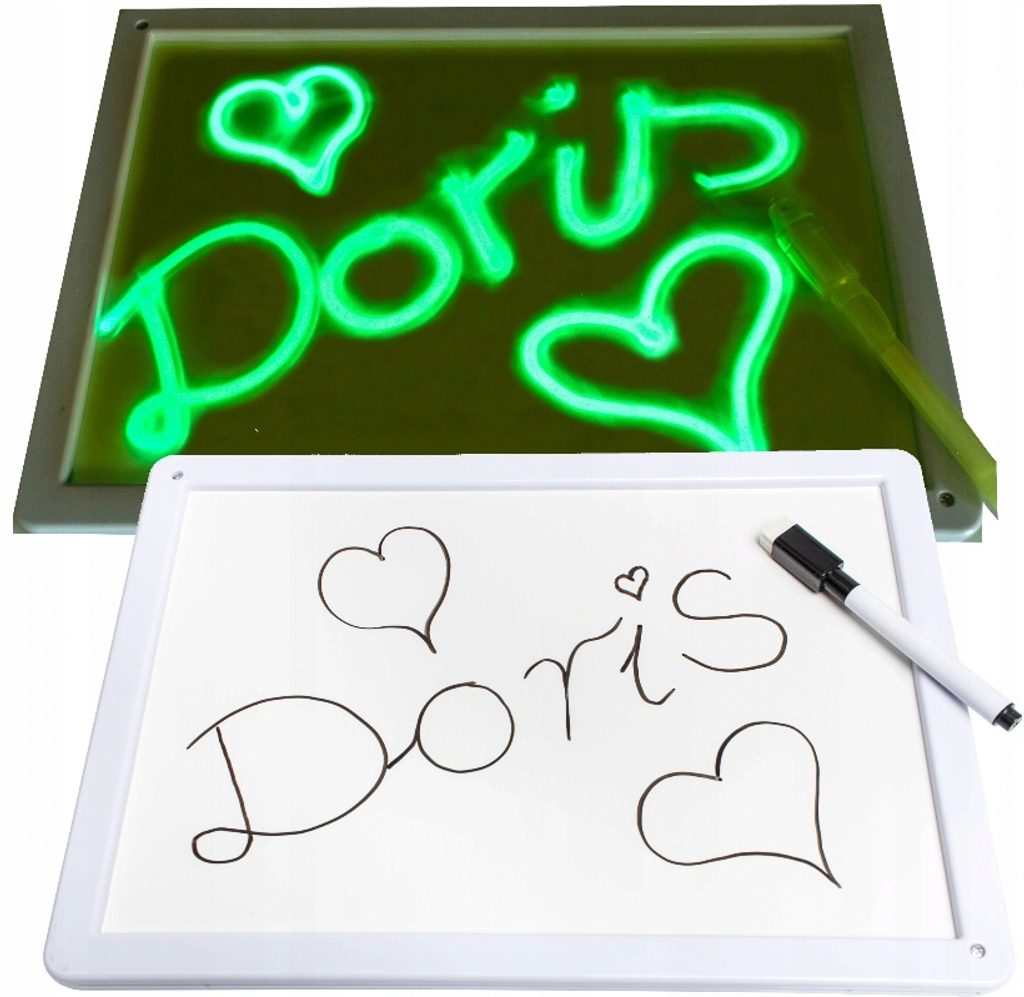 Dětská kreslící tabule Doris 2v1 Glowing Painting pro kreslení je ideální hračkou pro rozvoj dětské kreativity a tvořivosti. Na tabulku lze kreslit klasickým nebo UV fixem. Ten má v sobě umístěno LED světýlko, takže po nasvícení ve tmě vše nakreslené svítí. Po určité době potom vše zmizí. Zábava je tak nekonečná. Součástí balení jsou i 2 kreslící šablony. Hračka je určena pro děti od 36 měsíců věku.