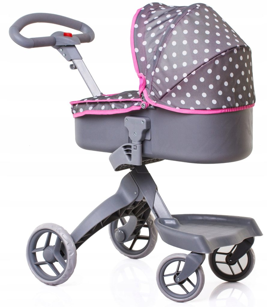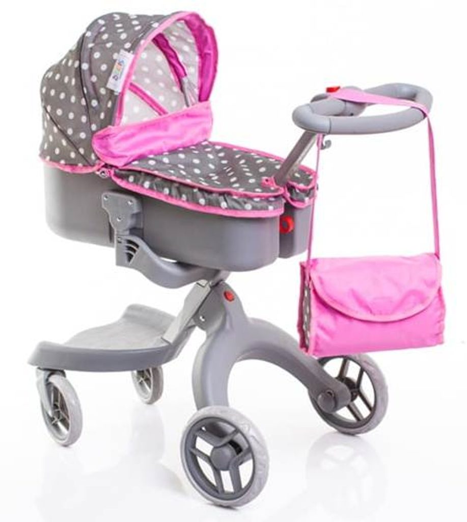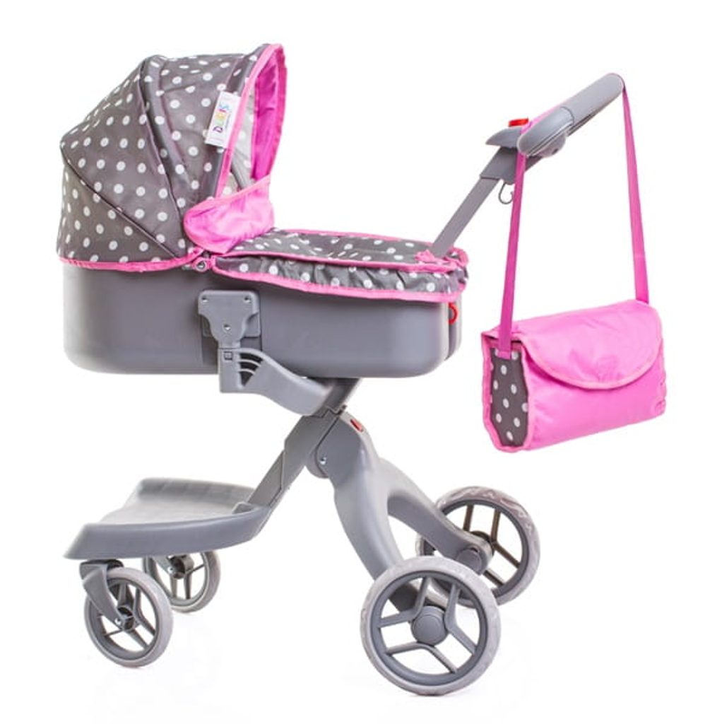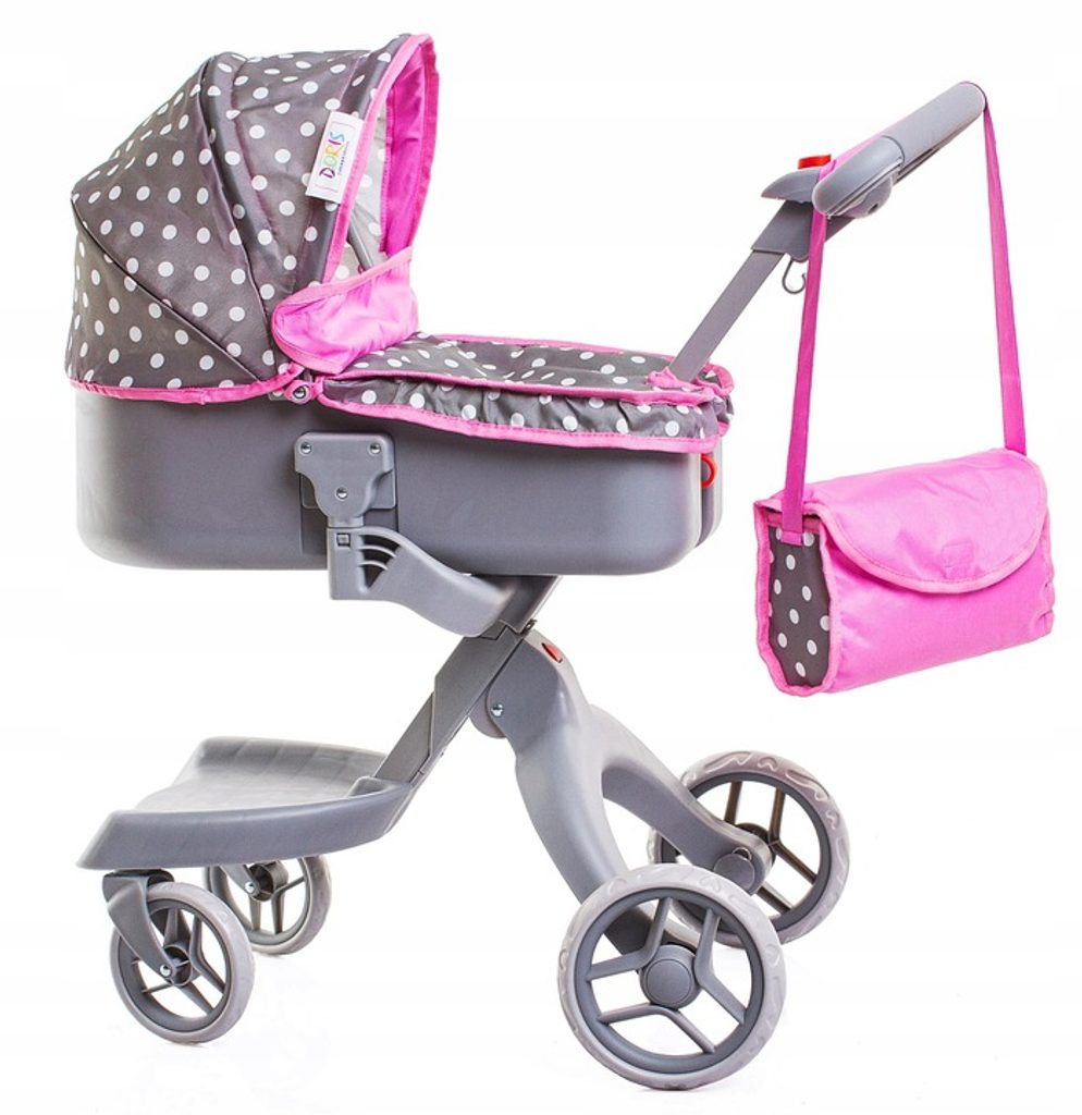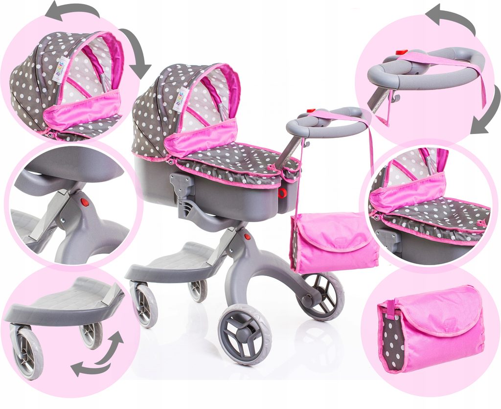 Moderní hluboký kočárek pro panenky Doris 9361 má velmi lehkou stabilní konstrukci vyrobenou z plastu a hliníku, svrchní část je z impregnované bavlny. Rukojeť kočárku je nastavitelná od 56 do 76 cm. Přední kola kočárku jsou otočná. Ve spodní části je umístěna polička na drobnosti, součástí kočárku je i látková taštička. Je vhodný pro panenky do velikosti 45 cm.
