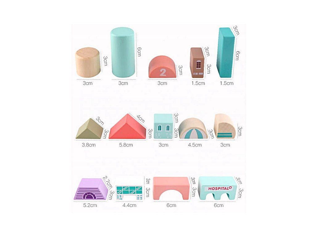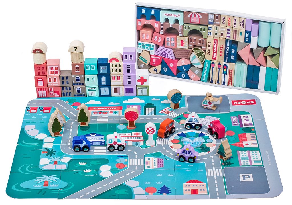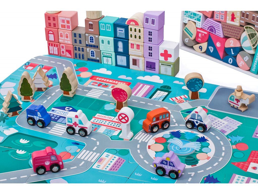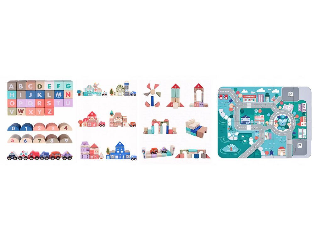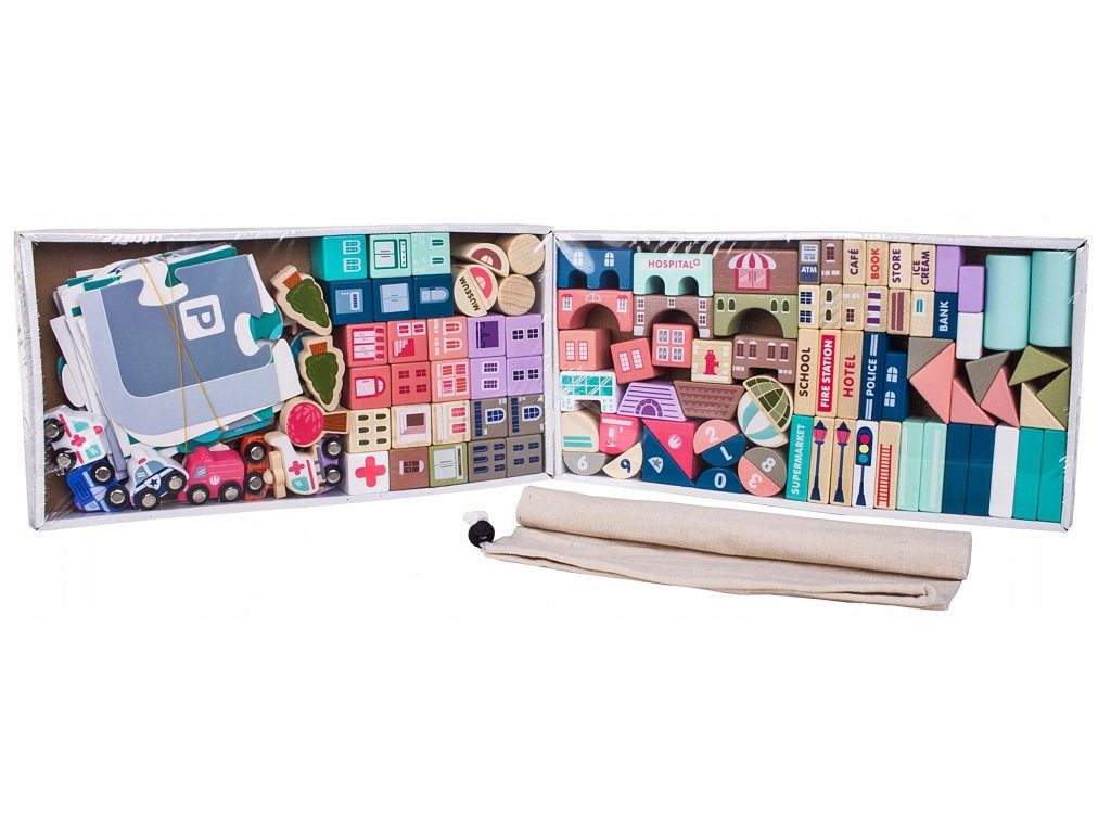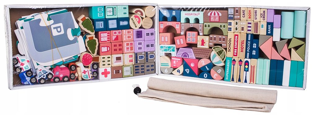 Doris sada 115 kusů barevných dřevěných kostek se kterých si může dítě postavit kompletní městečko. Kostky jsou ve tvaru budov jako je hotel, nemocnice, banka a mnoho dalších. Další kostky jsou ve tvaru autíček a také zde naleznete kostky s vyobrazením písmen a číslic. Součástí balení je podložka s ulicemi na které se může městečko postavit. Všechny kostky mají zaoblené hrany, jsou vyrobeny pouze z kvalitního dřeva. Hra s nimi podporuje u dětí představivost a motoriku. Součástí balení je látkový pytlík. Hračka je určena pro děti od 36 měsíců věku.