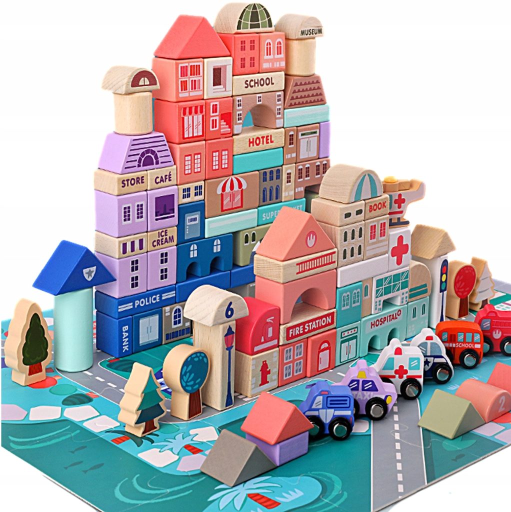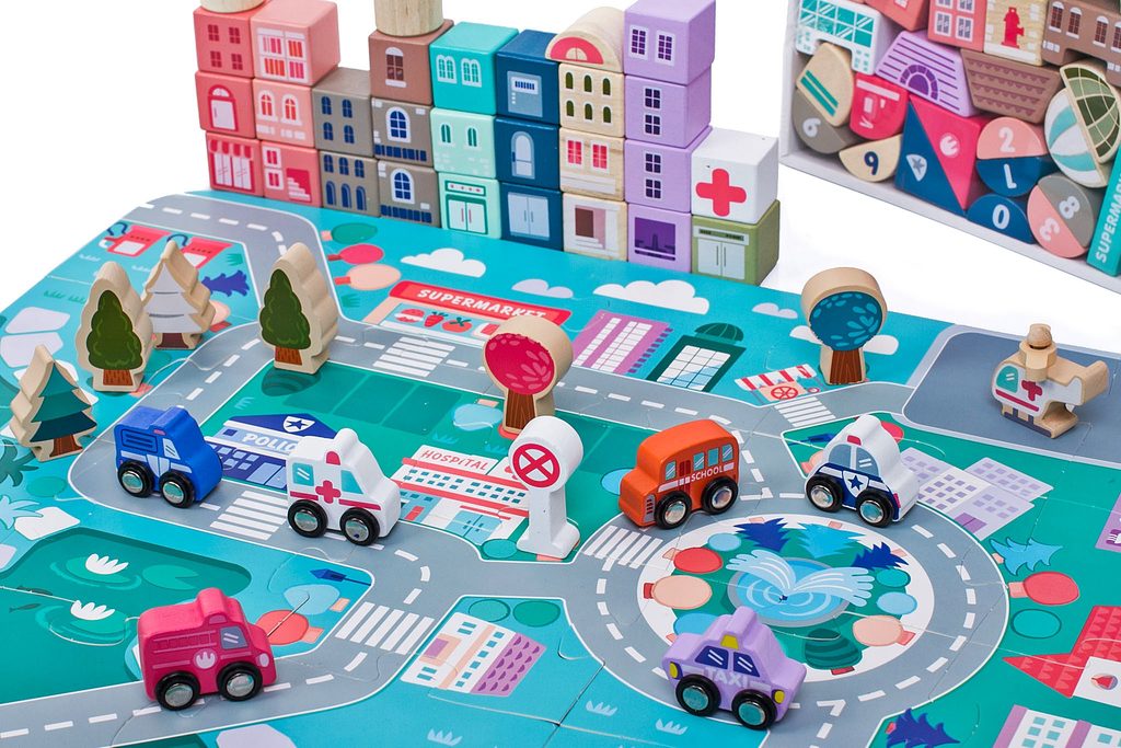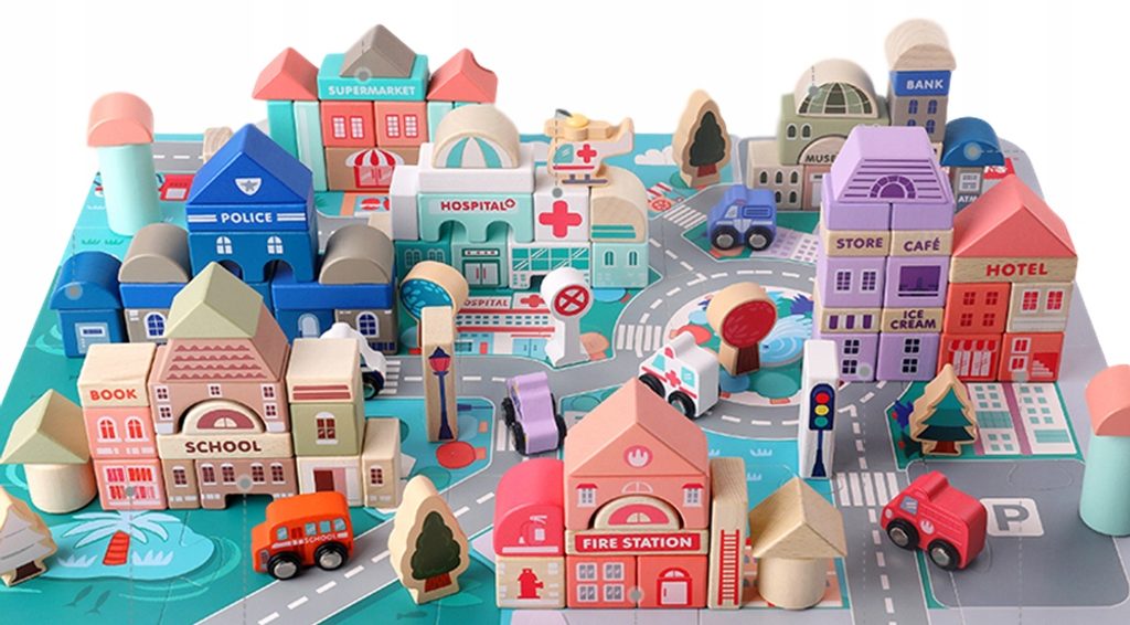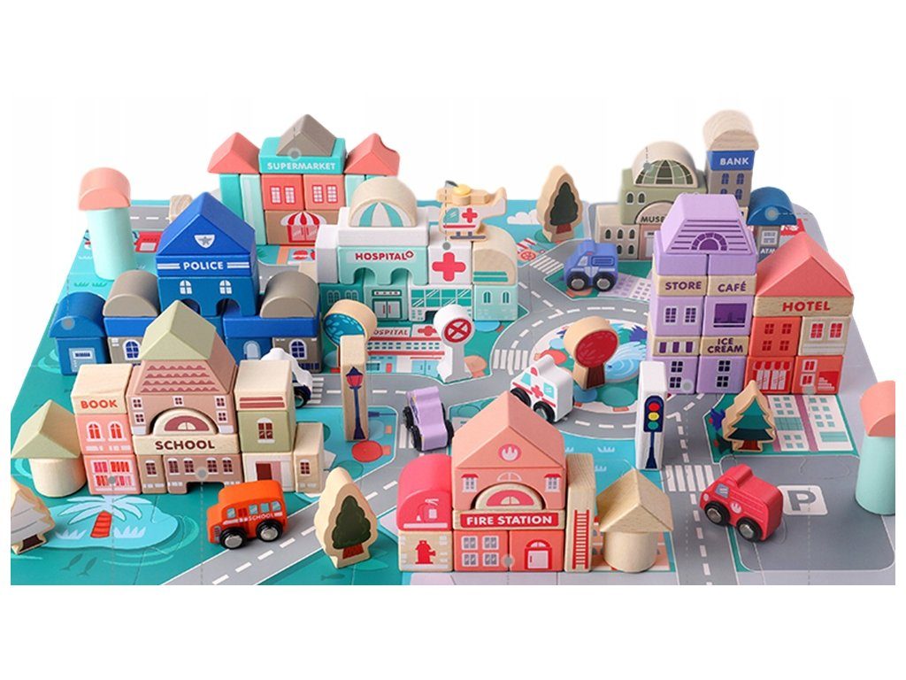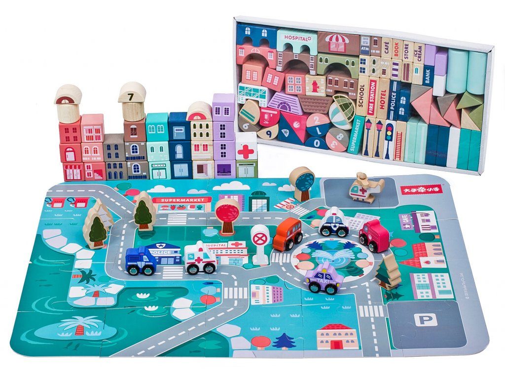 Doris sada 115 kusů barevných dřevěných kostek se kterých si může dítě postavit kompletní městečko. Kostky jsou ve tvaru budov jako je hotel, nemocnice, banka a mnoho dalších. Další kostky jsou ve tvaru autíček a také zde naleznete kostky s vyobrazením písmen a číslic. Součástí balení je podložka s ulicemi na které se může městečko postavit. Všechny kostky mají zaoblené hrany, jsou vyrobeny pouze z kvalitního dřeva. Hra s nimi podporuje u dětí představivost a motoriku. Součástí balení je látkový pytlík. Hračka je určena pro děti od 36 měsíců věku.