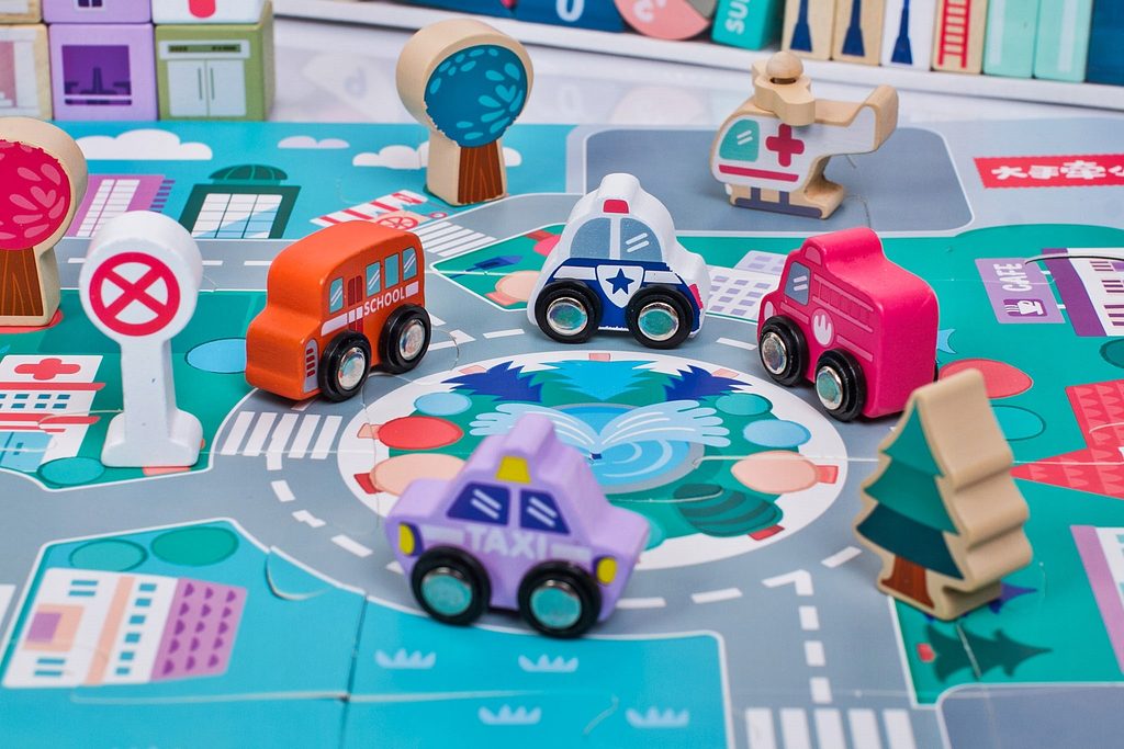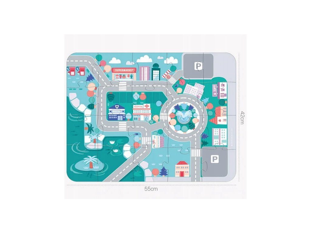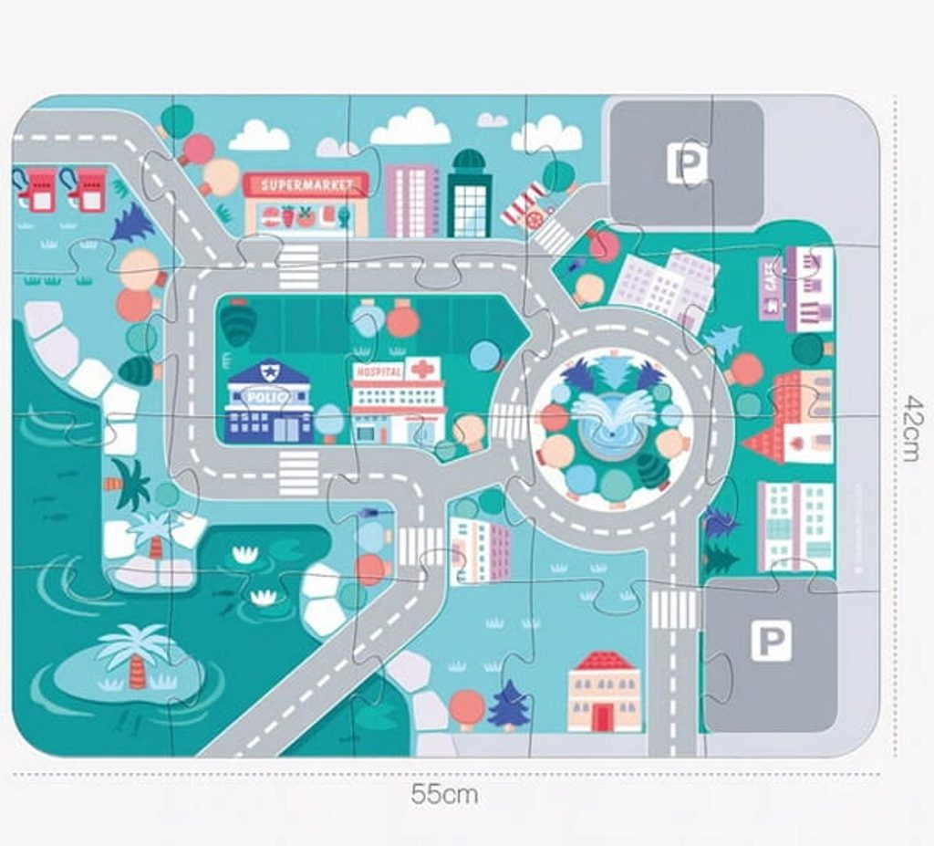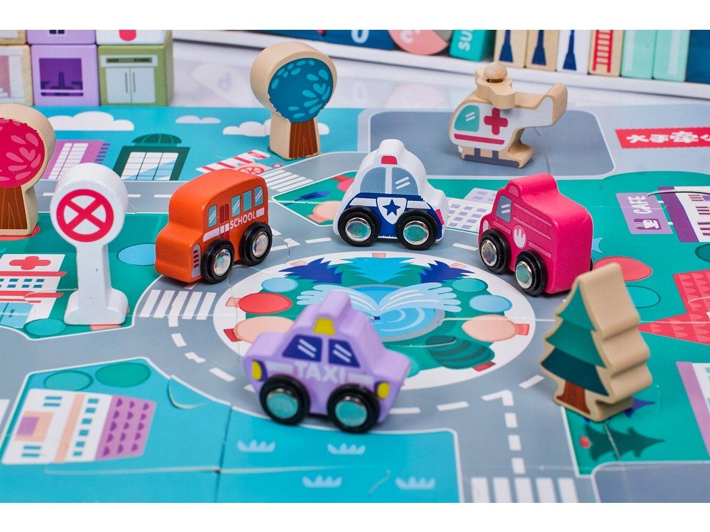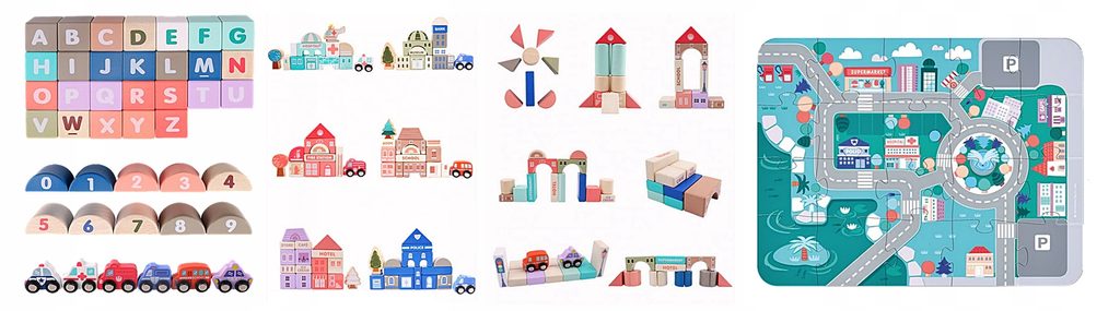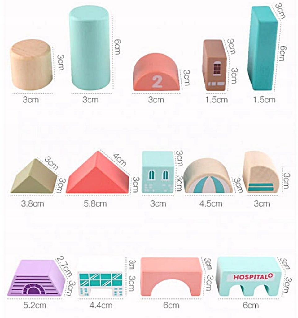 Doris sada 115 kusů barevných dřevěných kostek se kterých si může dítě postavit kompletní městečko. Kostky jsou ve tvaru budov jako je hotel, nemocnice, banka a mnoho dalších. Další kostky jsou ve tvaru autíček a také zde naleznete kostky s vyobrazením písmen a číslic. Součástí balení je podložka s ulicemi na které se může městečko postavit. Všechny kostky mají zaoblené hrany, jsou vyrobeny pouze z kvalitního dřeva. Hra s nimi podporuje u dětí představivost a motoriku. Součástí balení je látkový pytlík. Hračka je určena pro děti od 36 měsíců věku.