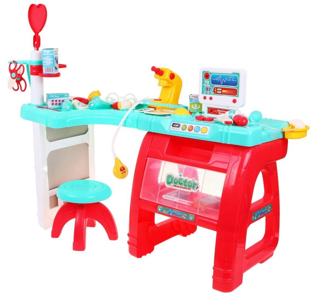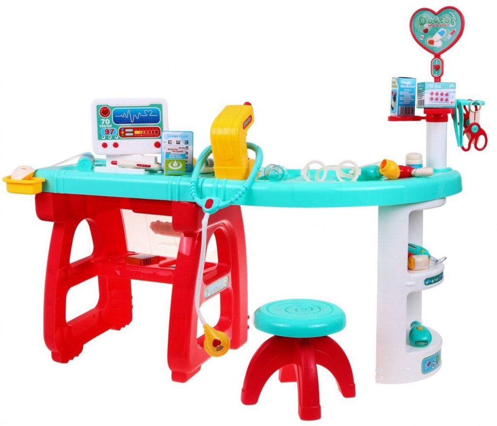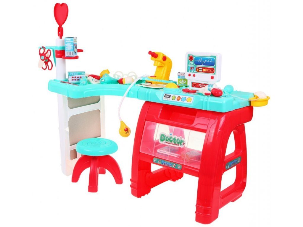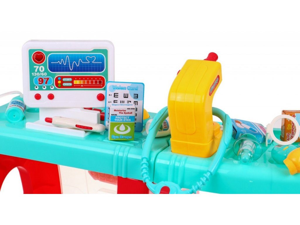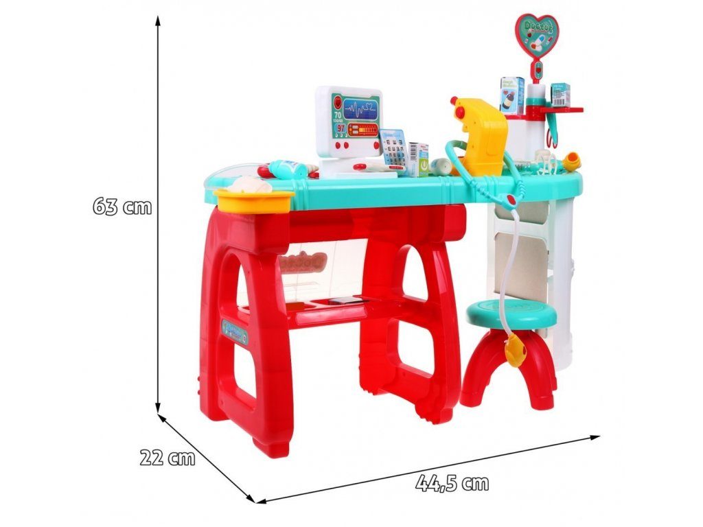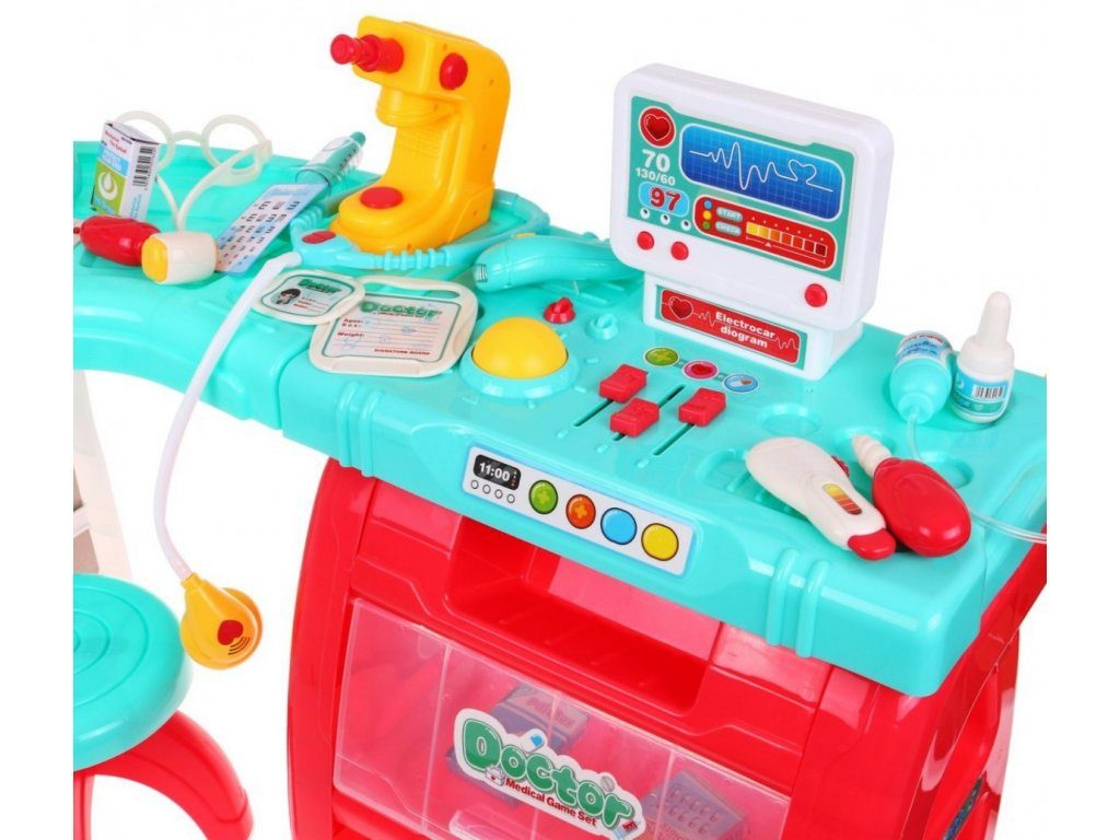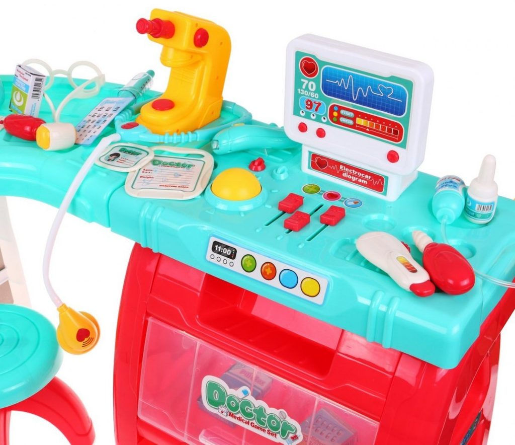 Souprava Malý doktor se zvuky a světlem je určena pro děti od 36 měsíců věku. Je vybavena celkem 27 elementy. Jako základ slouží lékařský stůl se židličkou a dále zde najdete přístroj na měření EKG, stetoskop, teploměr, karta pacienta, lékařské brýle, imitace léků, mikroskop a mnoho dalších užitečných věcí, které potřebuje malý doktor nebo doktorka ke své práci. Vaše dítě se určitě s touto velkou hračkou nudit nebude. Je vyrobena z kvalitního plastu v pestrobarevném provedení.