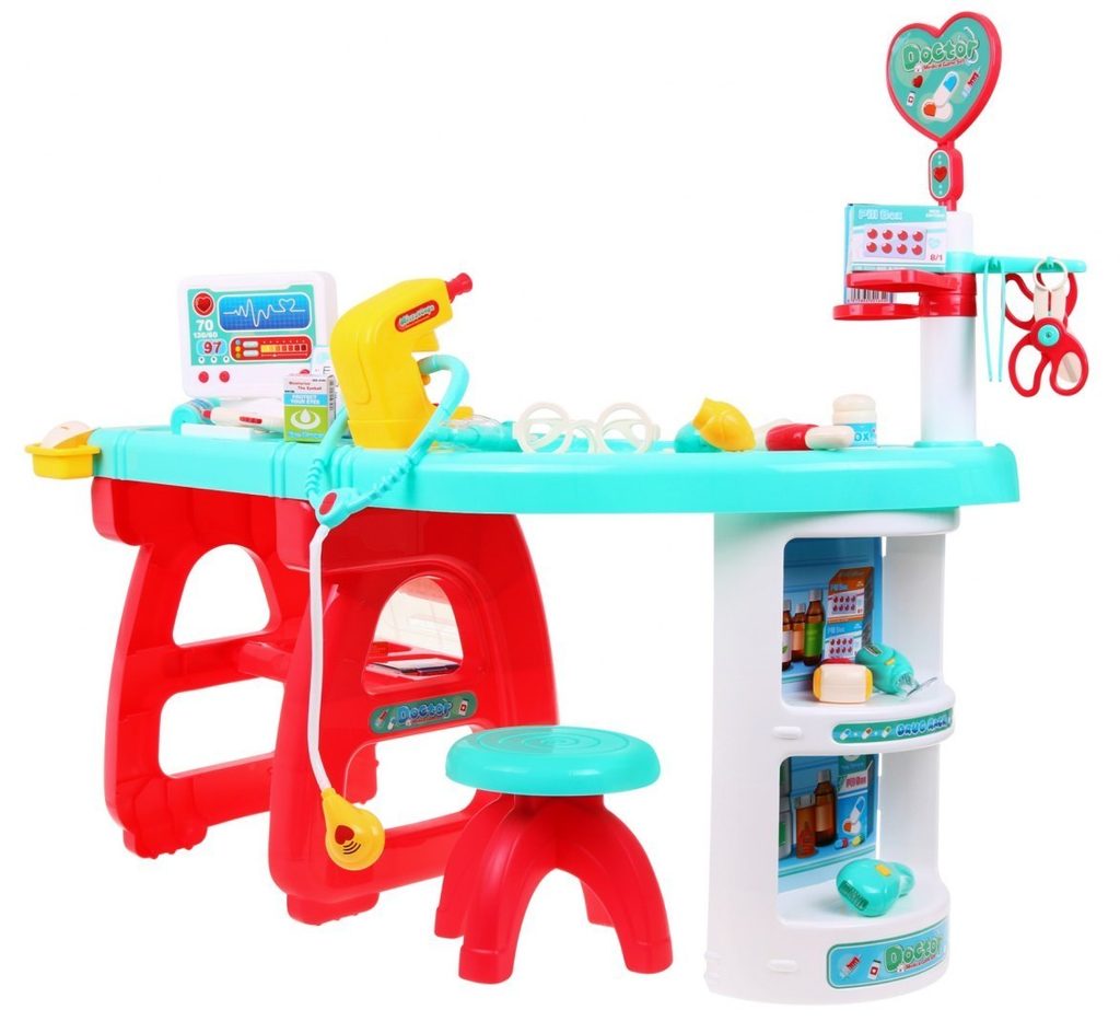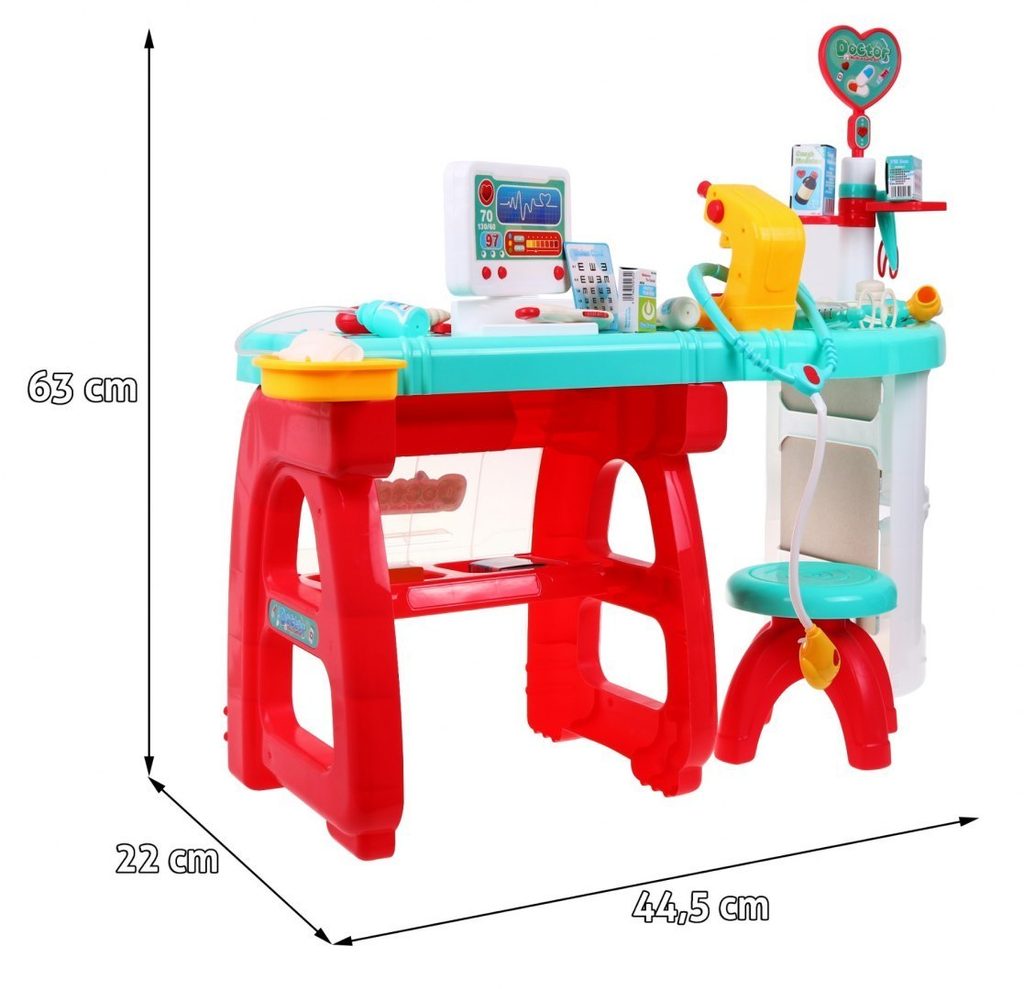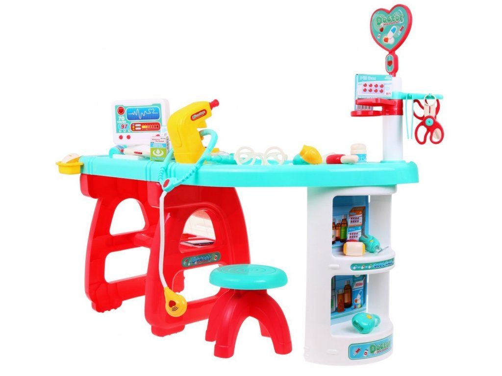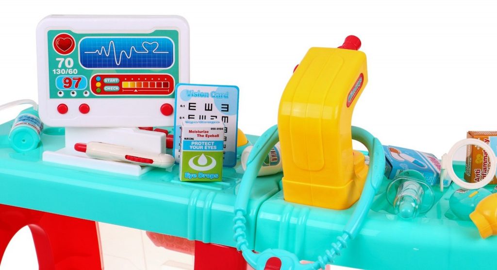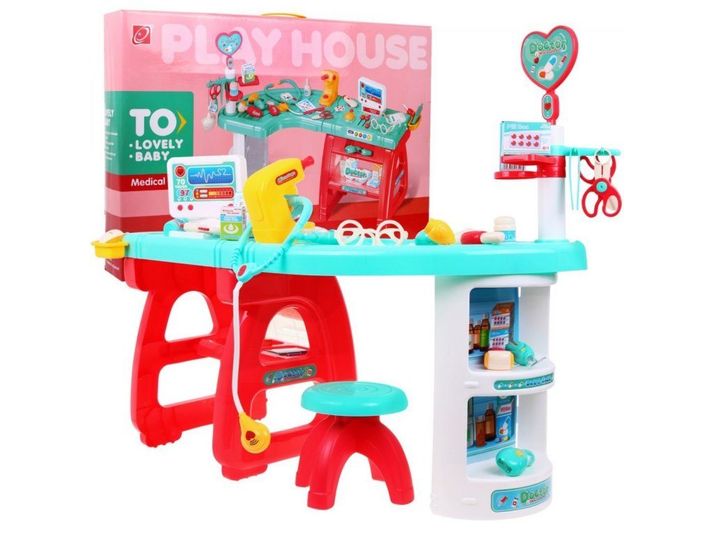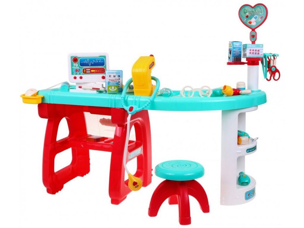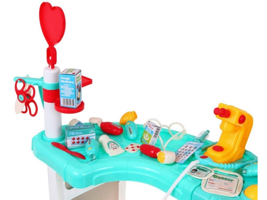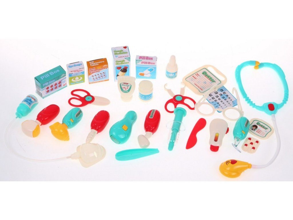 Souprava Malý doktor se zvuky a světlem je určena pro děti od 36 měsíců věku. Je vybavena celkem 27 elementy. Jako základ slouží lékařský stůl se židličkou a dále zde najdete přístroj na měření EKG, stetoskop, teploměr, karta pacienta, lékařské brýle, imitace léků, mikroskop a mnoho dalších užitečných věcí, které potřebuje malý doktor nebo doktorka ke své práci. Vaše dítě se určitě s touto velkou hračkou nudit nebude. Je vyrobena z kvalitního plastu v pestrobarevném provedení.