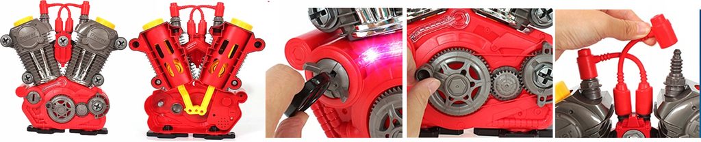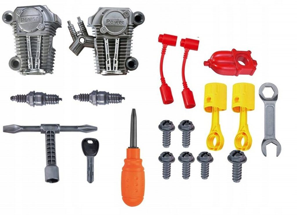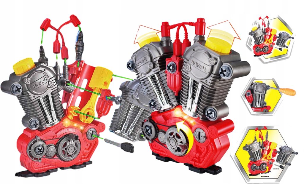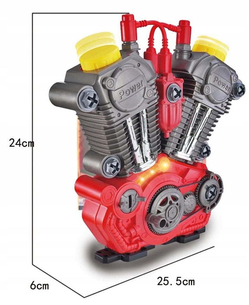 Šroubovací motor se zvuky a světlem Funny Engine je ideální hračkou pro rozvoj manuální zručnosti a logického myšlení. Jednotlivá části motoru lze demontovat a otáčet. Je vybaven pohyblivými písty a otočným klínovým řemenem. Součástí sady je celkem 20 kusů příslušenství. Najdete zde klíče, šroubovák, motorové svíčky, gumové kabely k zapalování, šrouby a další. Hračka je určena pro děti od 36 měsíců věku.