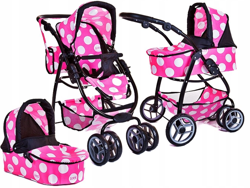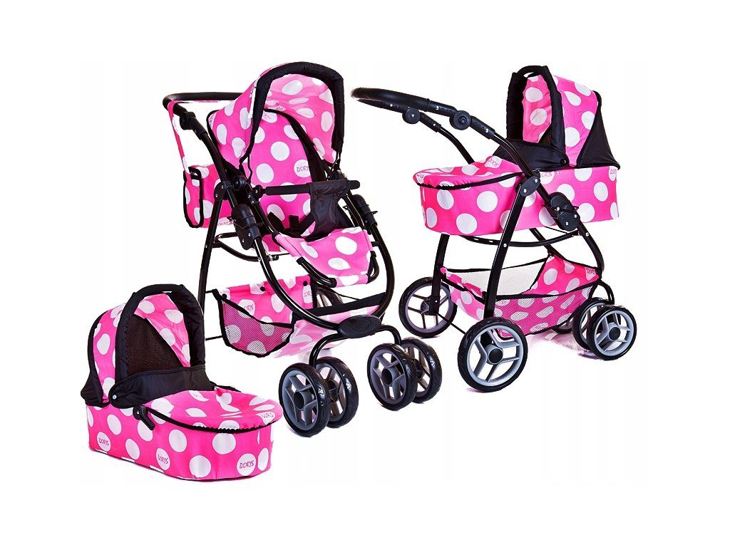 Kombinovaný kočárek pro panenky 3v1 v několika nádherných barevných provedeních. Má velmi lehkou stabilní konstrukci vyrobenou z hliníkových trubek, svrchní část je z impregnované bavlny. Lze ji jednoduše sejmout a kdykoliv vyprat. Rukojeť kočárku je nastavitelná a obalená pěnou. Uvnitř kočárku je korbička sloužící k snadnému přenášení panenky. Před automatickým složením chrání dítě blokace. Panenka je ve sportovní verzi proti vypadnutí zabezpečena bezpečnostním pásem. Jednoduchá změna z hluboké na sportovní verzi.
