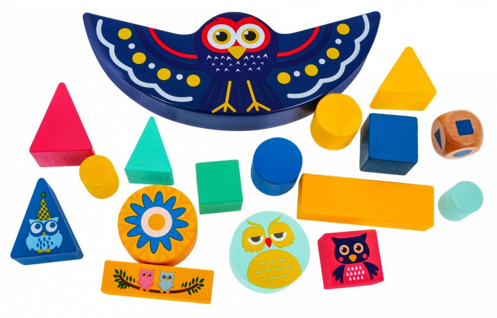 Dětská hra balancující sova je určena pro děti od 3 let. Tato hračka rozvíjí trpělivost, koncentraci, logické myšlení, manuální zručnost a také procvičuje koordinaci ruka-oko. Je vyrobena ze dřeva a natřena bezpečnými, netoxickými barvami v živých barvách, které přitahují pozornost dítěte a podporují hru. Hra spočívá v rozmístění dřevěných prvků na balanční základnu ve tvaru sovy. Soutěžící hodí kostkou a poté je podle vylosovaných prvků položí na stojan. Vyhrává ten, komu se podaří umístit na základnu nejvíce prvků a ty se udrží na základně.