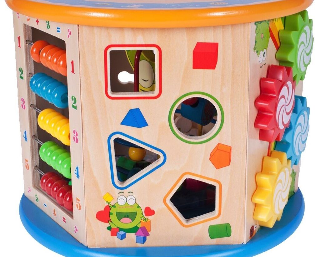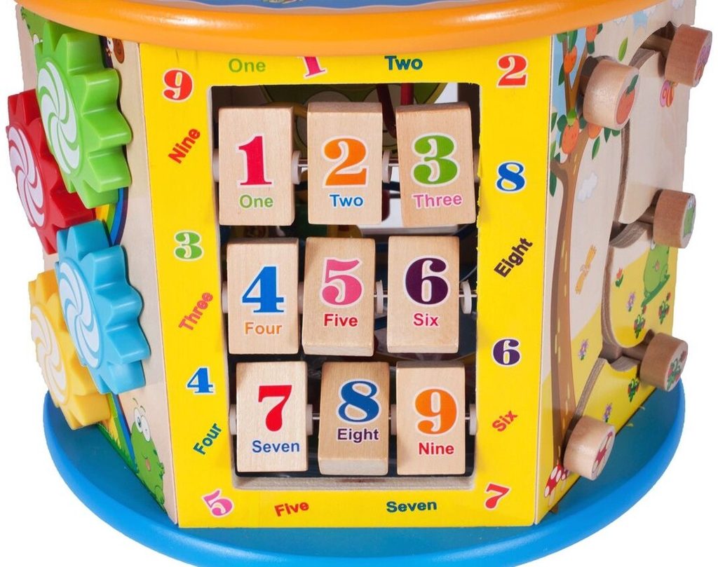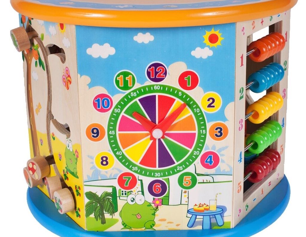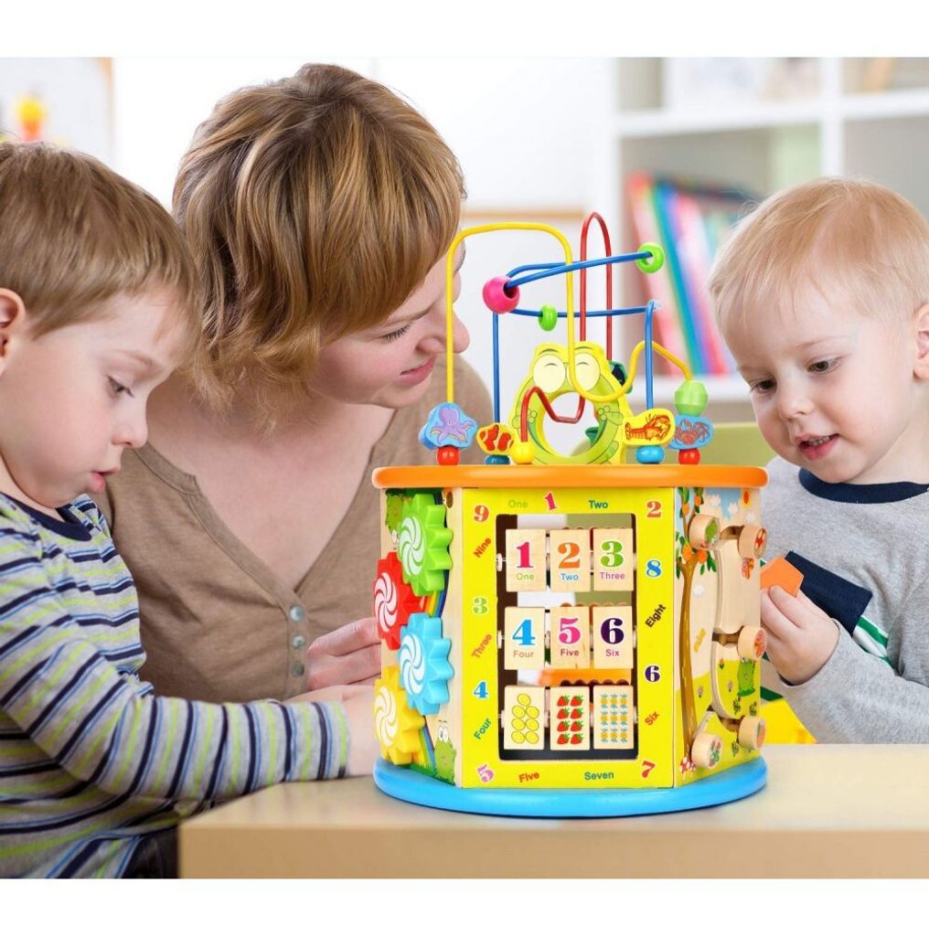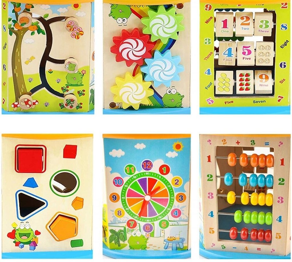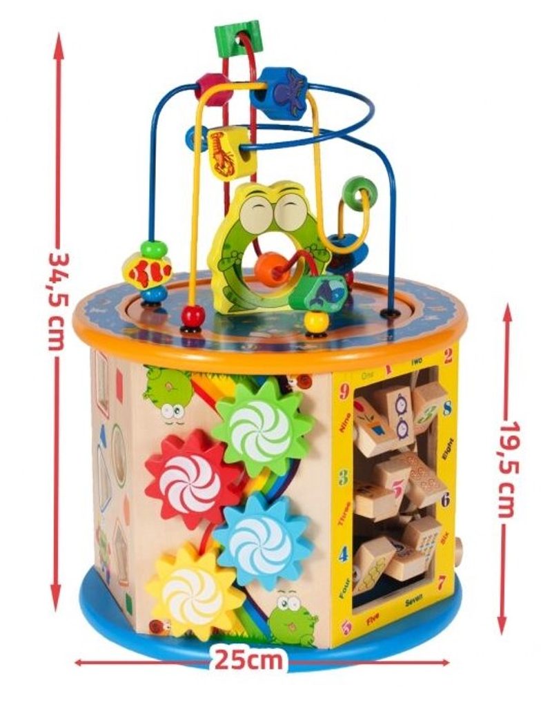 Dřevěná edukační kostka Activity Cube 8v1. V horní části umístěna kovová konstrukce - labyrint s korálky a dřevěnými zvířátky, které se mohou libovolně přesouvat. Na jedné boční stěně jsou umístěny prohazovací otvory, na další pohyblivá ozubená kolečka vydávající mechanický zvuk. Stěna s otočnými čísly slouží pro nauku prvních anglických slovíček a počítání. Hodiny naučí dítě rozpoznávat čas. Součástí balení jsou 4 ks dřevěných barevných kostek, figurky a hrací kostka. Vnitřní prostor může sloužit pro úschovu hraček. Kostka je ideální hračkou pro rozvoj dětské motoriky, hmatu, zraku a logického myšlení. Hračka je určena pro děti od 18 měsíců věku.
