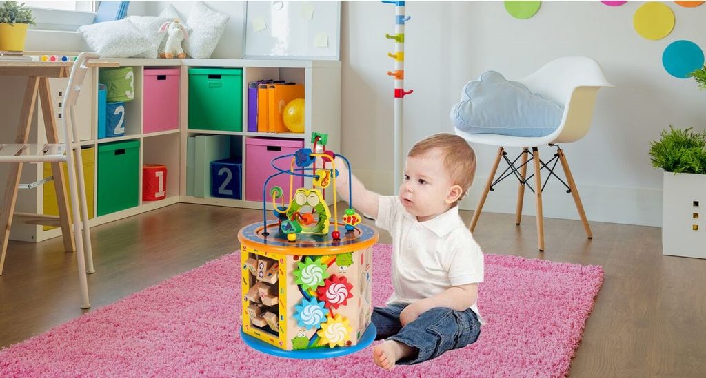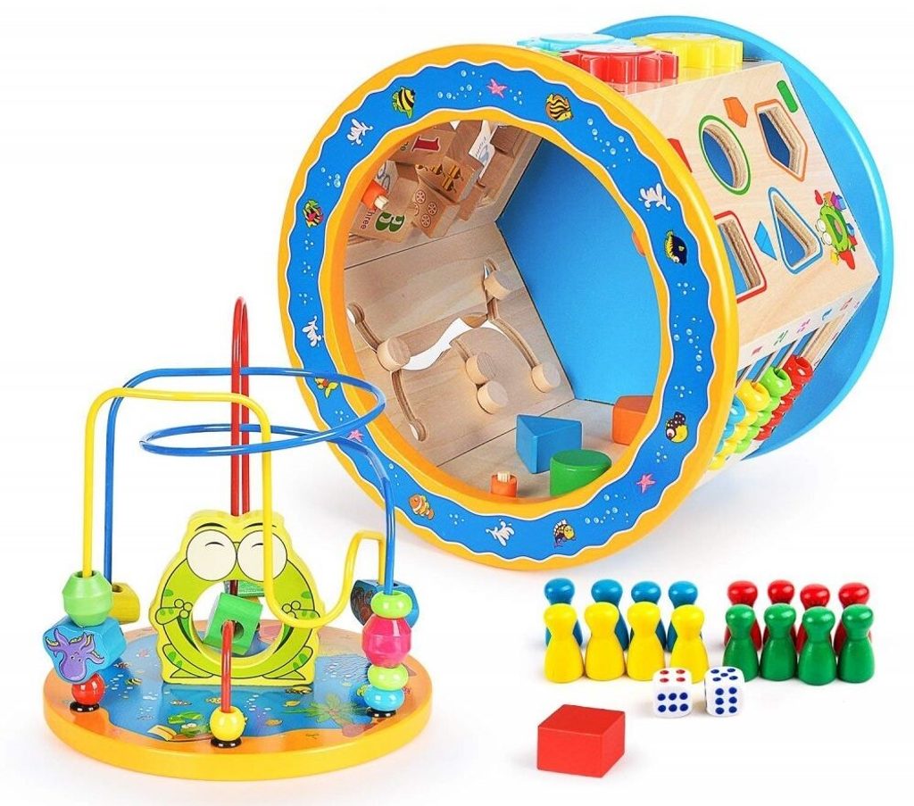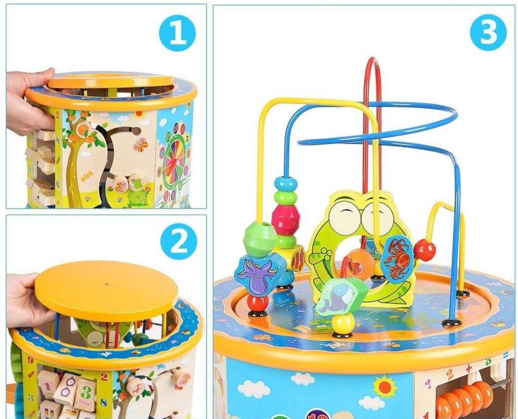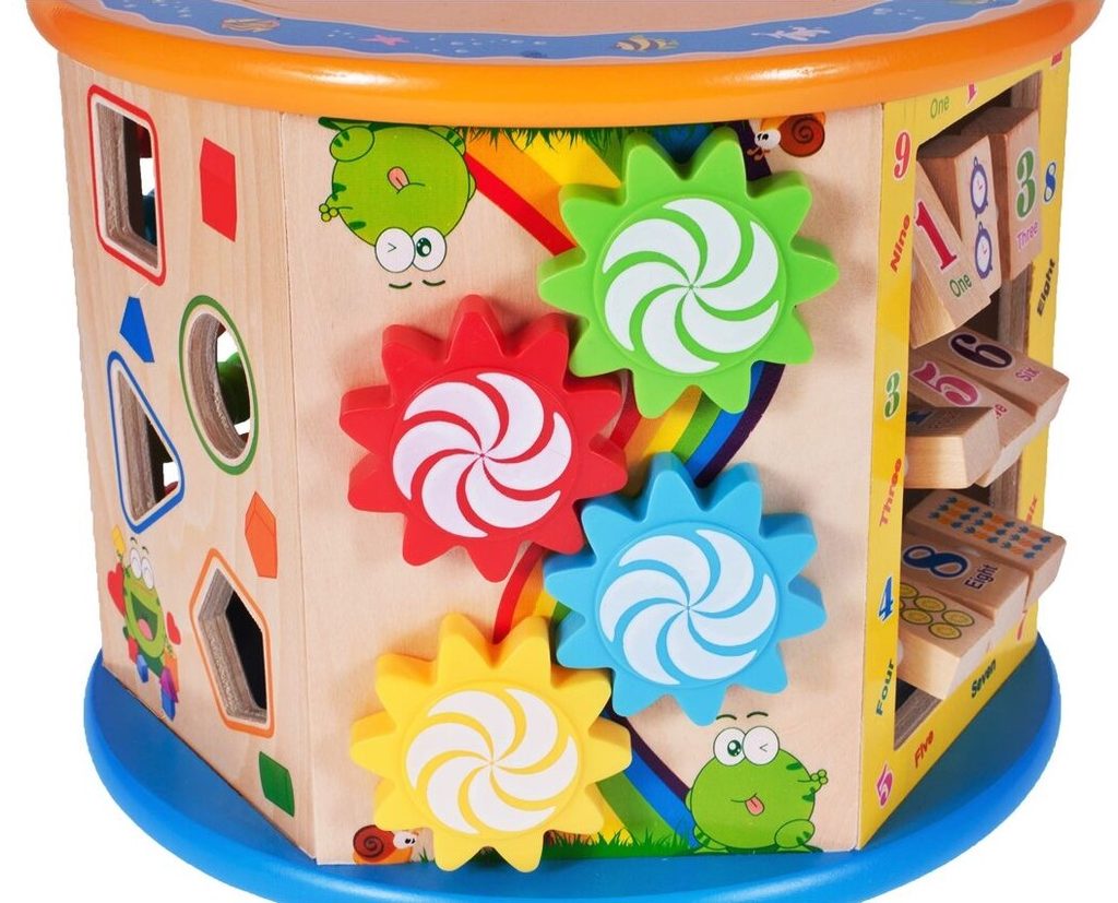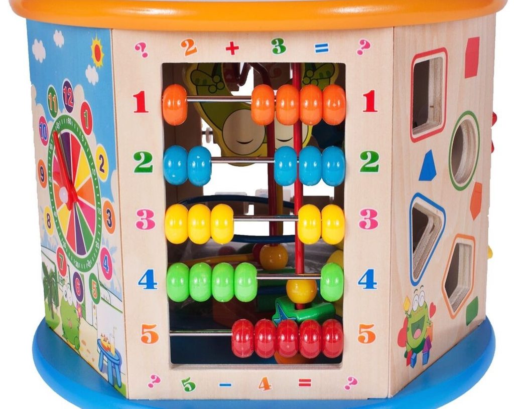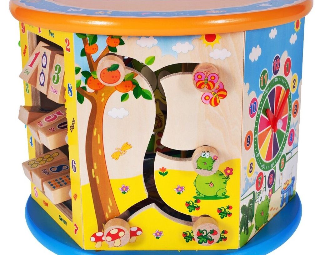 Dřevěná edukační kostka Activity Cube 8v1. V horní části umístěna kovová konstrukce - labyrint s korálky a dřevěnými zvířátky, které se mohou libovolně přesouvat. Na jedné boční stěně jsou umístěny prohazovací otvory, na další pohyblivá ozubená kolečka vydávající mechanický zvuk. Stěna s otočnými čísly slouží pro nauku prvních anglických slovíček a počítání. Hodiny naučí dítě rozpoznávat čas. Součástí balení jsou 4 ks dřevěných barevných kostek, figurky a hrací kostka. Vnitřní prostor může sloužit pro úschovu hraček. Kostka je ideální hračkou pro rozvoj dětské motoriky, hmatu, zraku a logického myšlení. Hračka je určena pro děti od 18 měsíců věku.