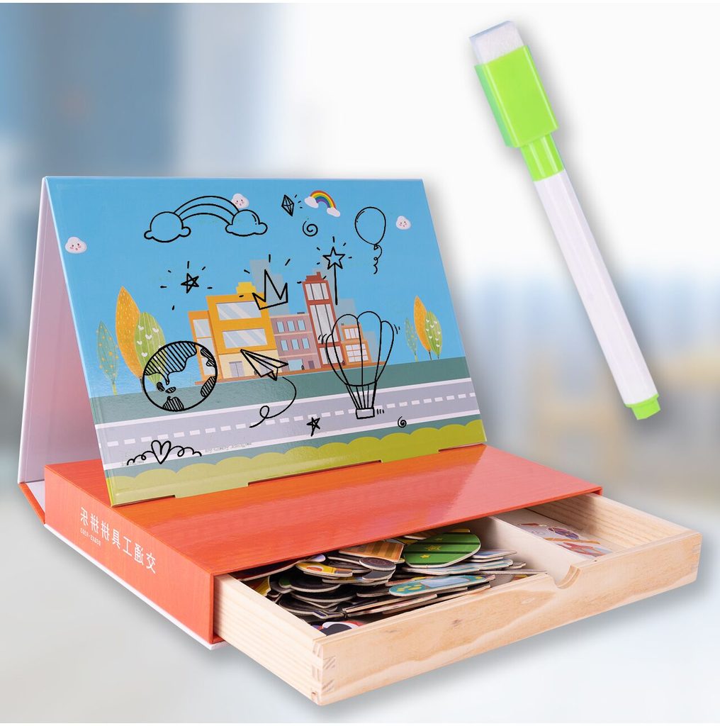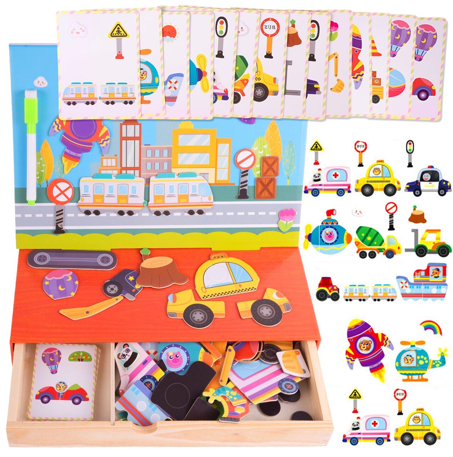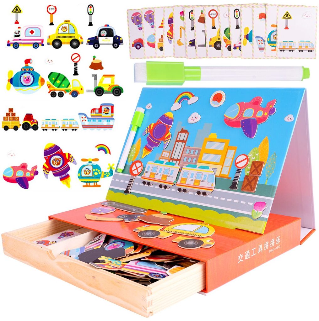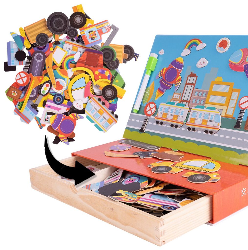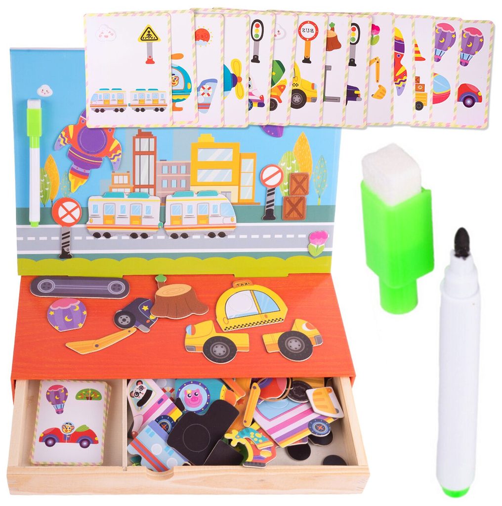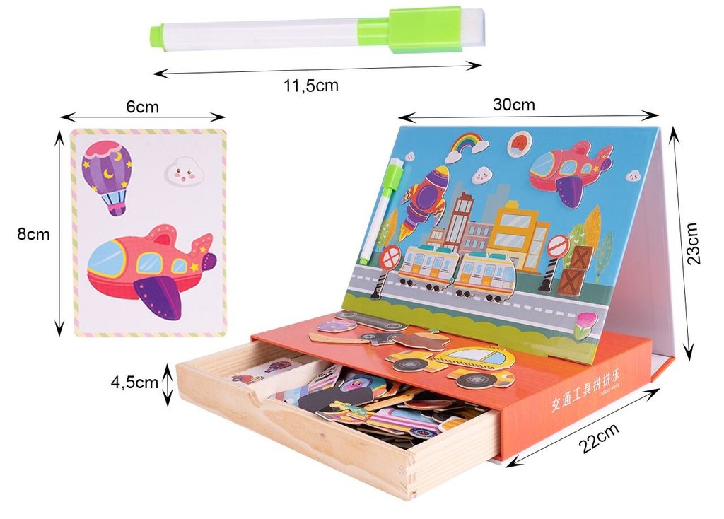 Dřevěná magnetická ukládačka Dopravní prostředky podporuje u nejmenších dětí představivost, rozpoznávání barev a zlepšuje motoriku. Součástí je celkem 80 různých magnetek a 12 kartiček se vzory. Dítě tak může vytvářet situace, které se mu budou právě líbit.Součástí sady je také mazatelný fix, který lze uchytit pomocí magnetu na tabulku. Vše je vyrobeno ze dřeva a plastu bez ostrých hran. Hračka je určena pro děti od 36 měsíců věku.