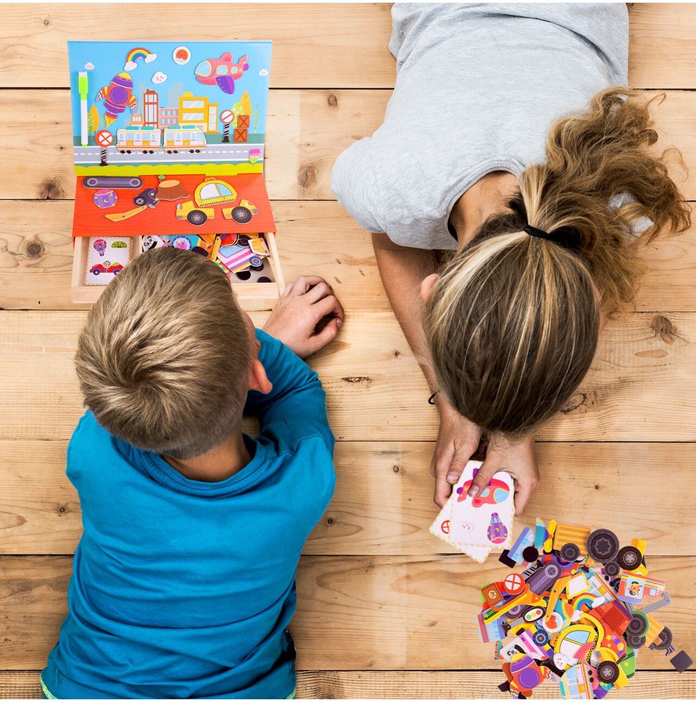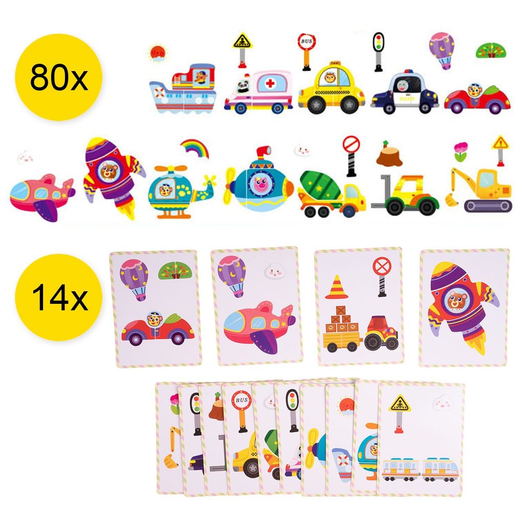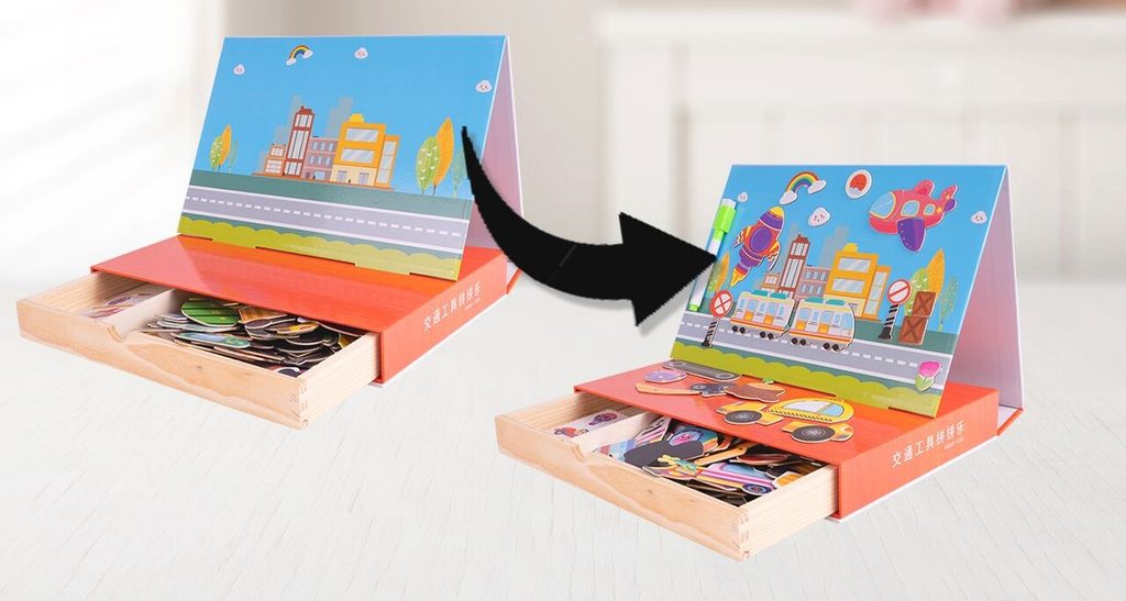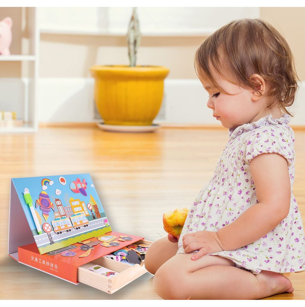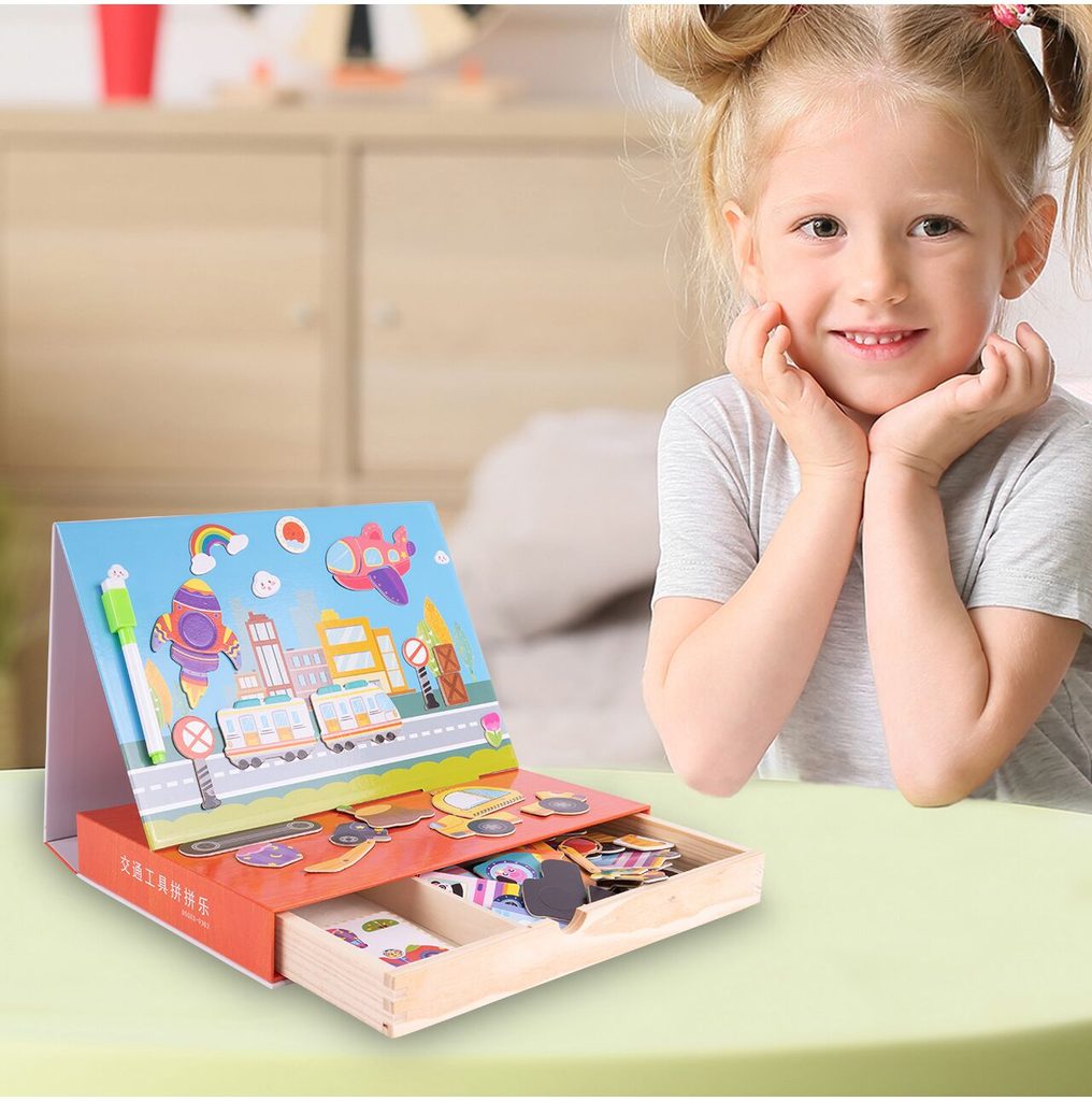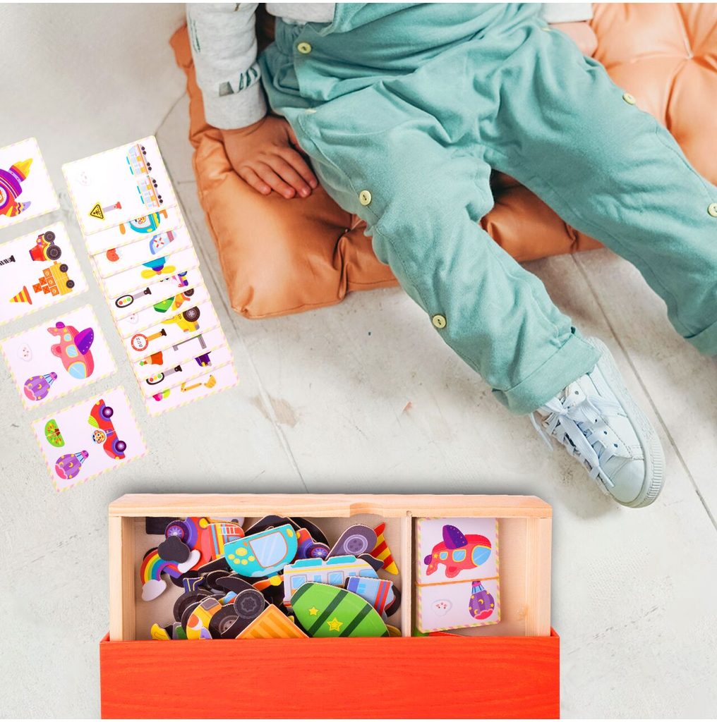 Dřevěná magnetická ukládačka Dopravní prostředky podporuje u nejmenších dětí představivost, rozpoznávání barev a zlepšuje motoriku. Součástí je celkem 80 různých magnetek a 12 kartiček se vzory. Dítě tak může vytvářet situace, které se mu budou právě líbit.Součástí sady je také mazatelný fix, který lze uchytit pomocí magnetu na tabulku. Vše je vyrobeno ze dřeva a plastu bez ostrých hran. Hračka je určena pro děti od 36 měsíců věku.