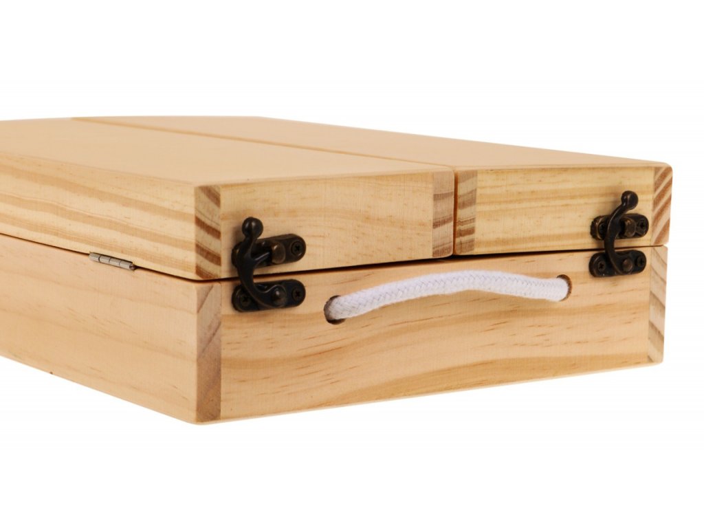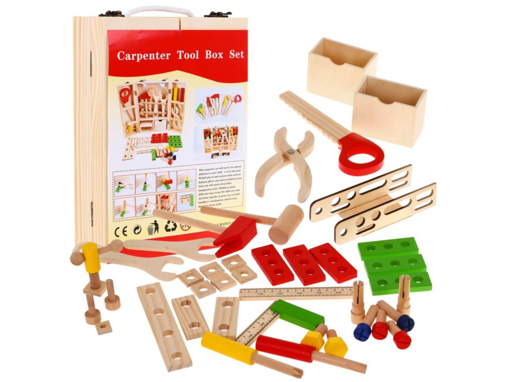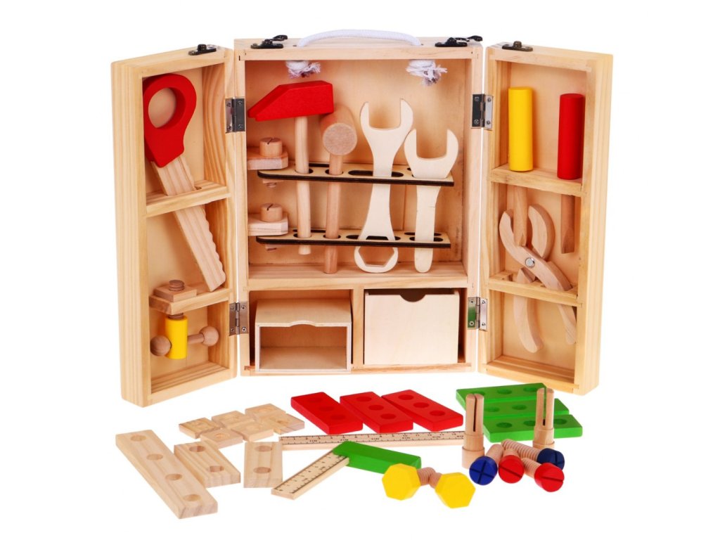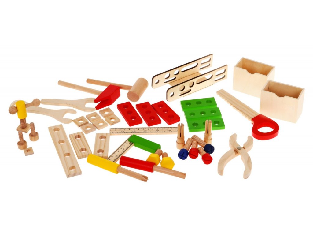 Sada dřevěného nářadí pro nejmenší kutily Wooden Toolbox. Sada obsahuje několik druhů nářadí jako je pilka, kladívko, klíč, šroubováky, pravítko a další. Vše doplňují konstrukční prvky se šrouby. Vše je uloženo v praktické dřevěné skříňce s horním úchytem pro snadné přenášení. Dítě tak může vše nosit sebou. Hračka je určena pro děti od 36 měsíců věku.